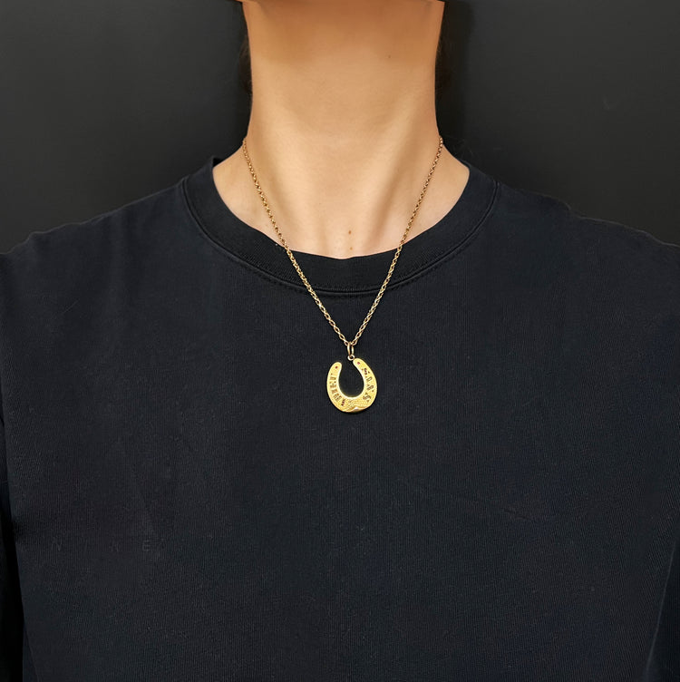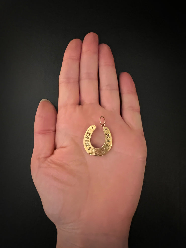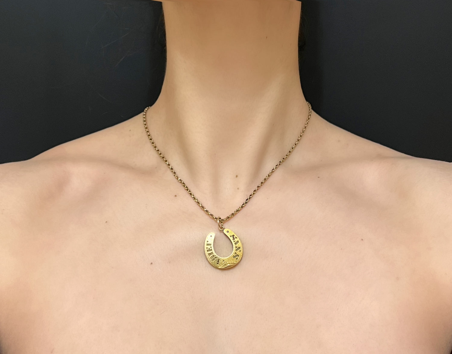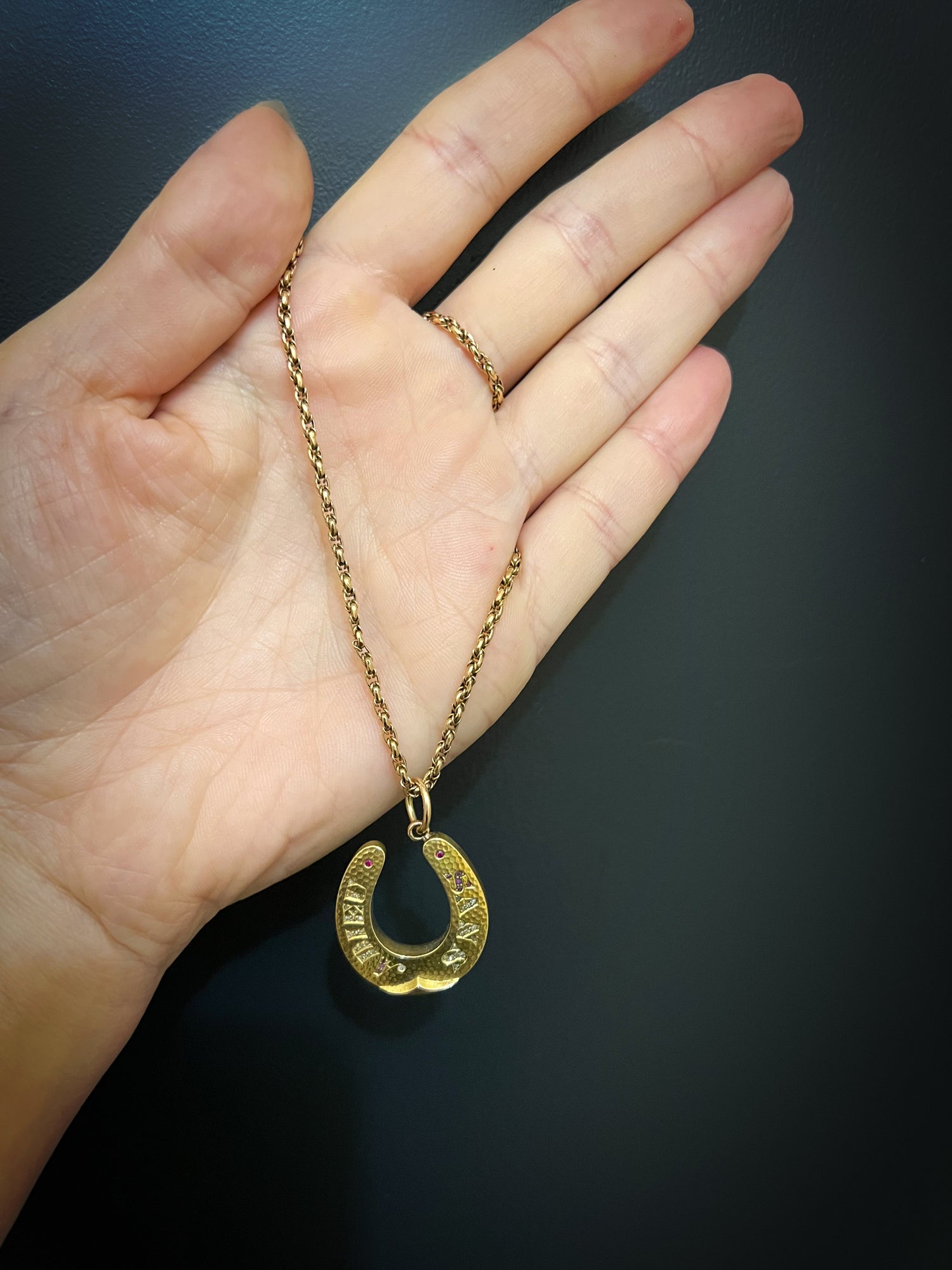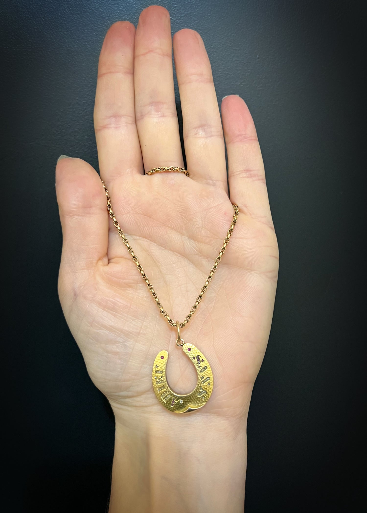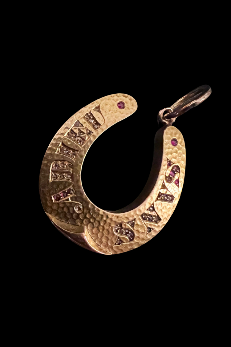 The most beautiful 15ct gold horseshoe pendant with the words ‘Sans Adieu’ written in tiny diamonds and rubies.