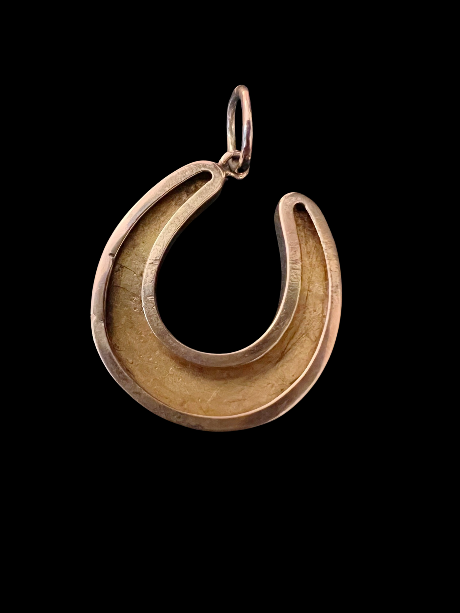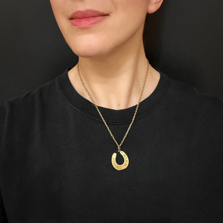 The horseshoe is made from hammered 15ct gold, the undulating surfaces catches the light wonderfully.