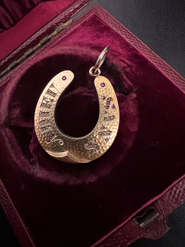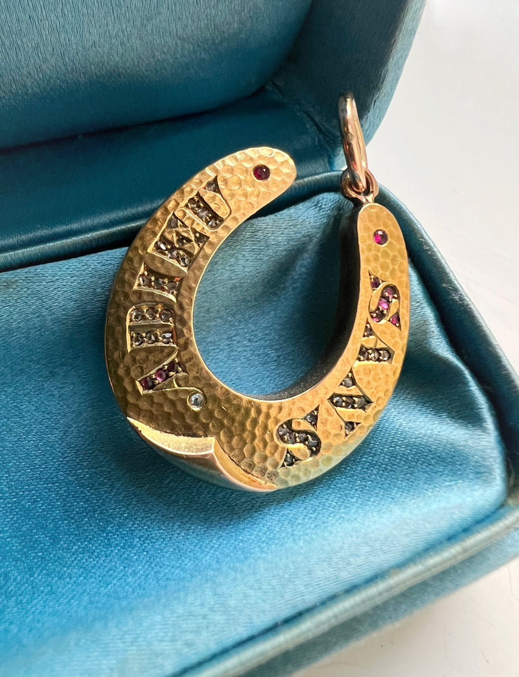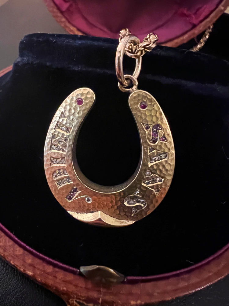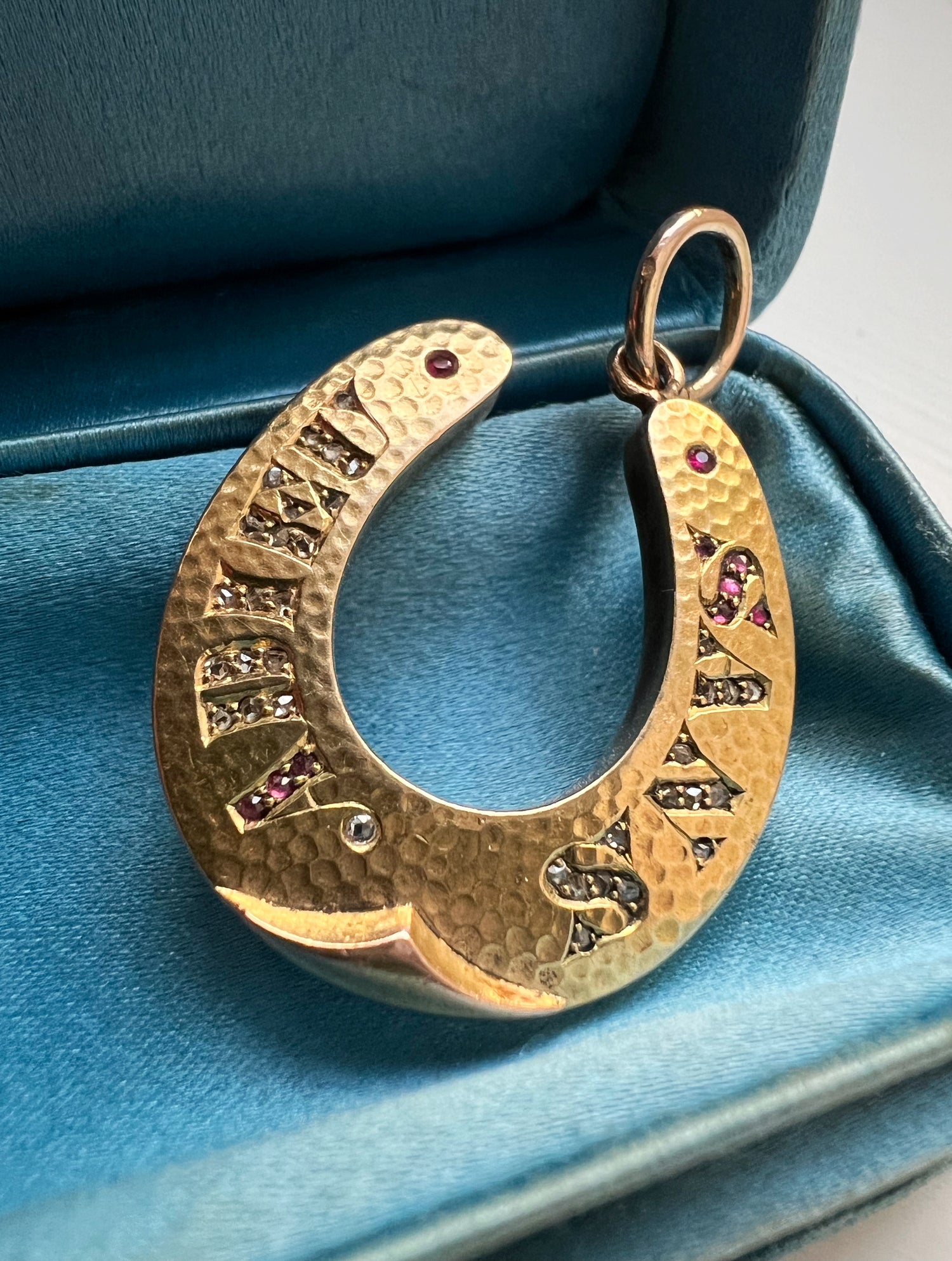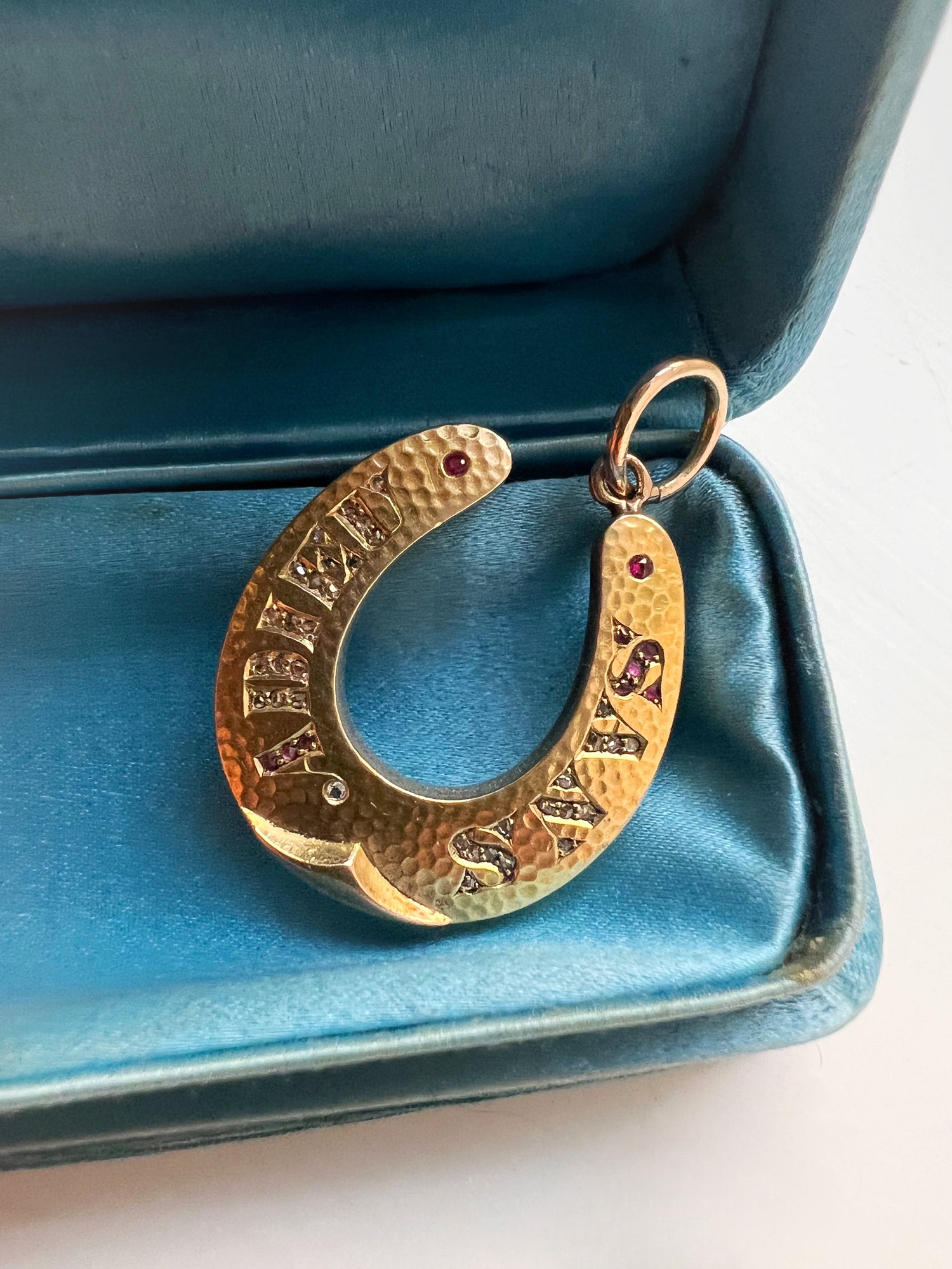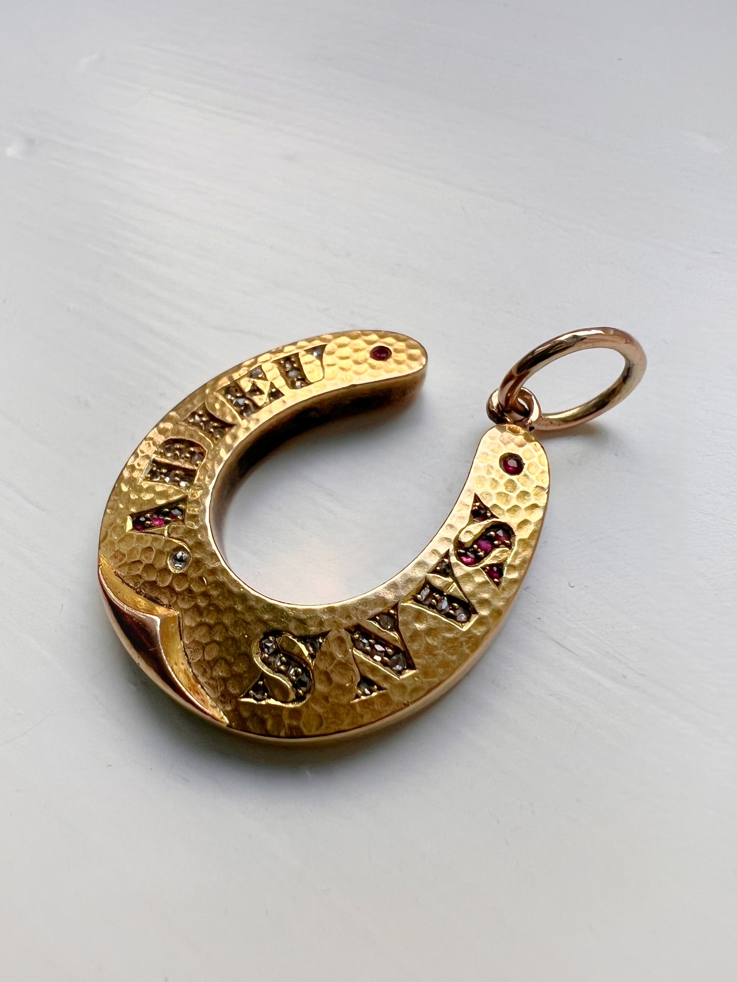 VICTORIAN DIAMOND & RUBY 15CT GOLD HORSESHOE PENDANT ‘SANS ADIEU’