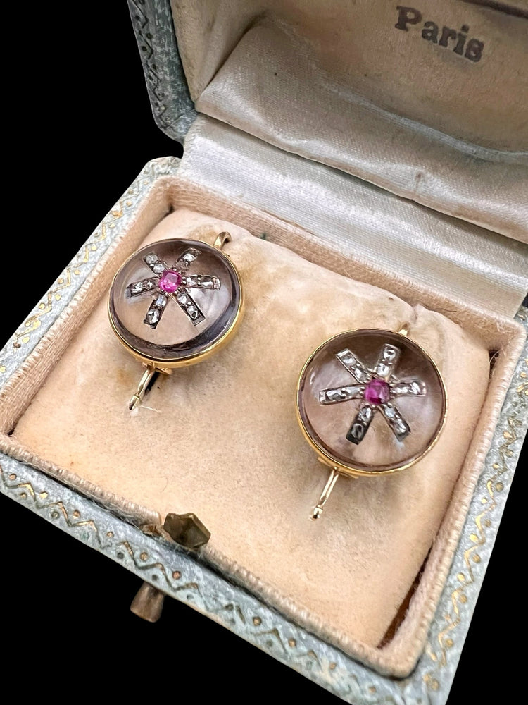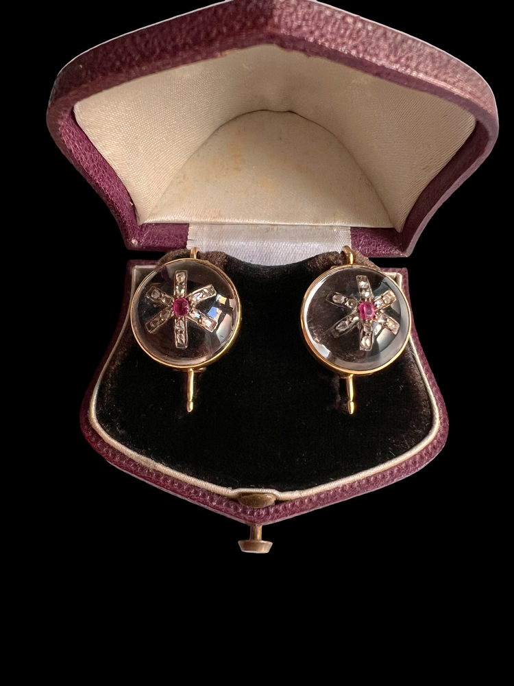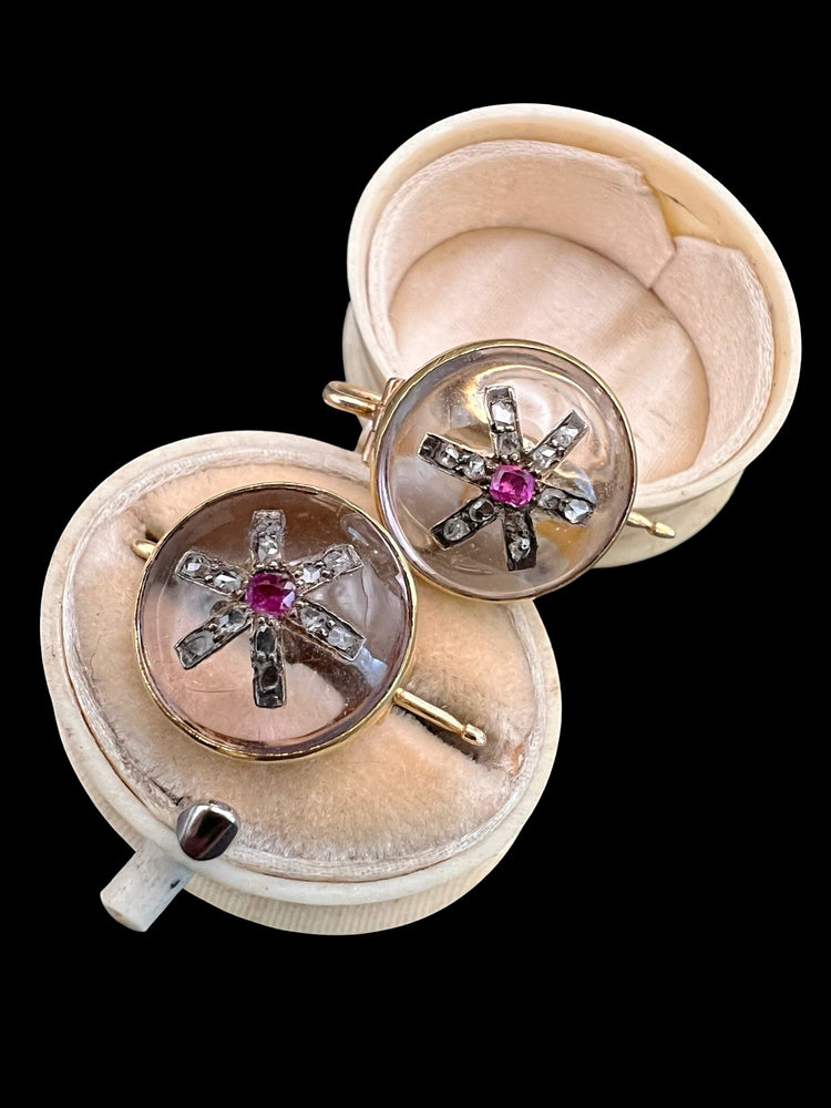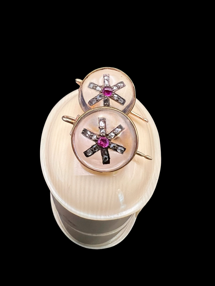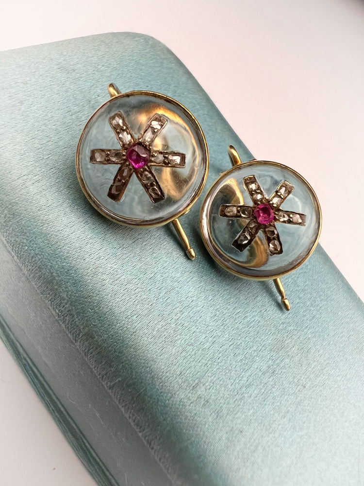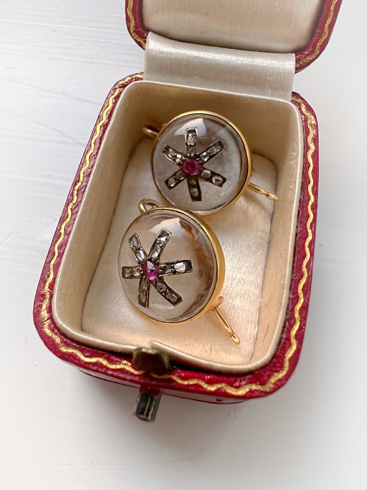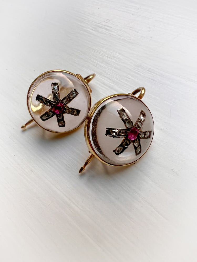VICTORIAN DIAMOND & RUBY STAR ROCK CRYSTAL EARRINGS