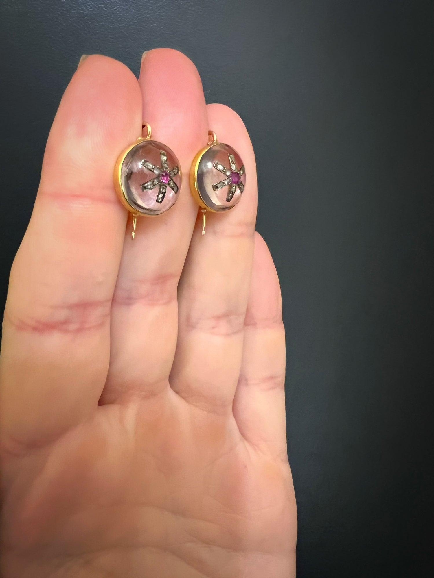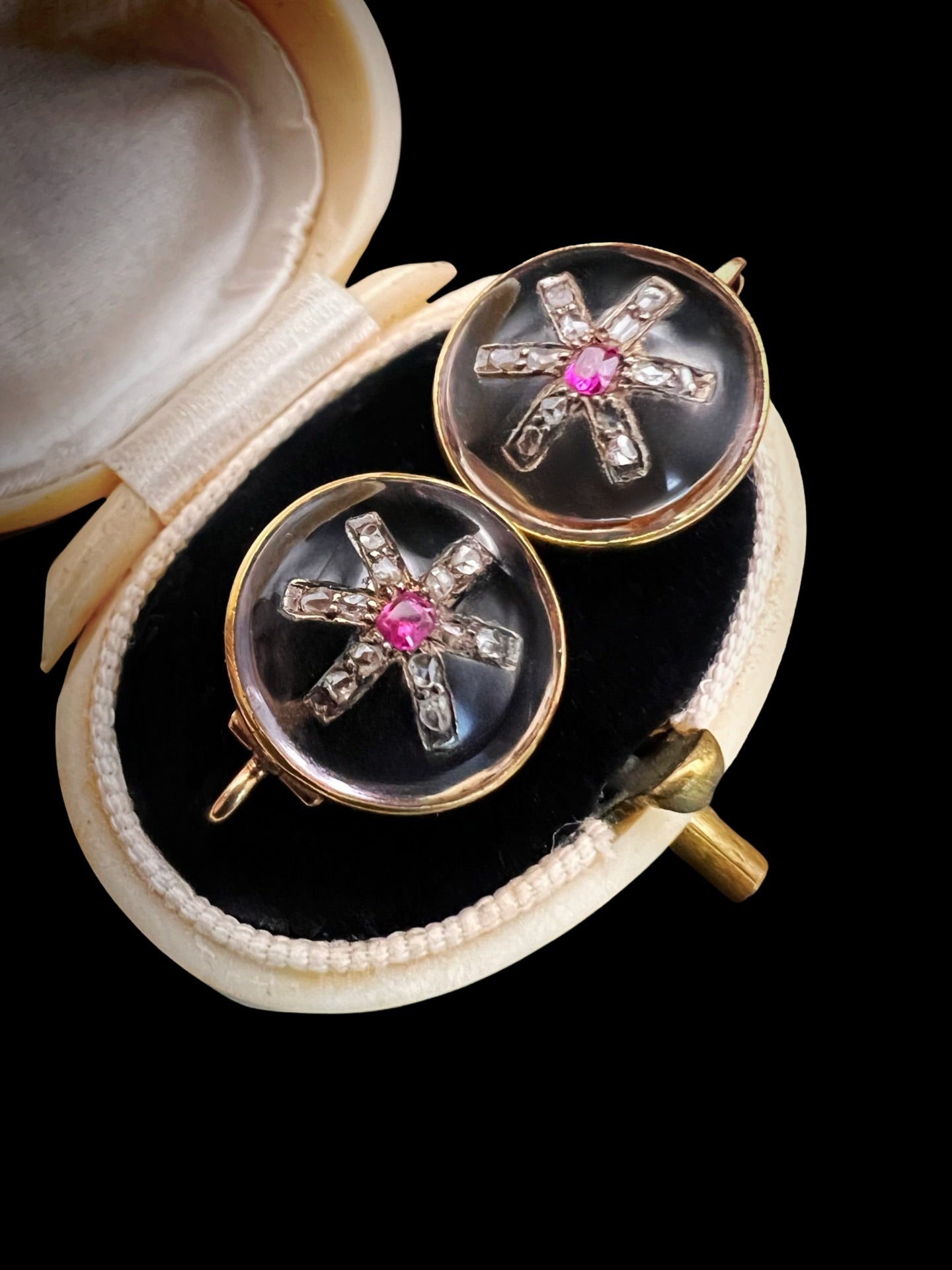 Each domed clear Rock Crystal is set with a rose cut diamond star with a central pinky red Ruby!
