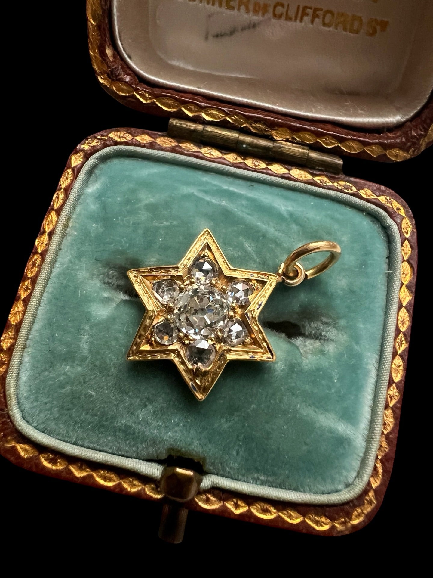The star is made of high carat gold, and set with a chunky central old cut diamond, and six smaller diamonds at each point.
