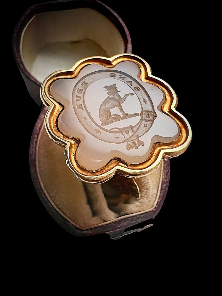 The eagle sits on a heavily chased scalloped mound, beneath which is a Chalcedony intaglio with a gorgeous scalloped edge.