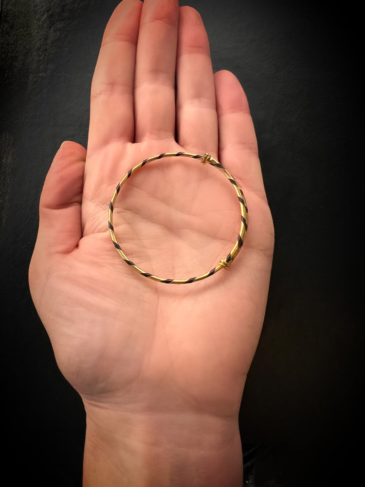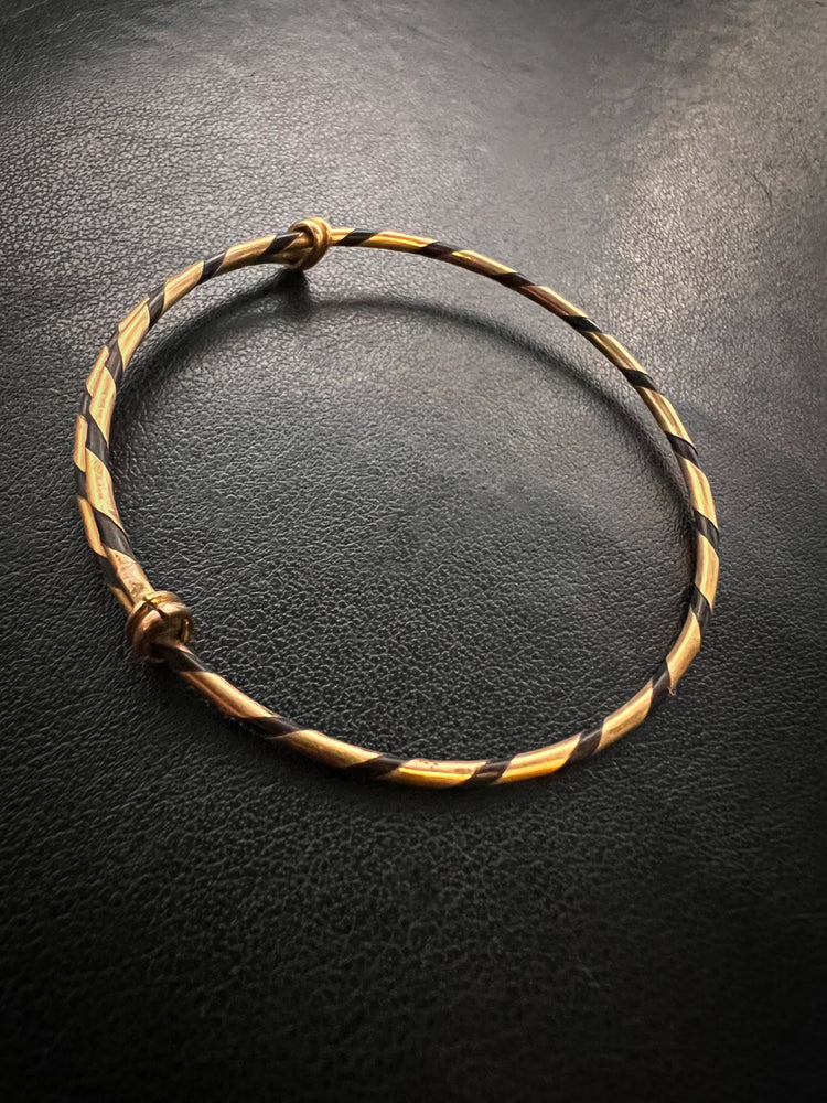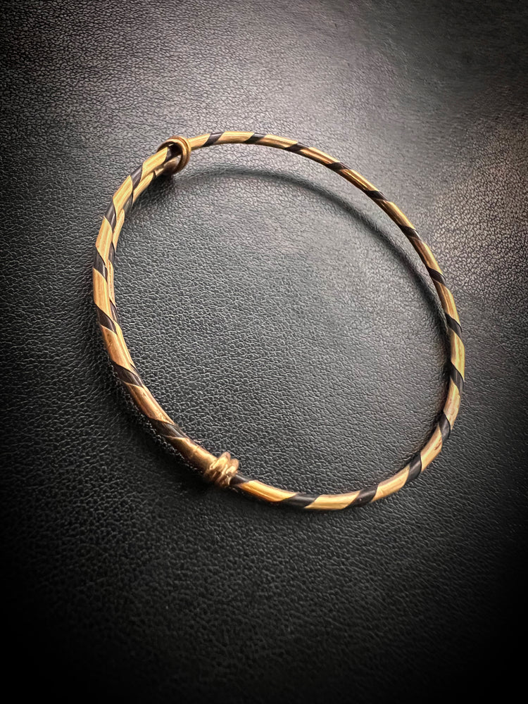 The bangle dates to around 1880/1890; these were often bought as souvenirs during the British Raj, when Western European adventurers started visiting India and would commission elephant hair jewellery as a souvenir of their safari experience.