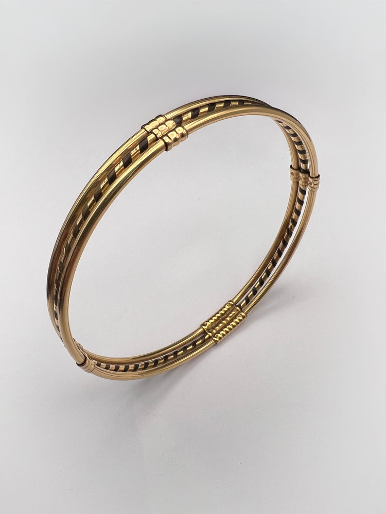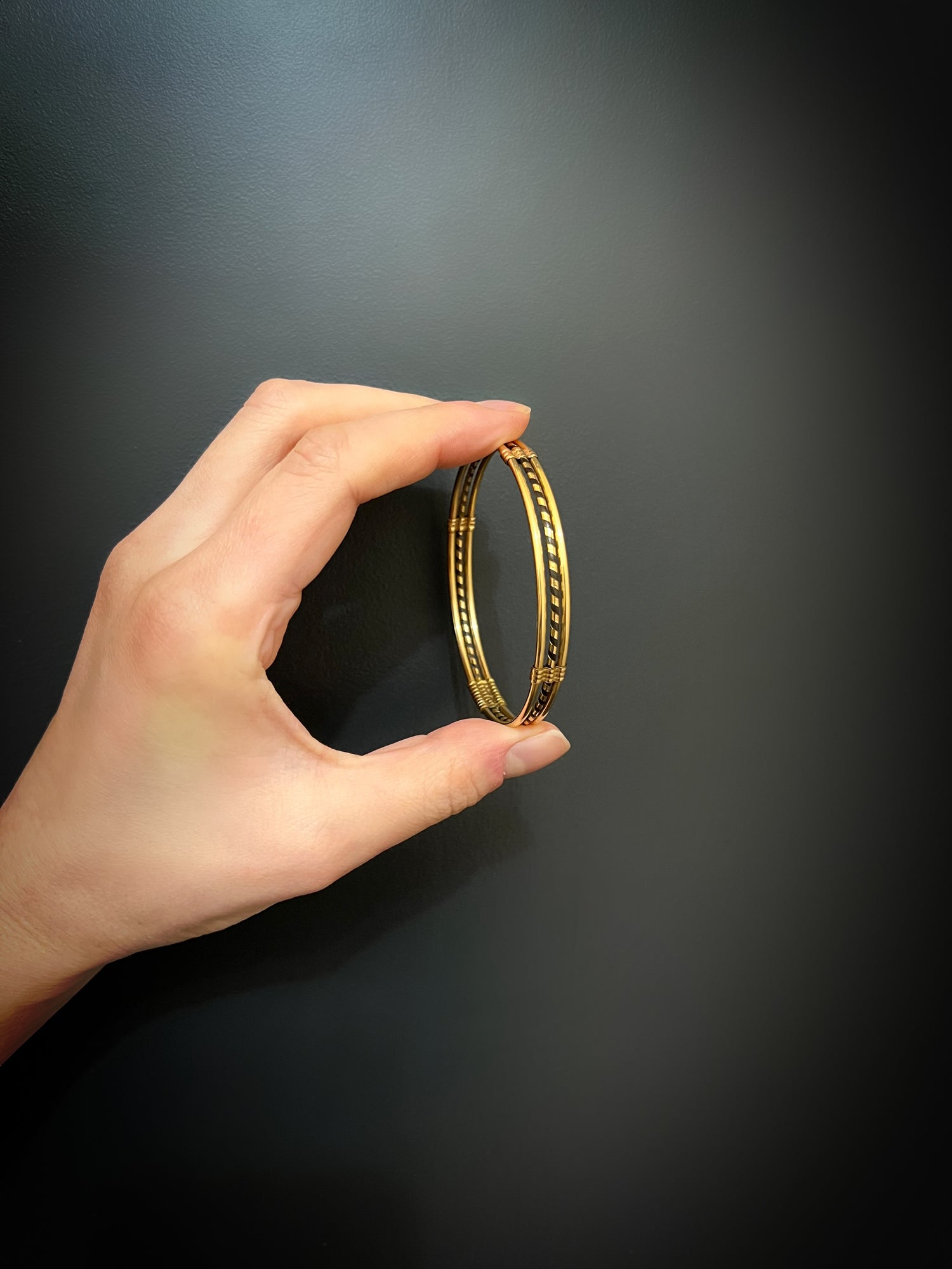 The central band is made of a single strand of Elephant hair coiled in a high carat gold strip.