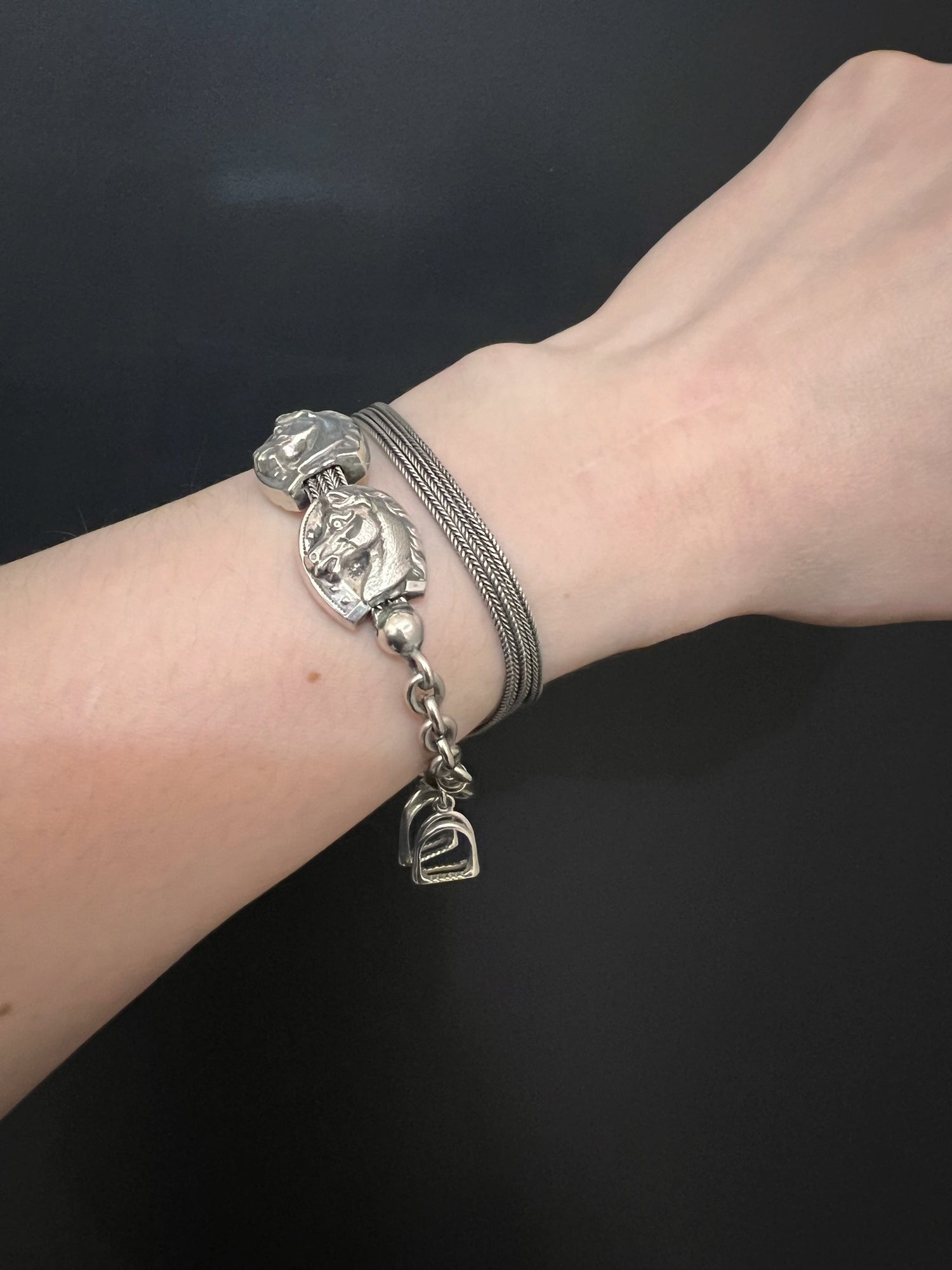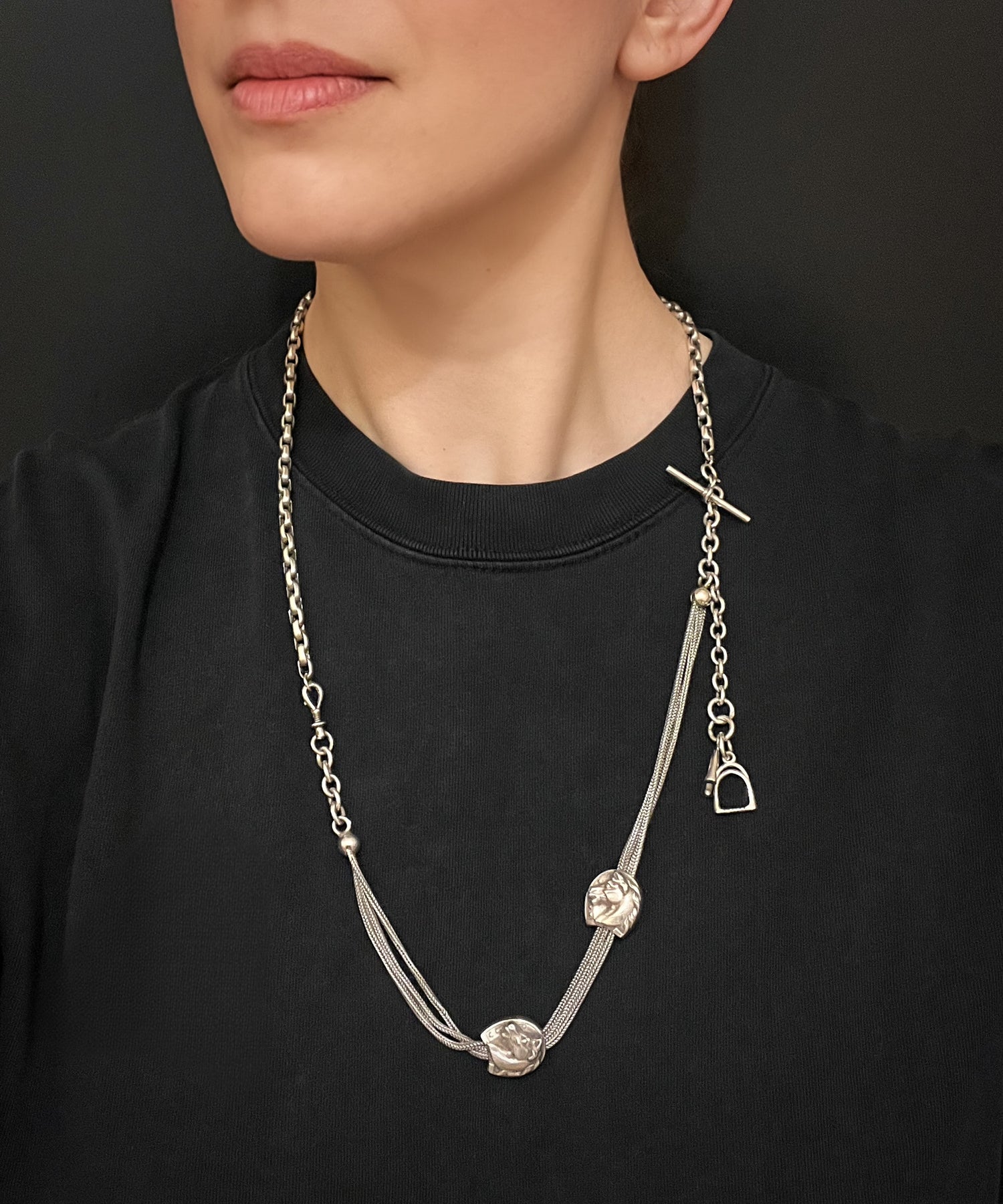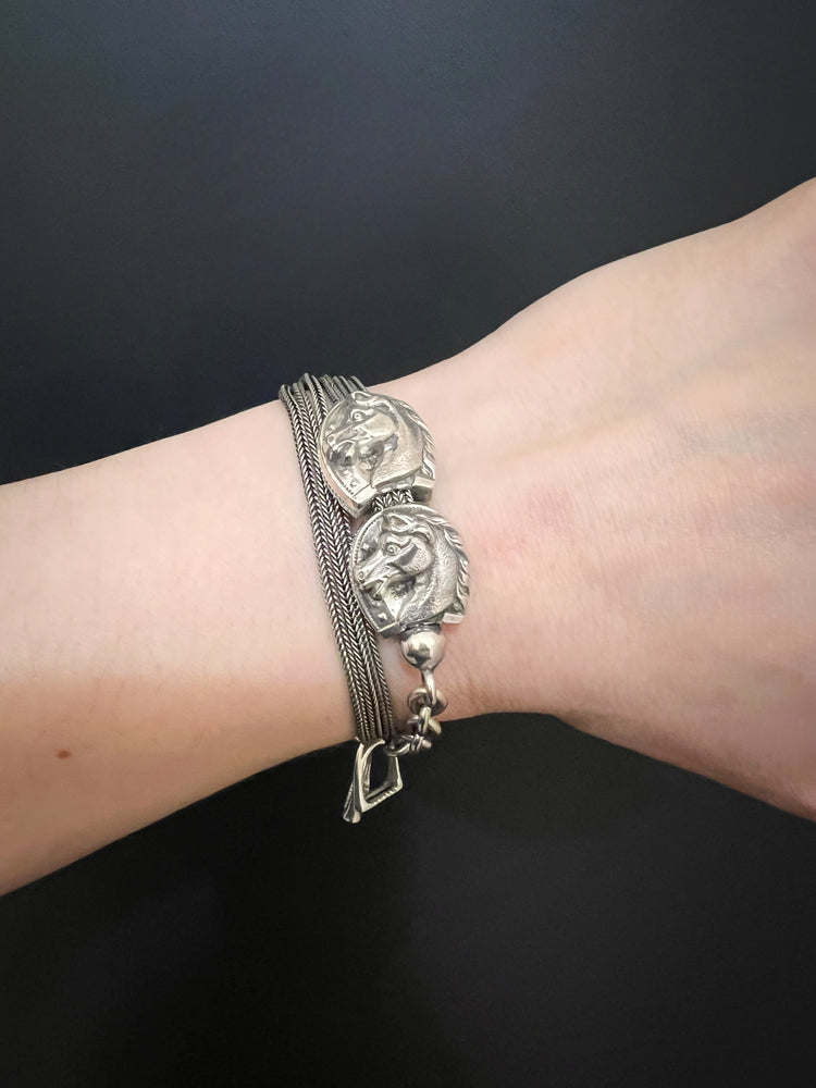 The albertina is made of multiple rows of foxtail chain, with two horse head sliders and silver ball finials, the chain is finished with a lovey chunky belcher either side, with T-bar and stirrup charms.
