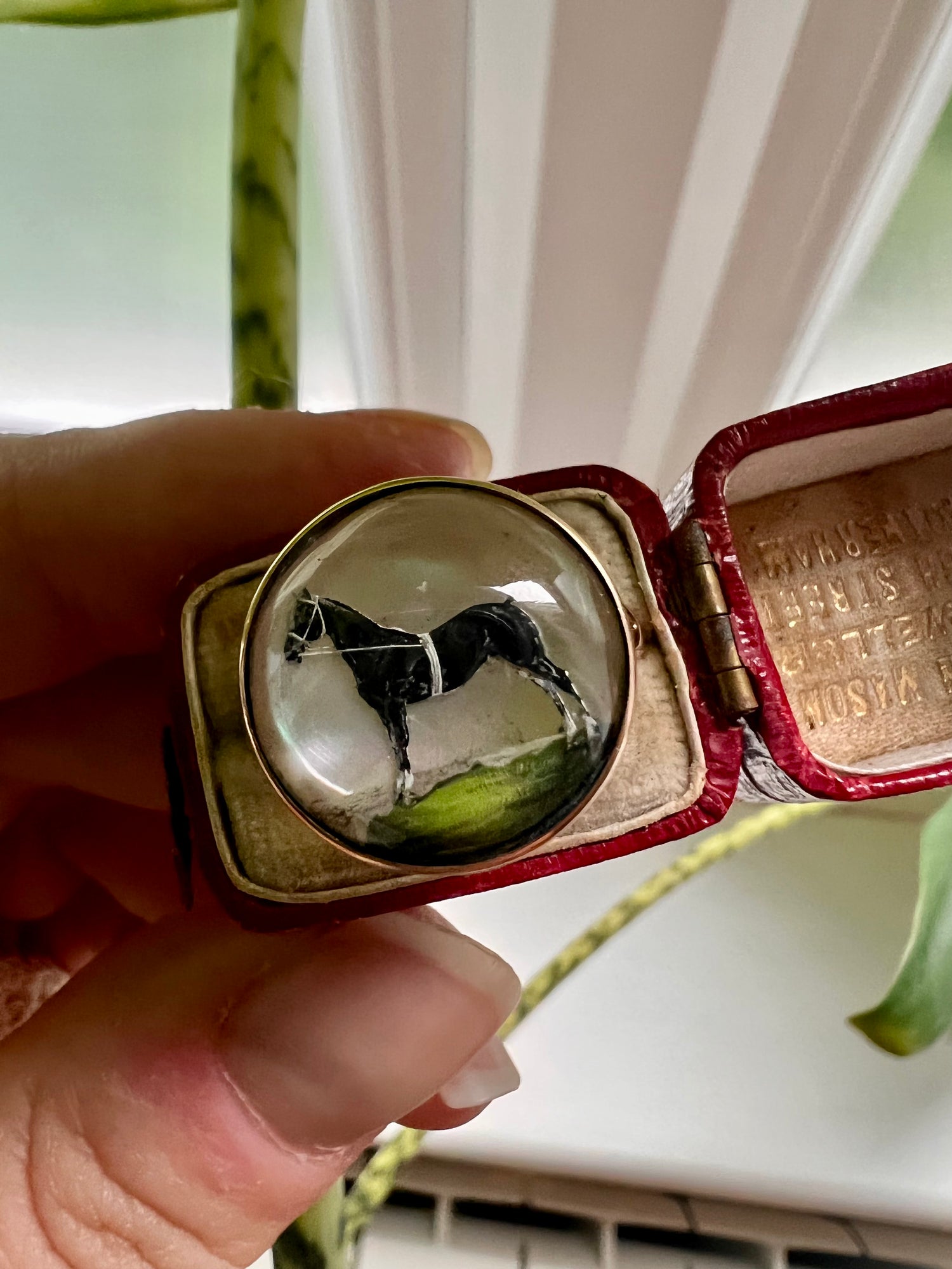 A beautiful Victorian Essex Crystal horse on mother of pearl backing and 9ct gold setting!