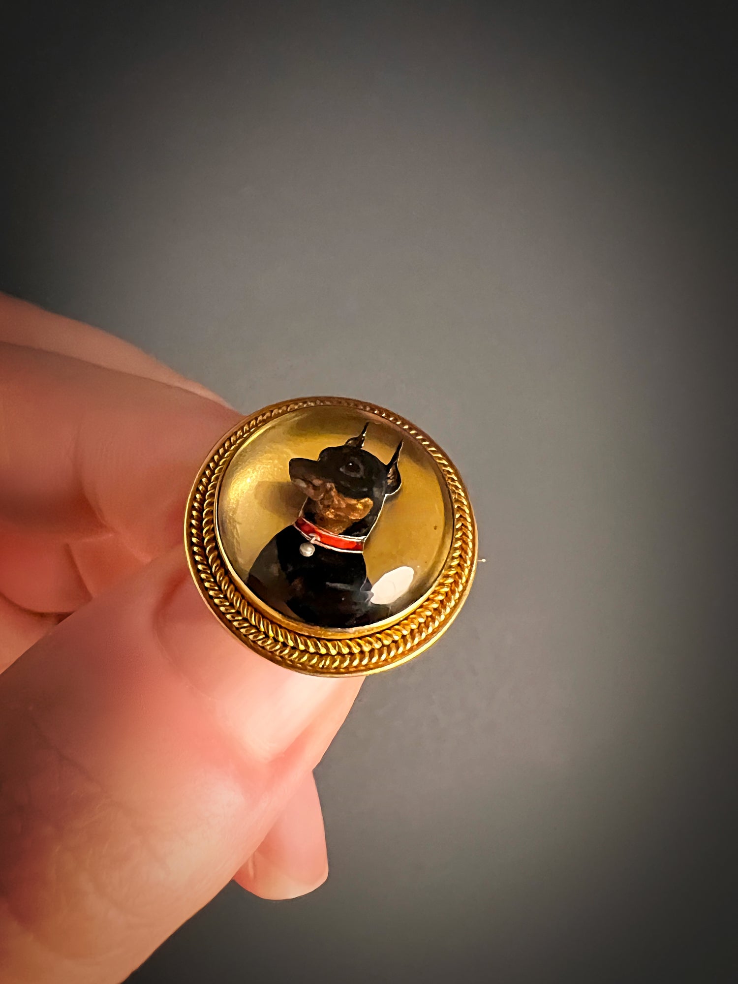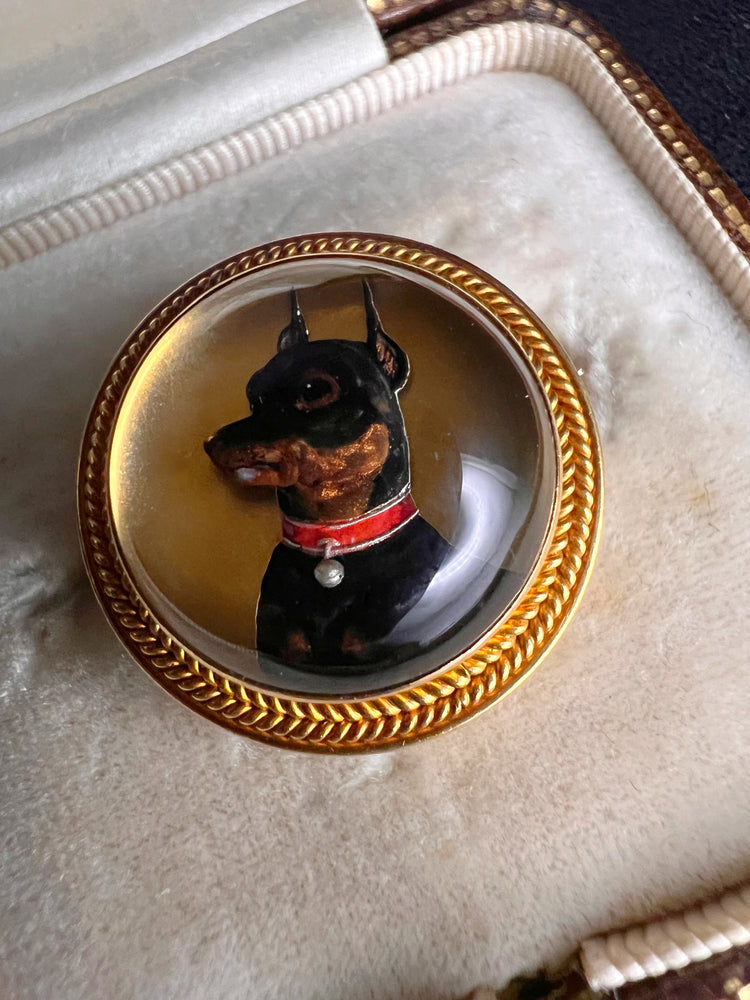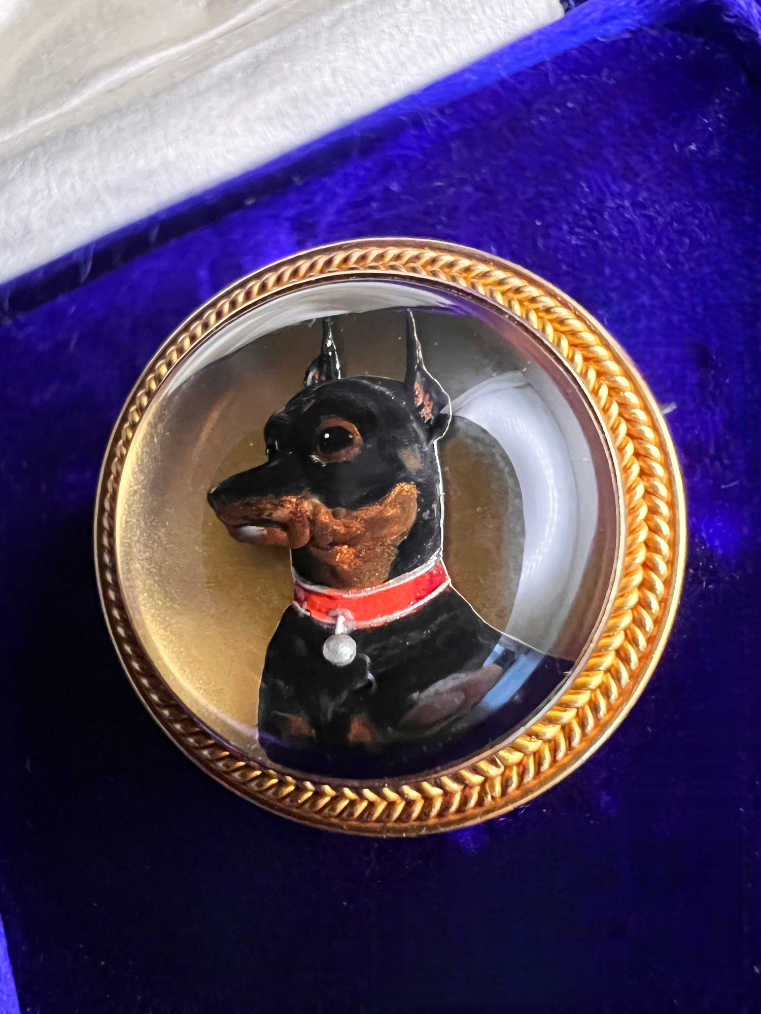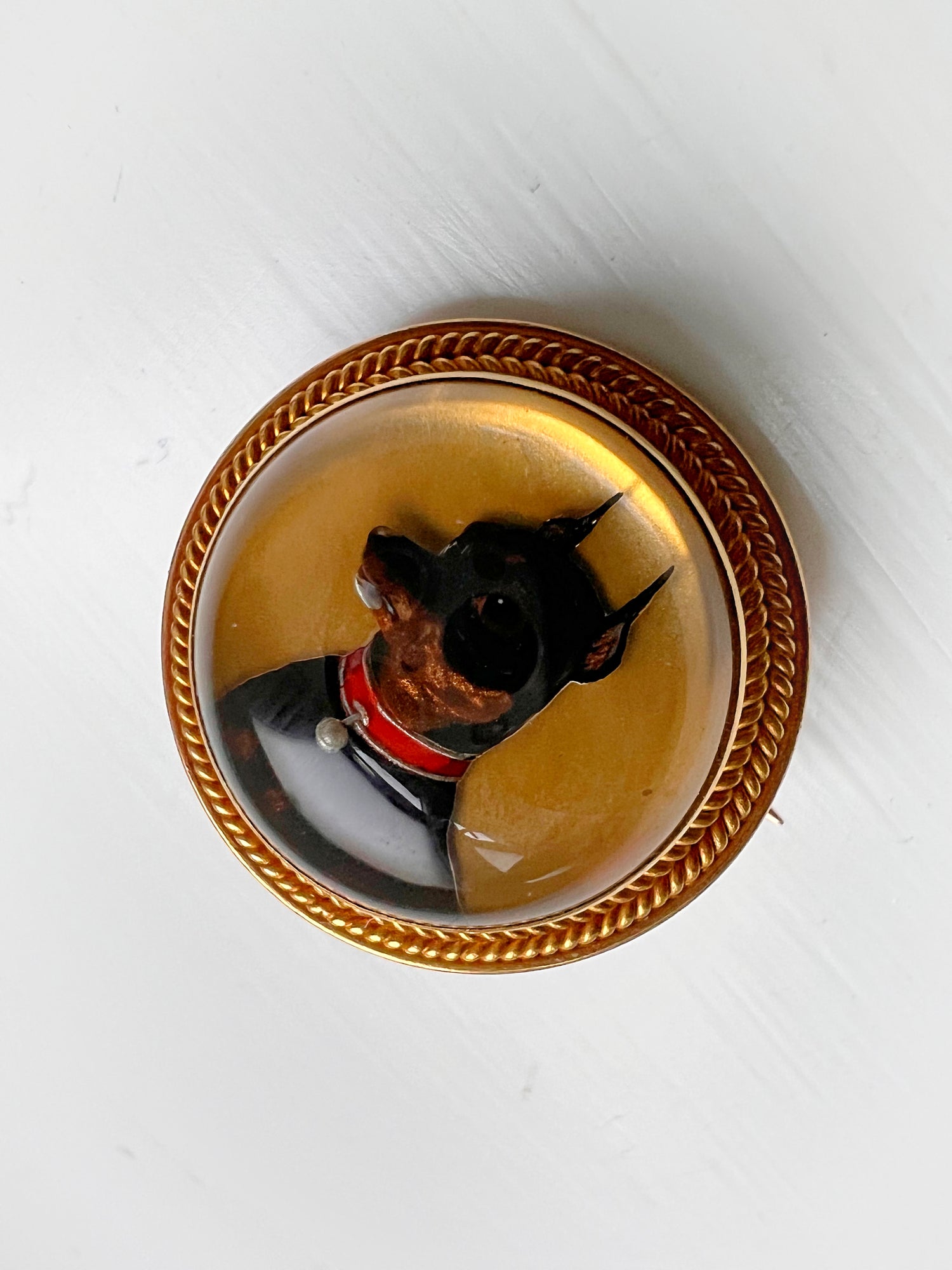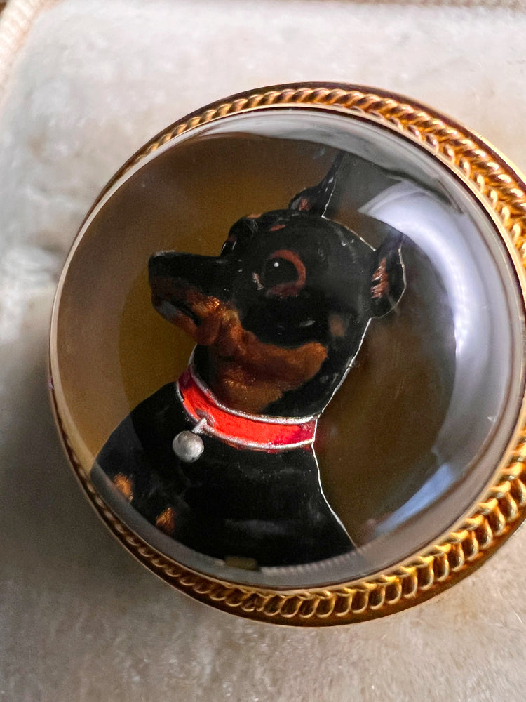 The reverse painting of the Pinscher dog is in excellent condition; he wears a red collar with a tiny silver bell, and his ears are alert!