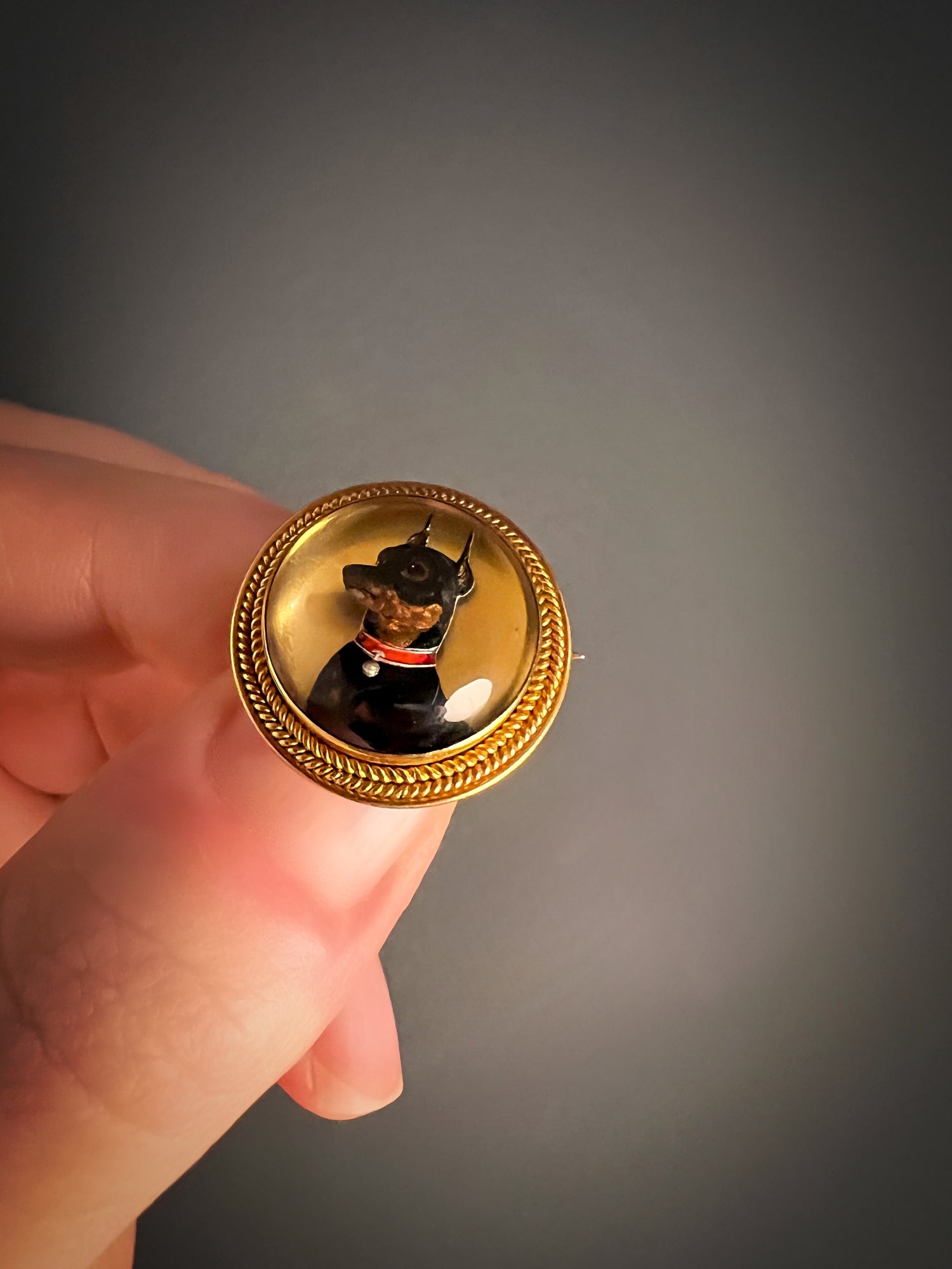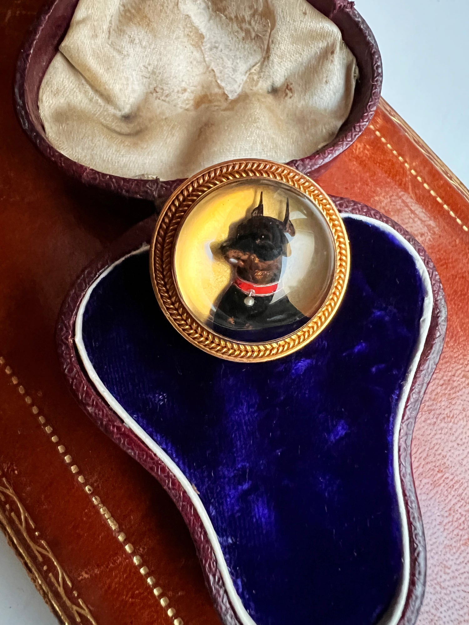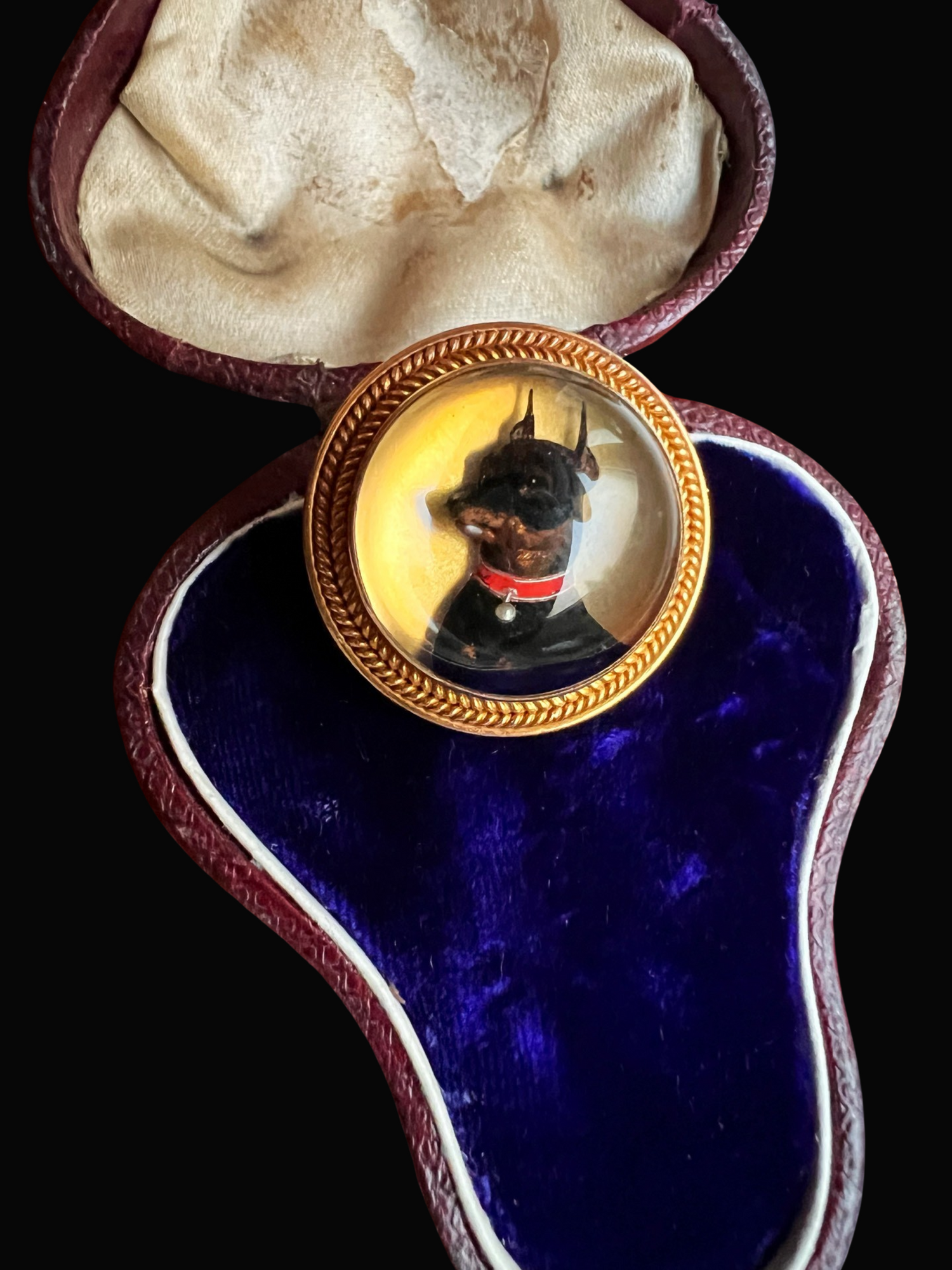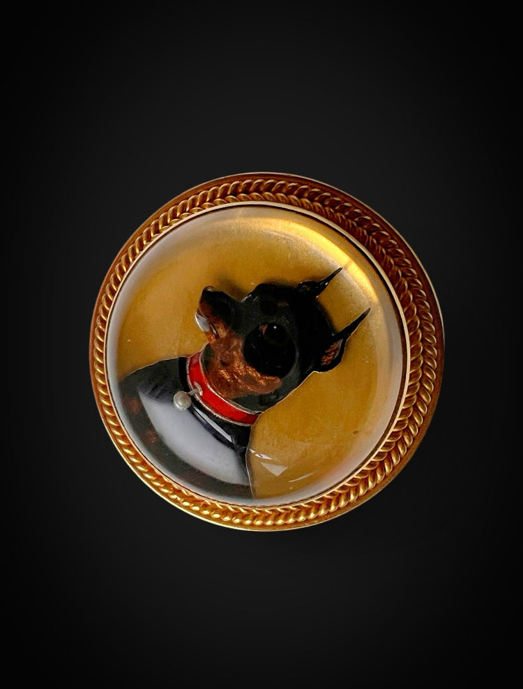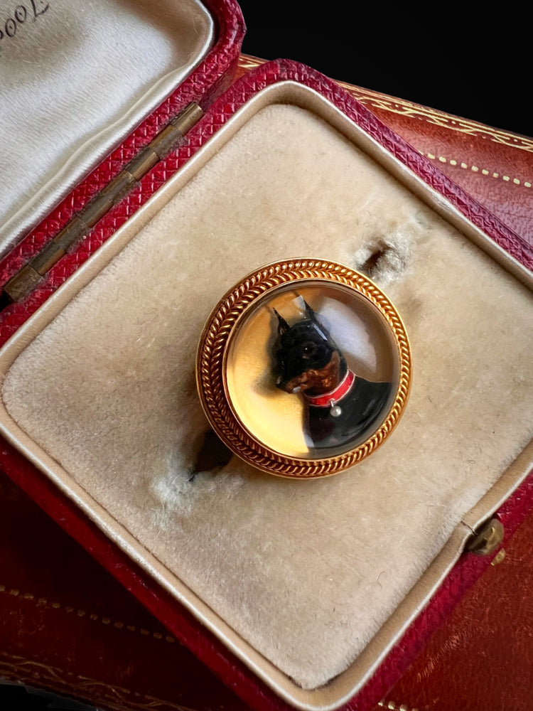 The reverse painting of the Pinscher dog is in excellent condition; he wears a red collar with a tiny silver bell, and his ears are alert!