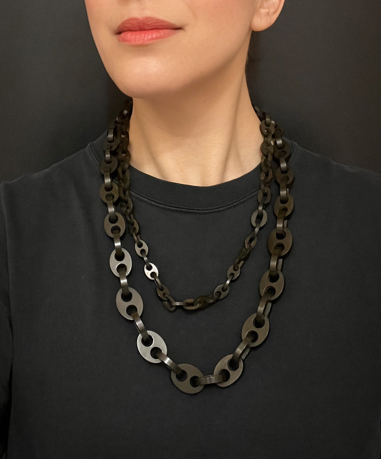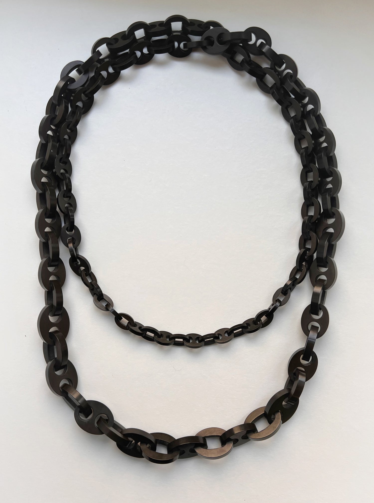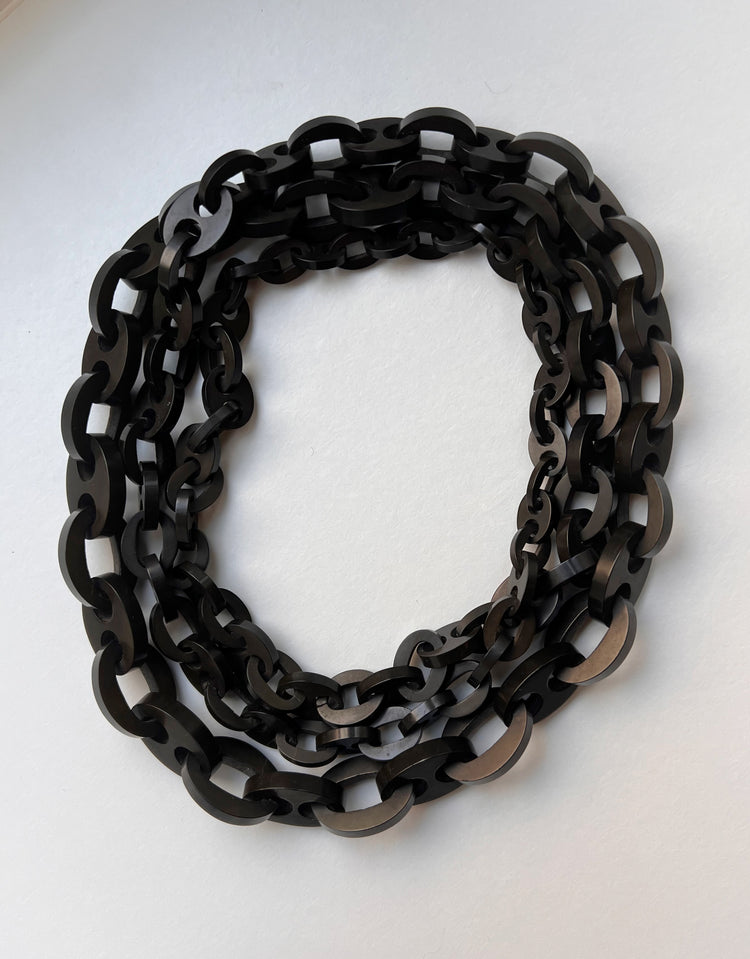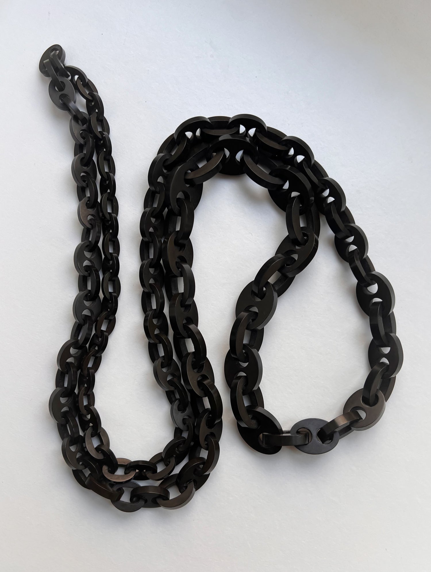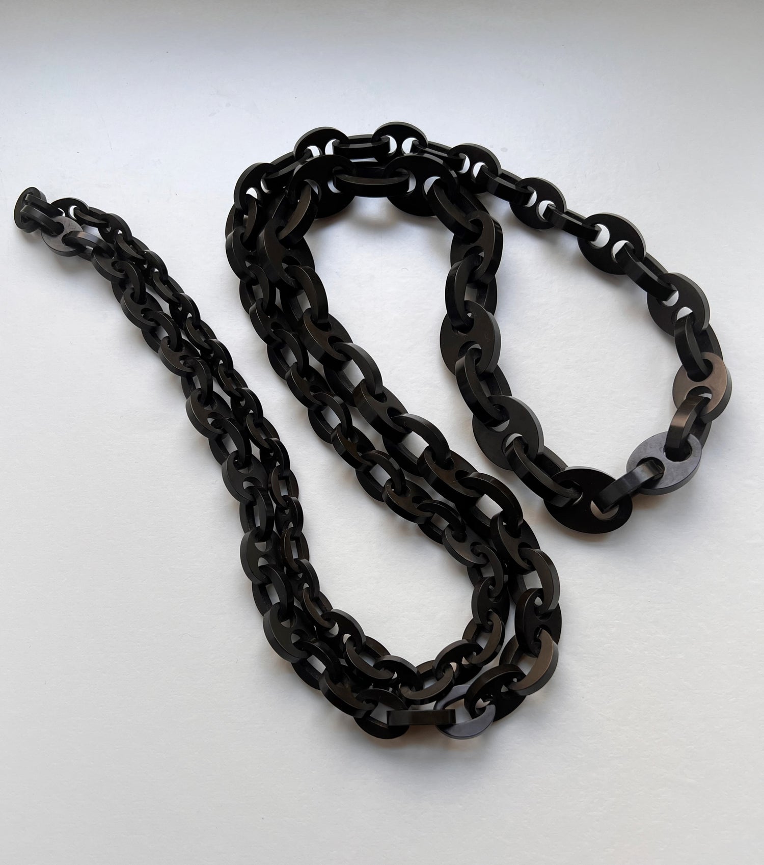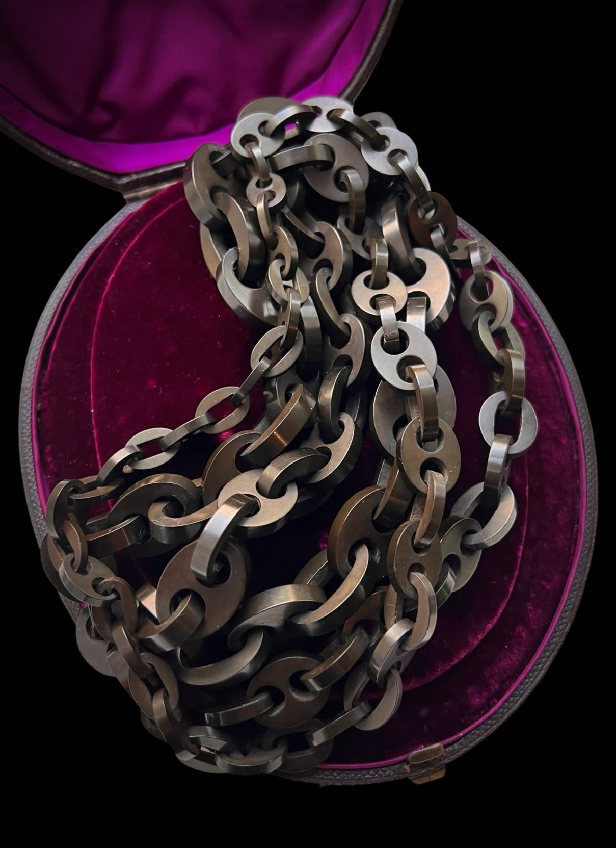 A super long Victorian vulcanite chain, with graduated mariner links.