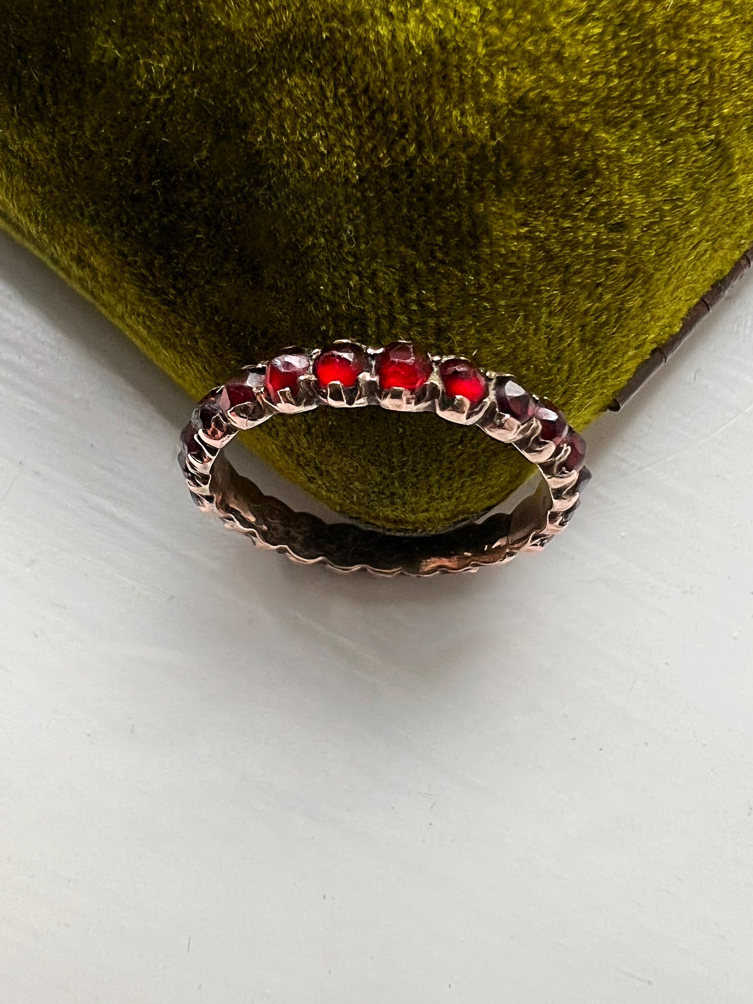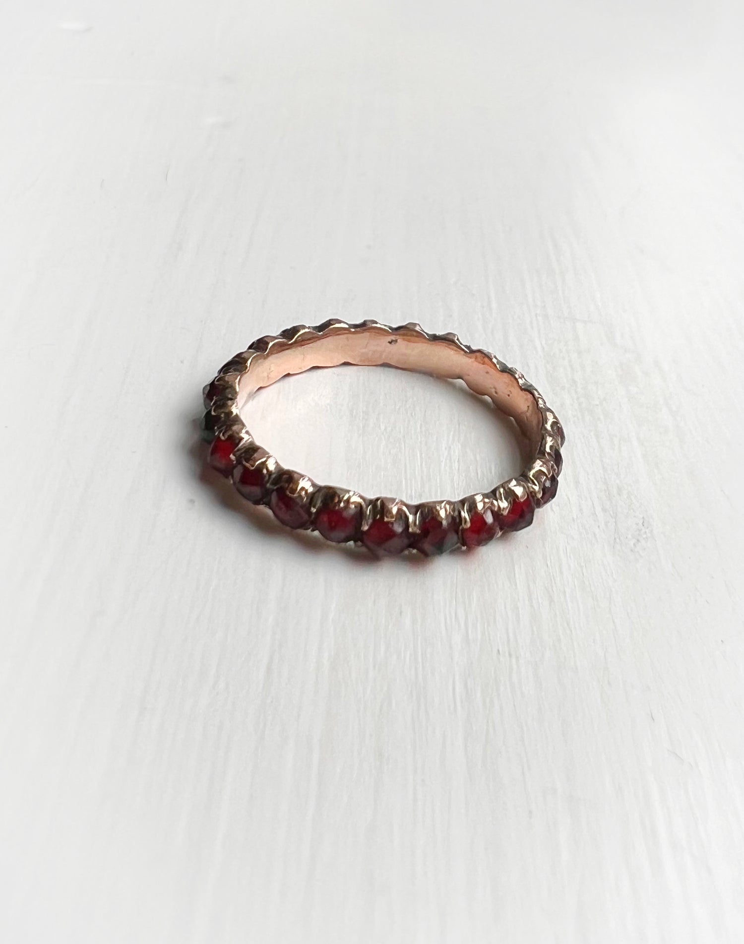 The sweetest Victorian Garnet eternity ring set in gold.