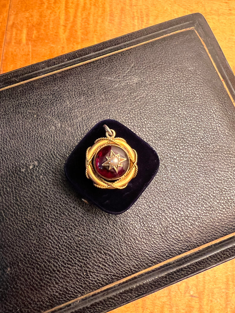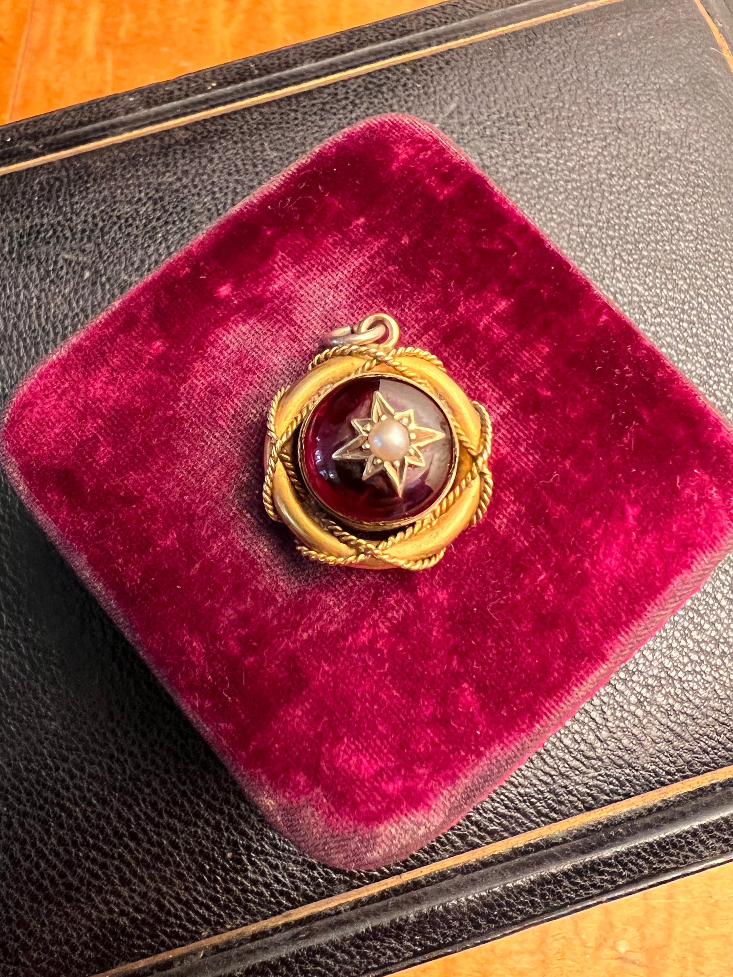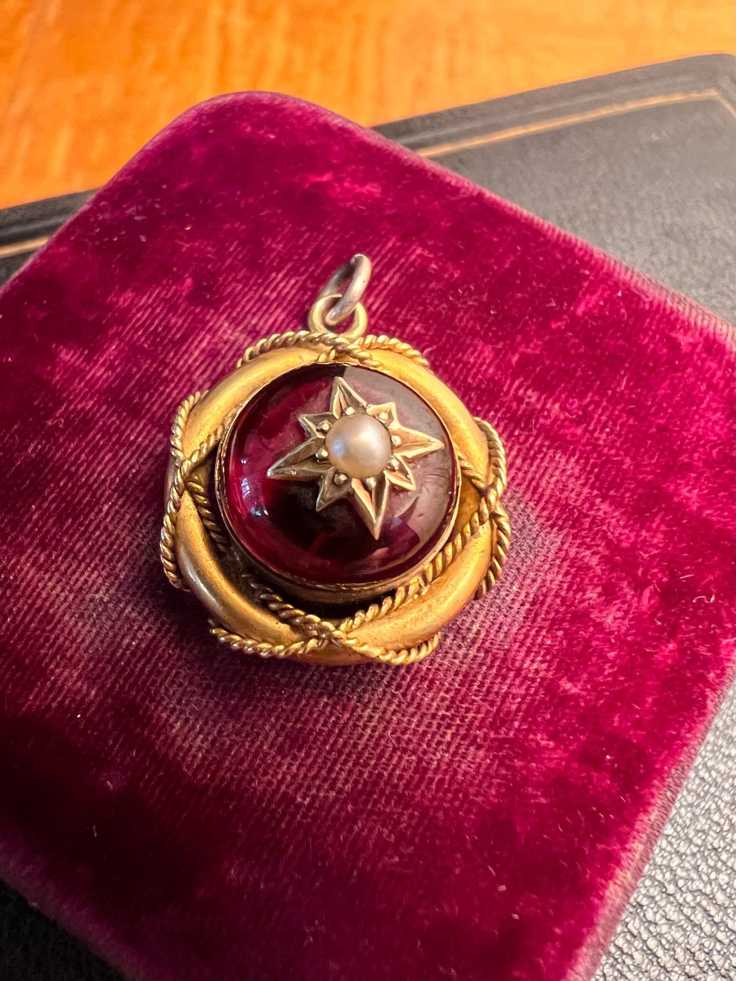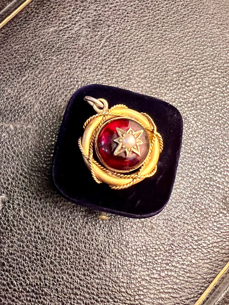This is a Victorian 15ct gold pendant with a chunky cabochon garnet set with a central natural pearl!