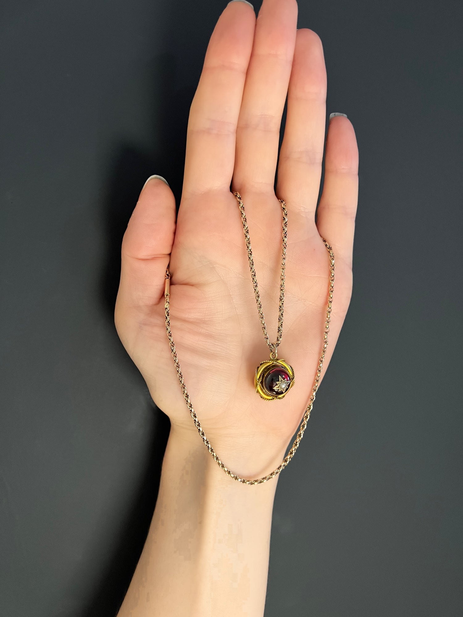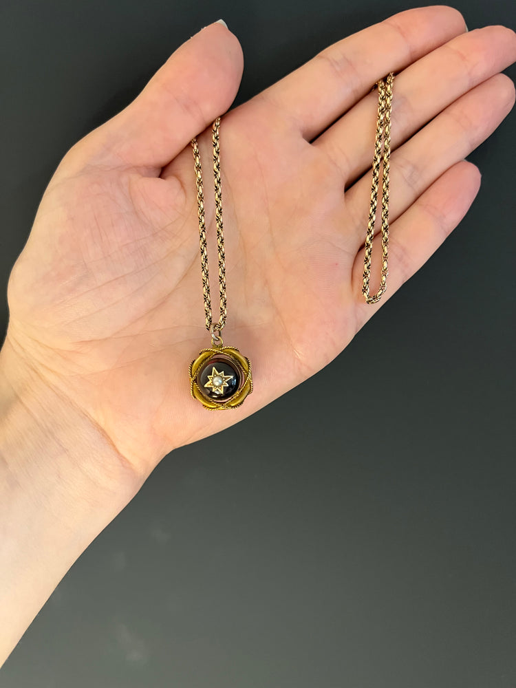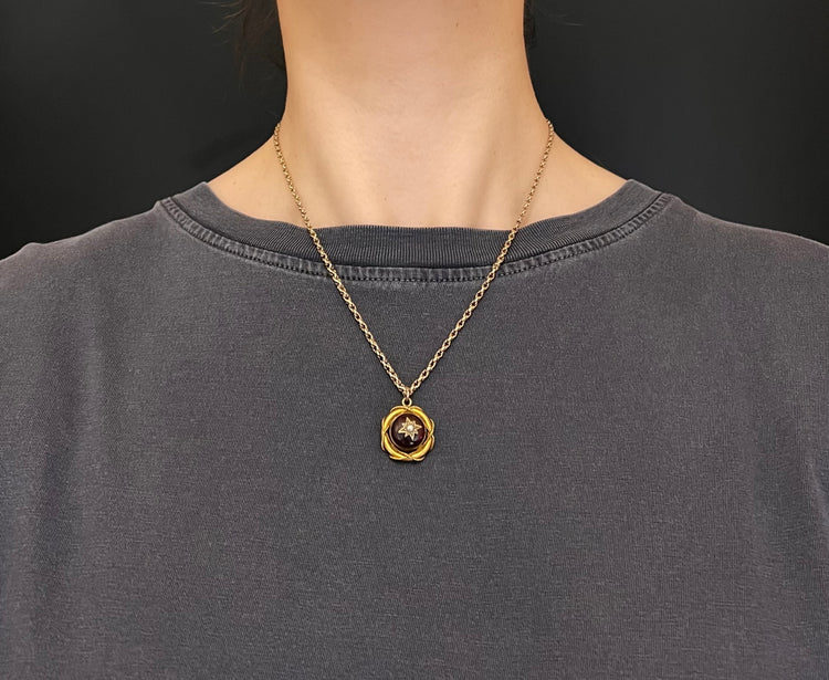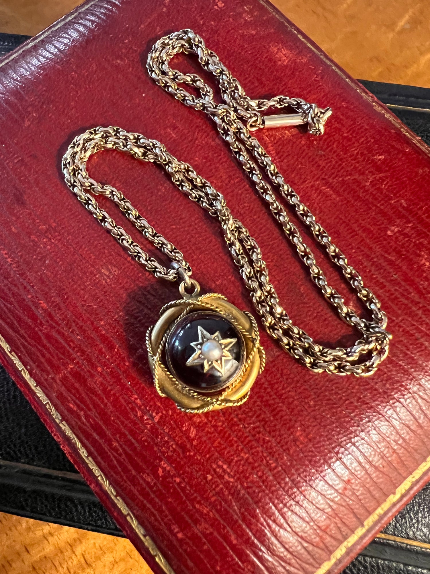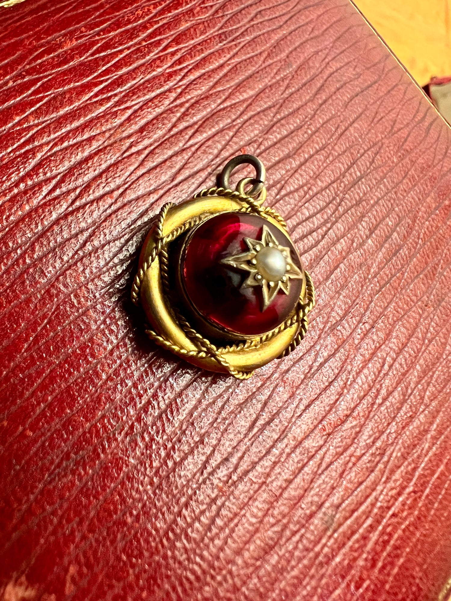 This is a Victorian 15ct gold pendant with a chunky cabochon garnet set with a central natural pearl!