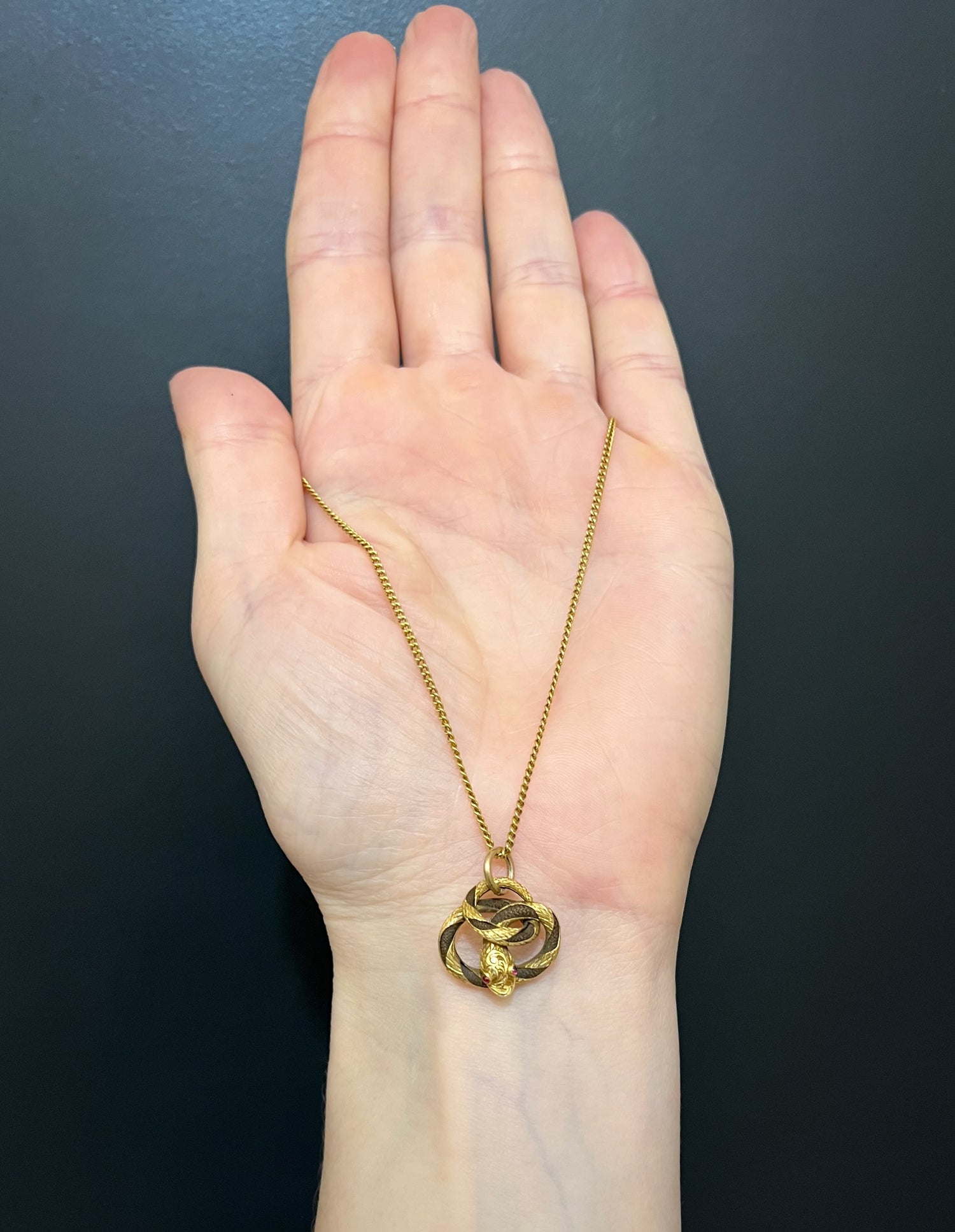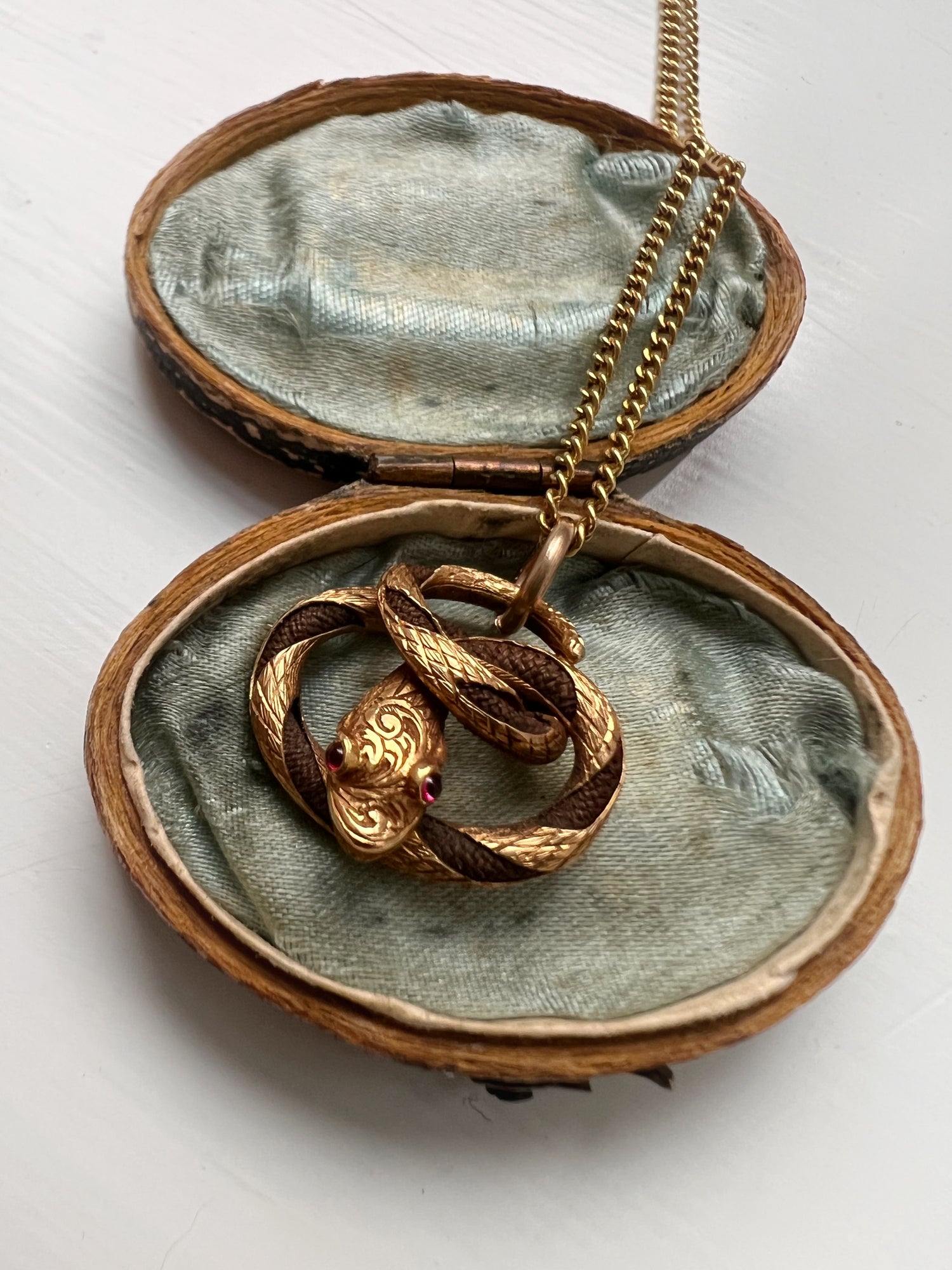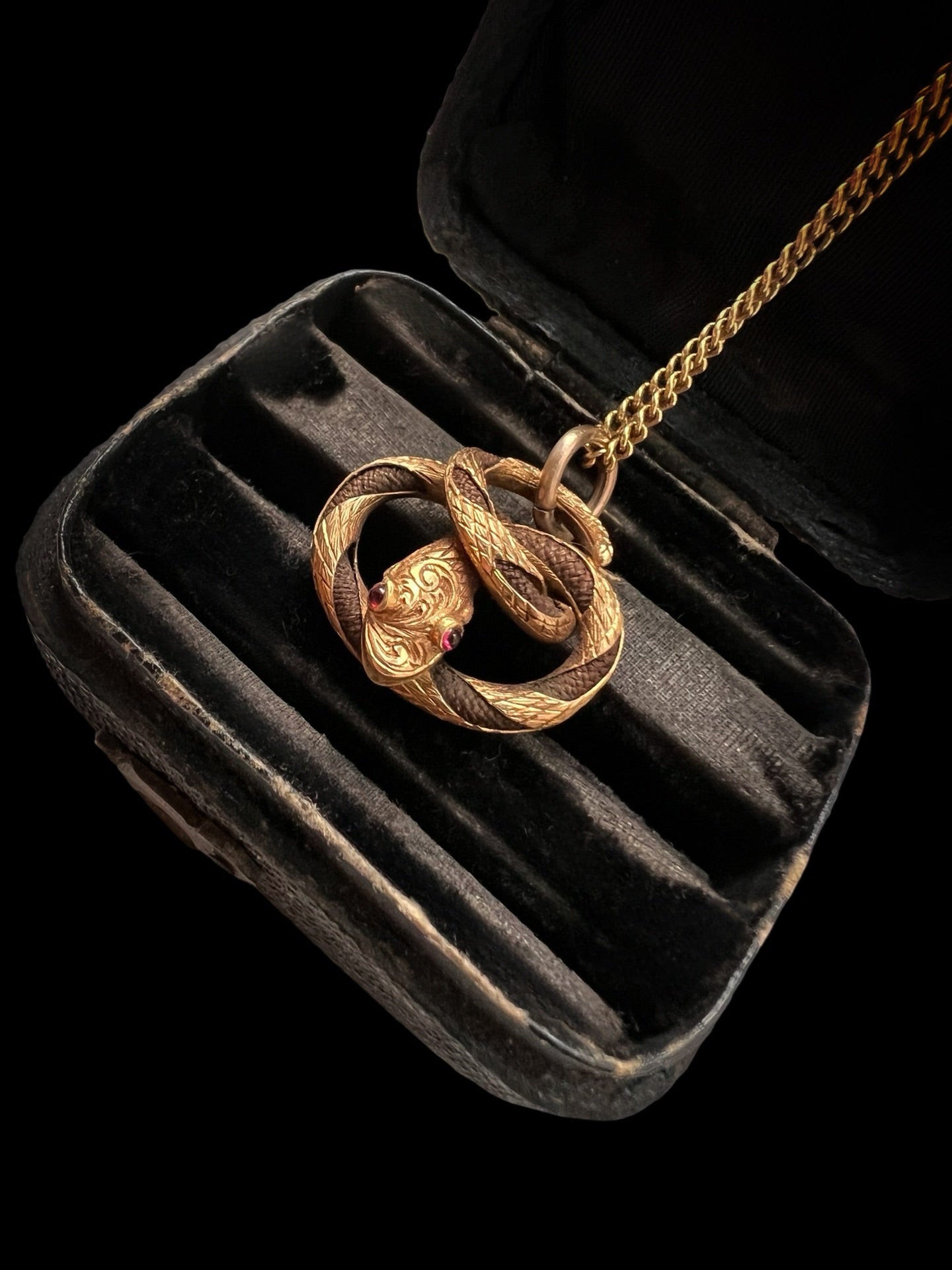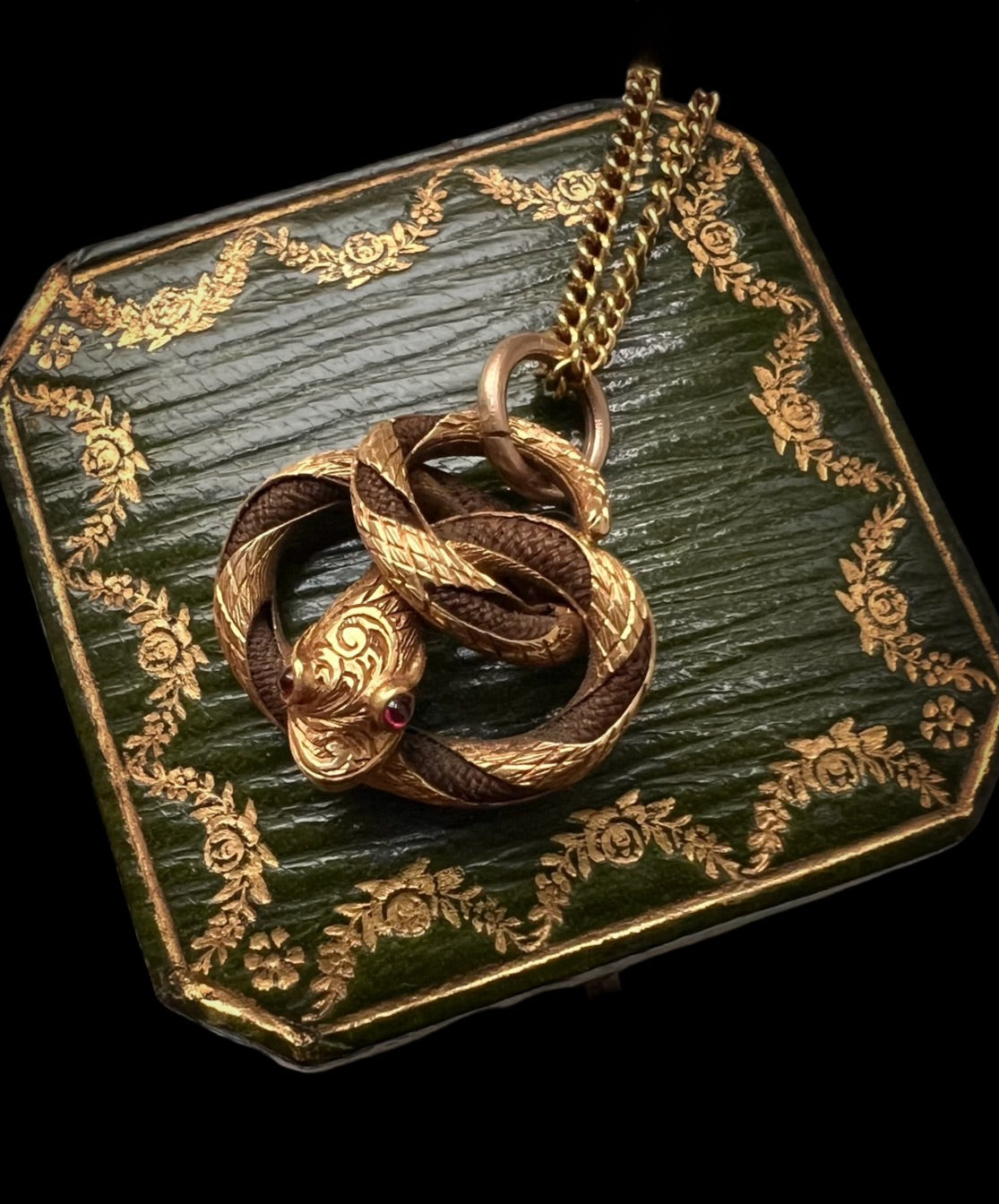 The pendant, made of 15ct gold has a beautifully chased snakes head with garnet boggle eyes, and a gold chased tail.