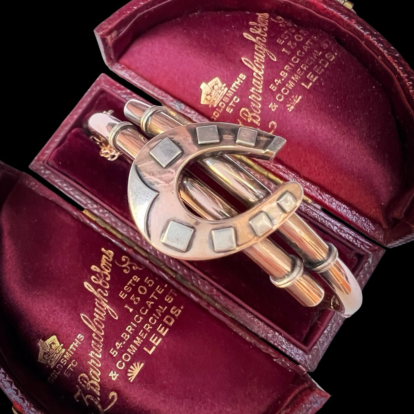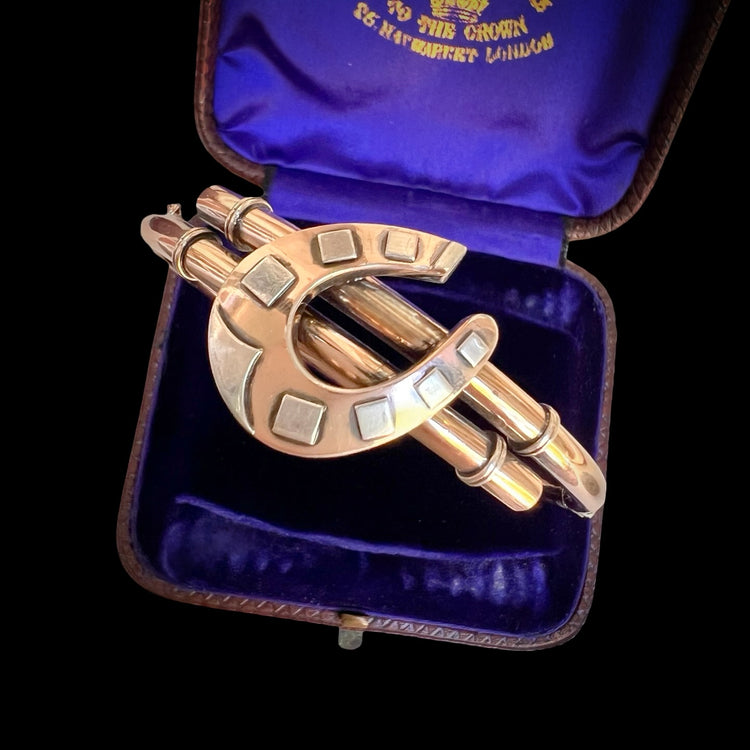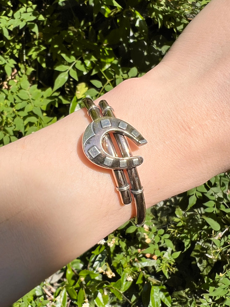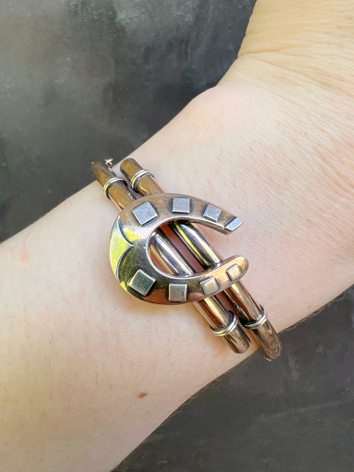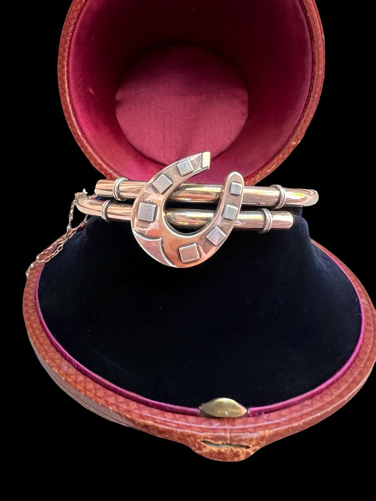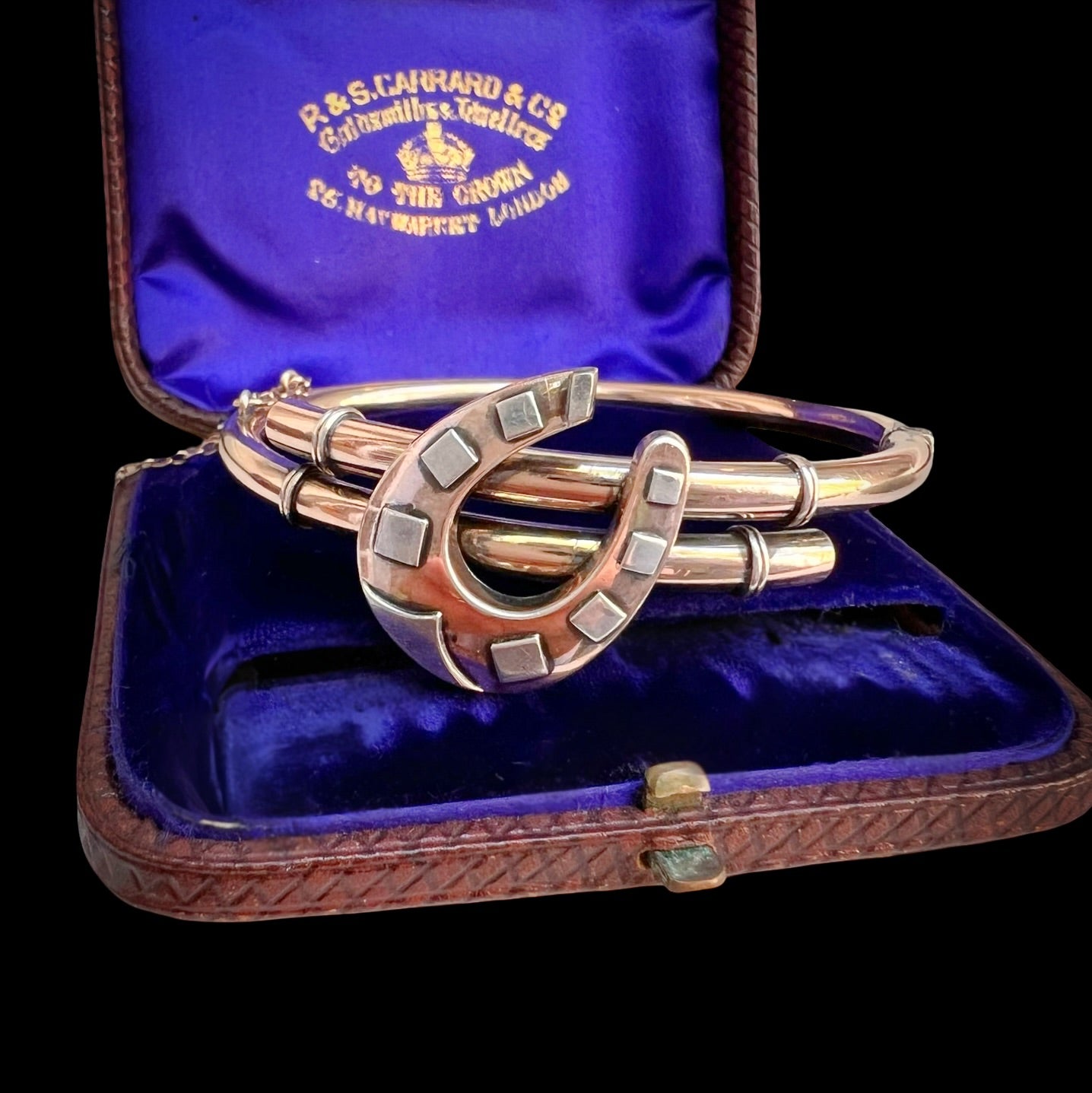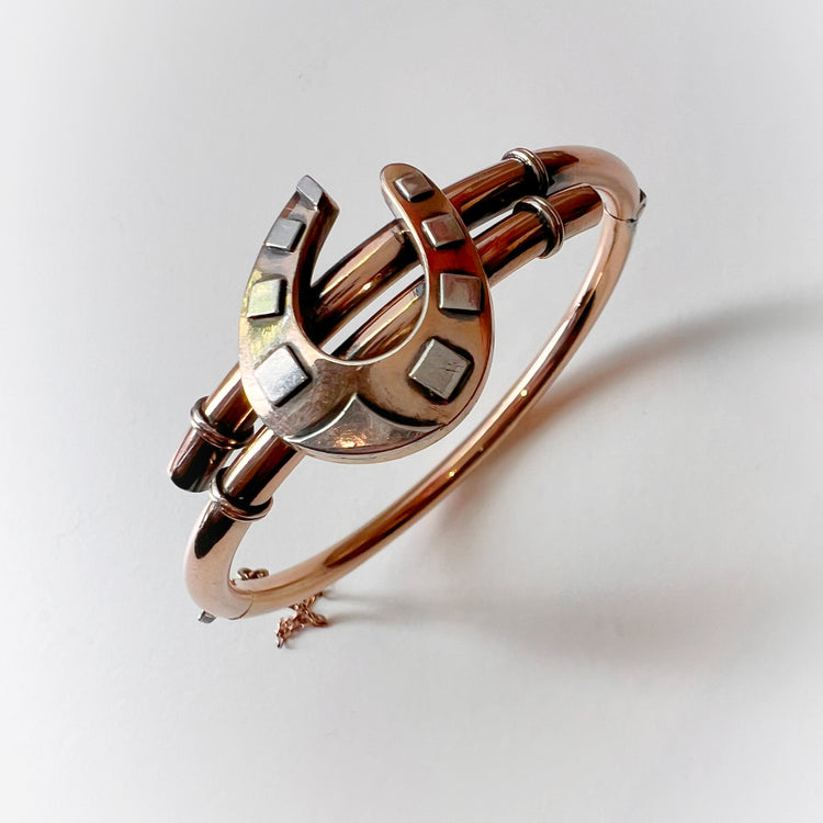 The silver tubular bangle has a rose gold gilded finish, with a gorgeous chunky horseshoe at the centre.