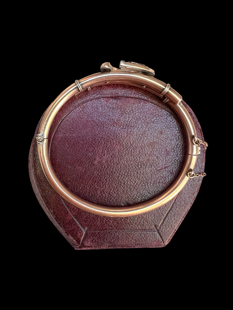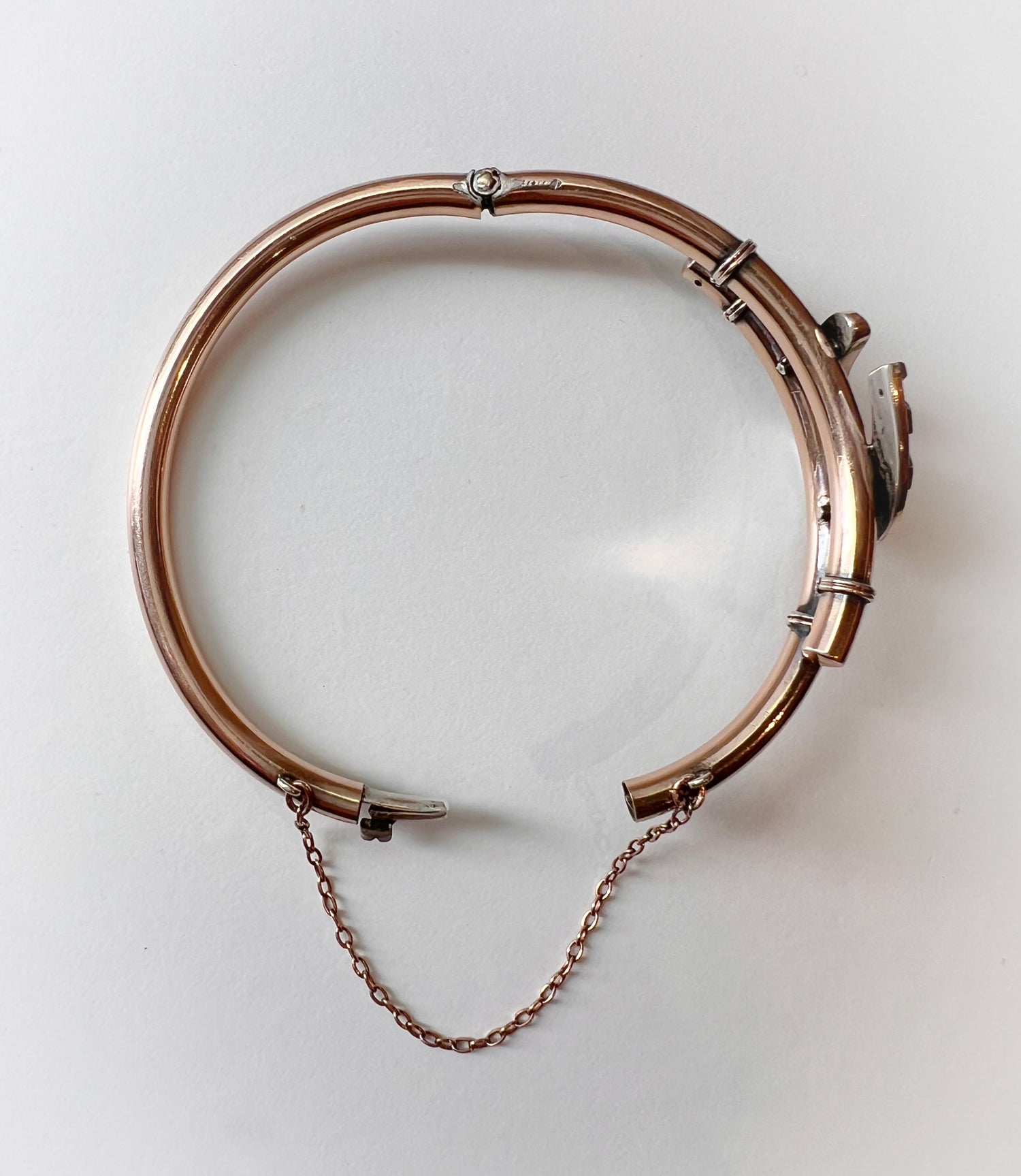 The bangle closes securely with a tongue clasp, and there is an additional rose gold safety chain if you want extra security.