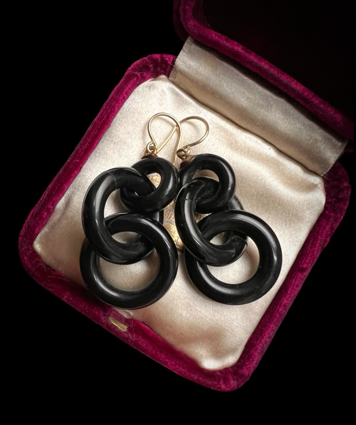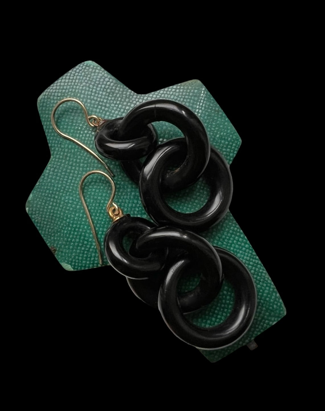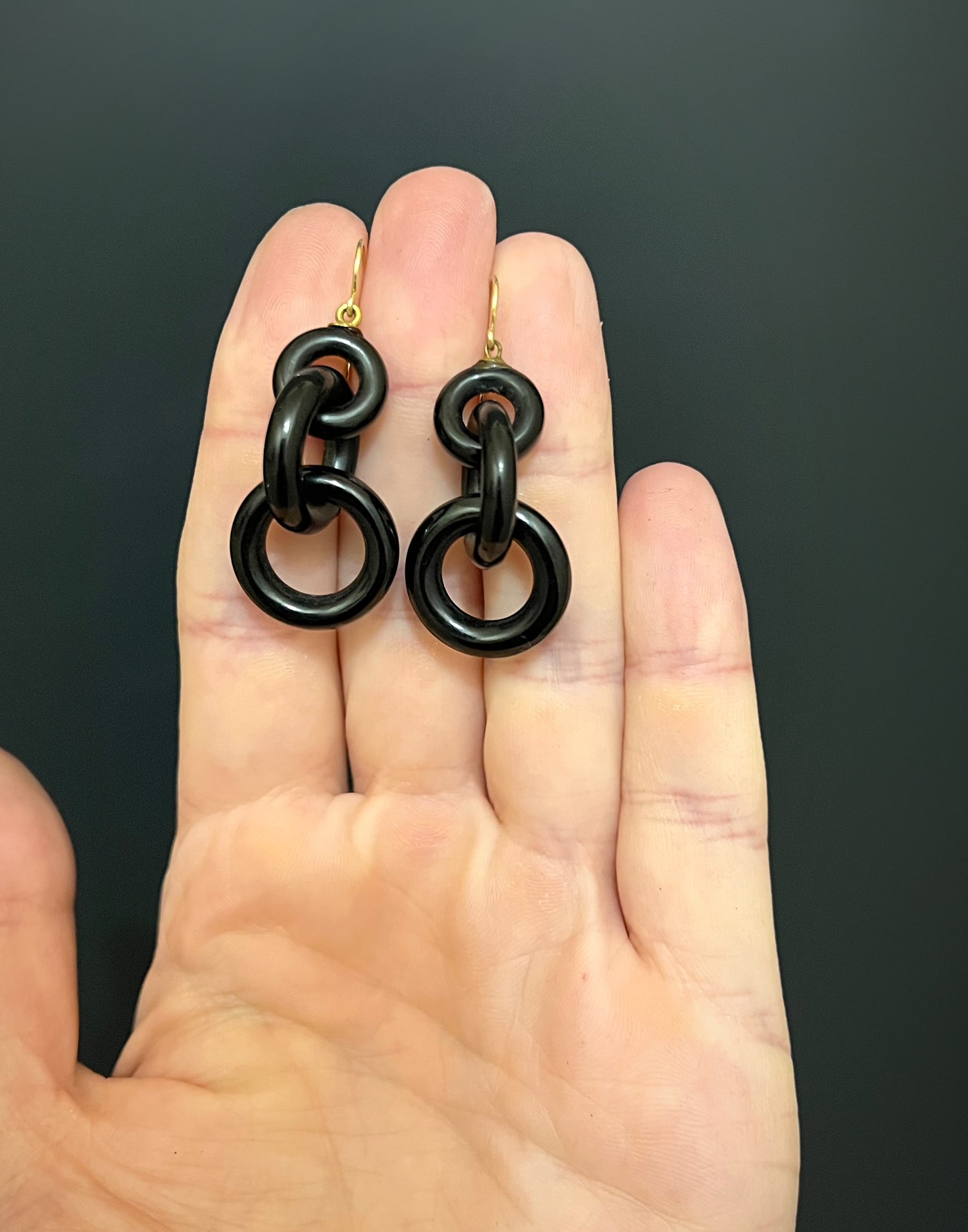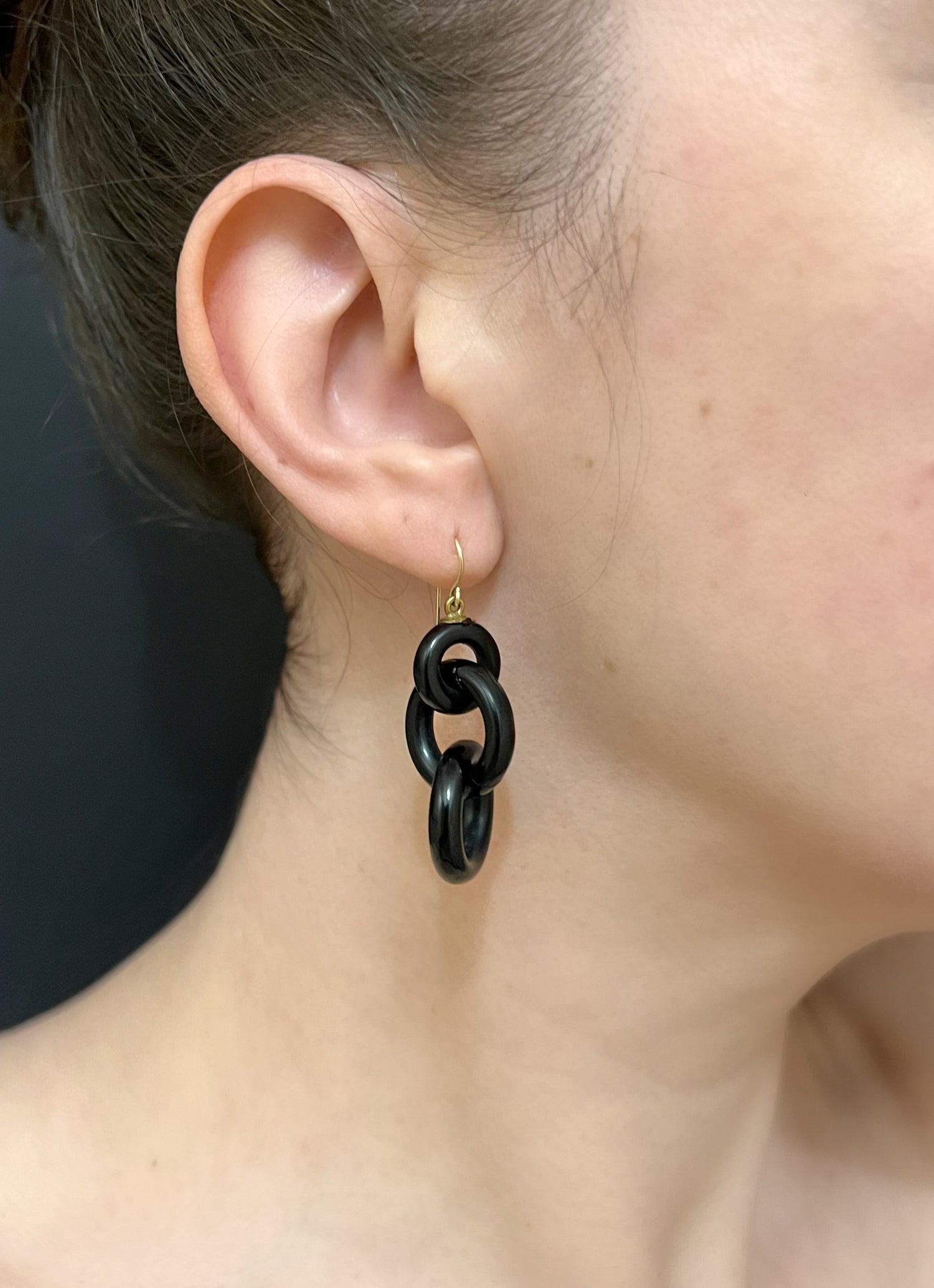 The earrings have three interlocking links of Jet to form large scale belcher chain drops.