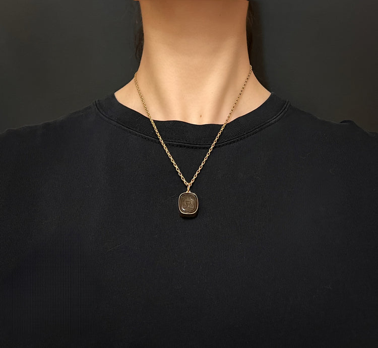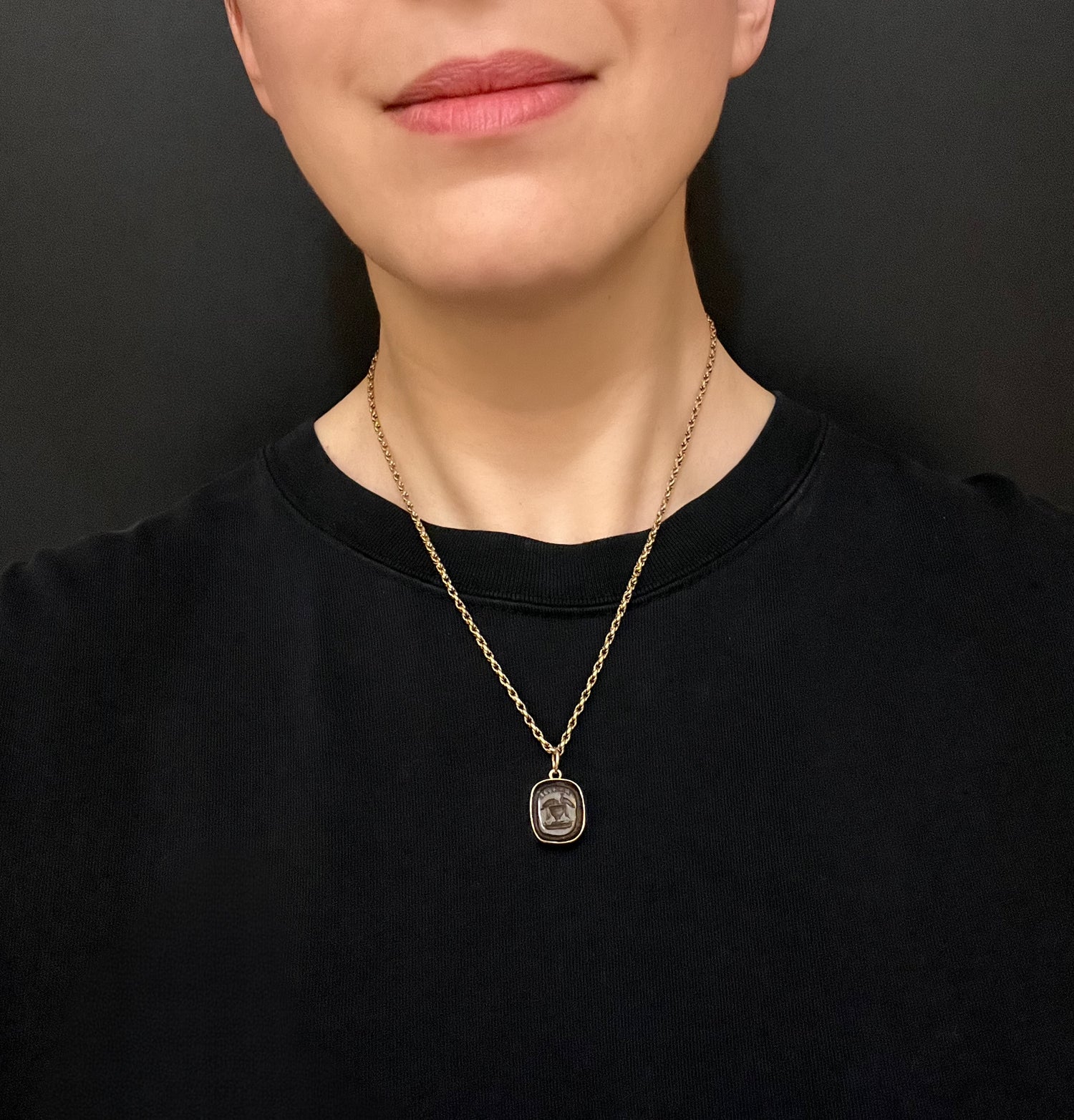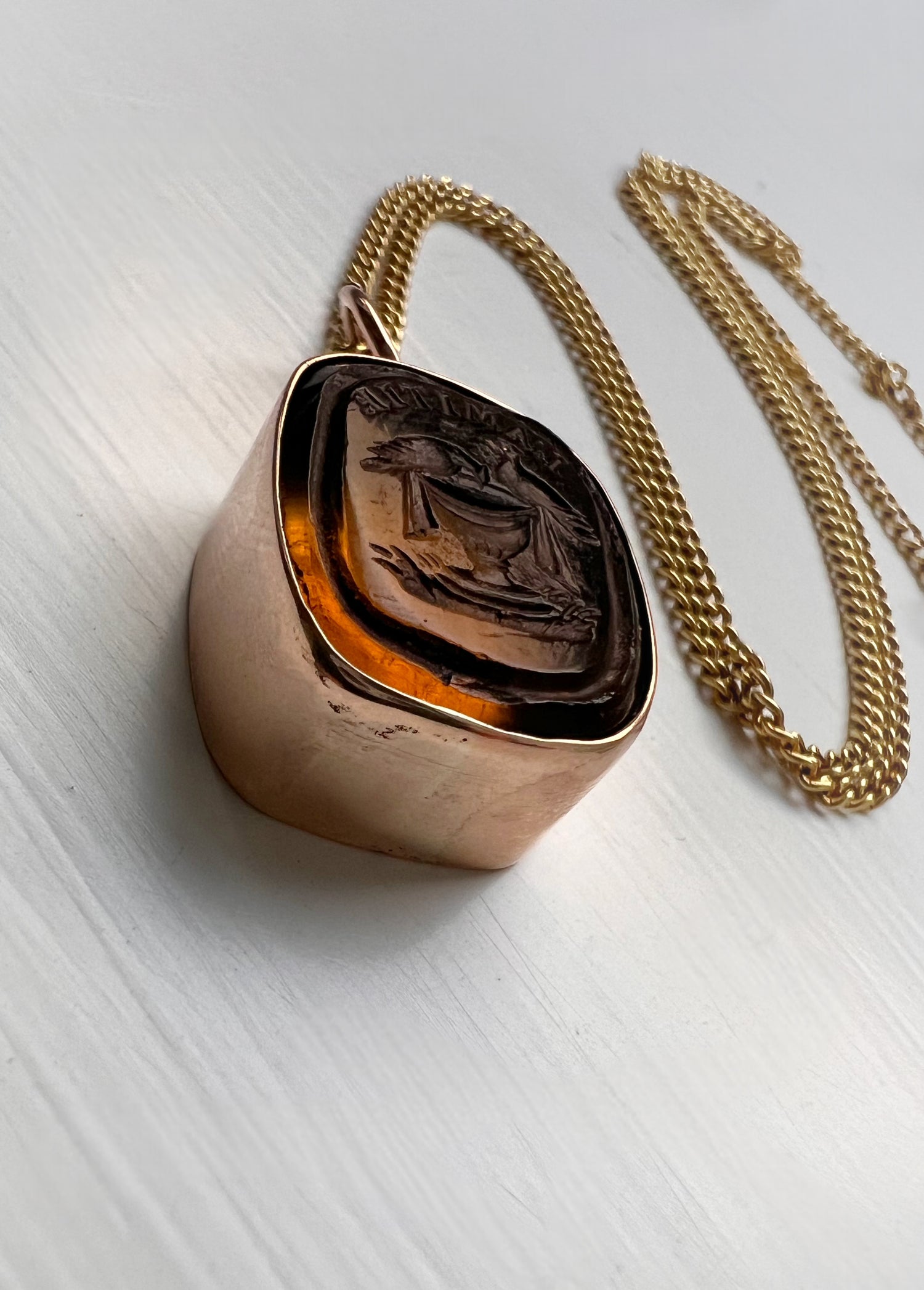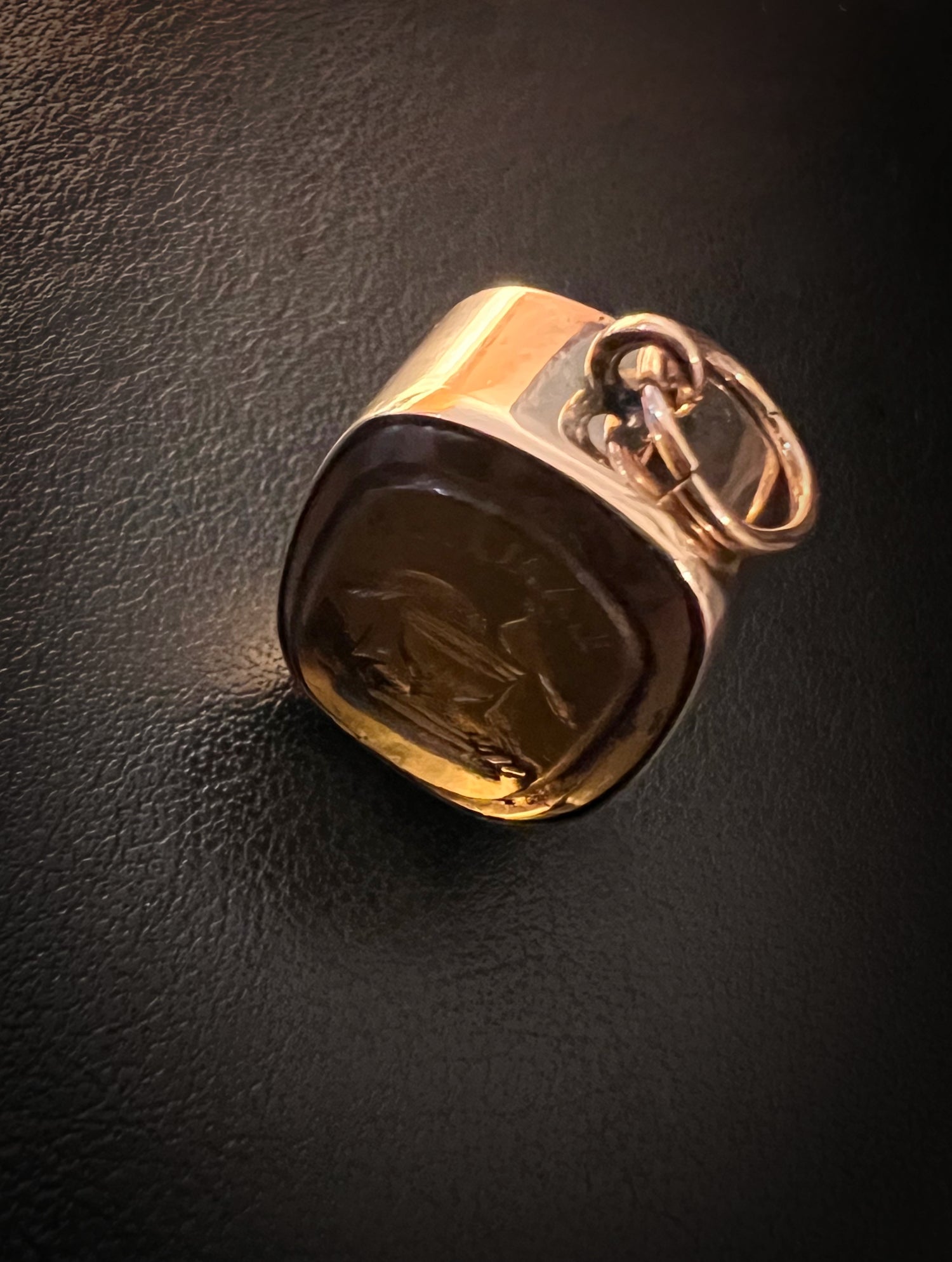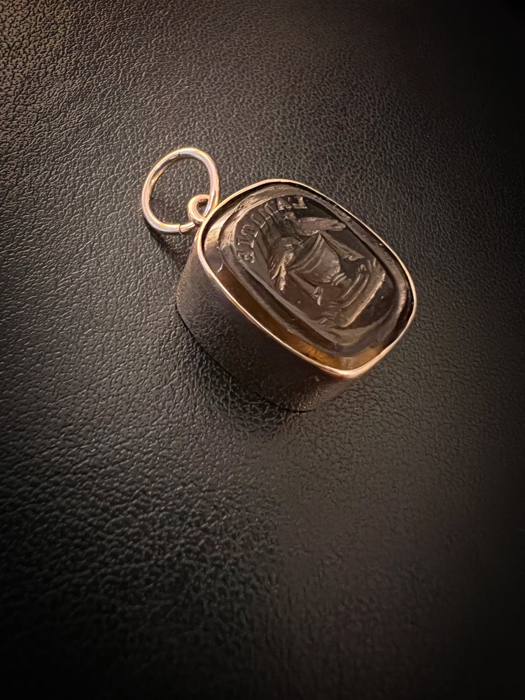 The intaglio has been set in a very simple 9ct gold setting, to allow the story of the piece to take centre stage.