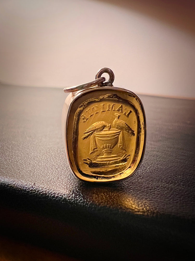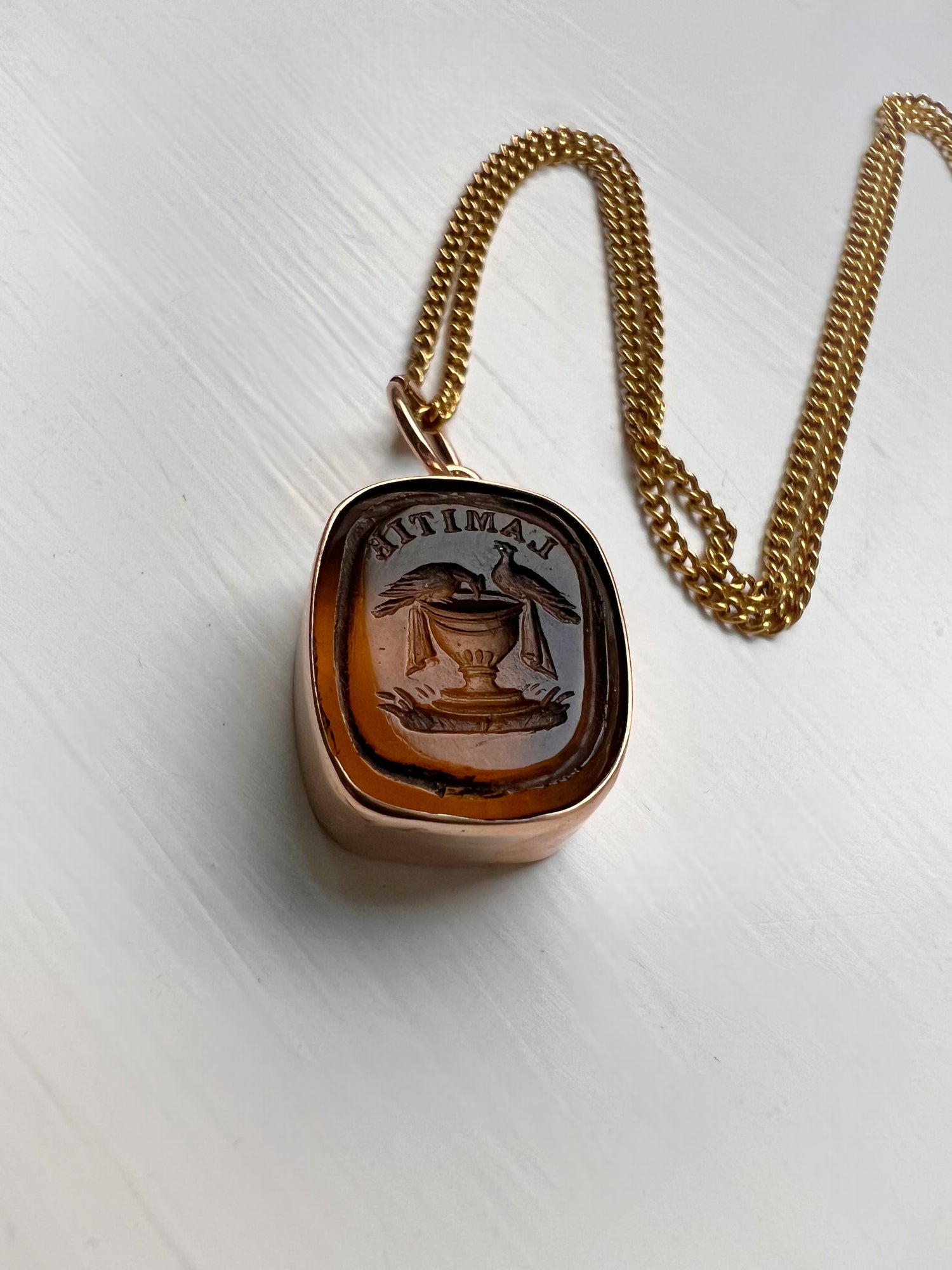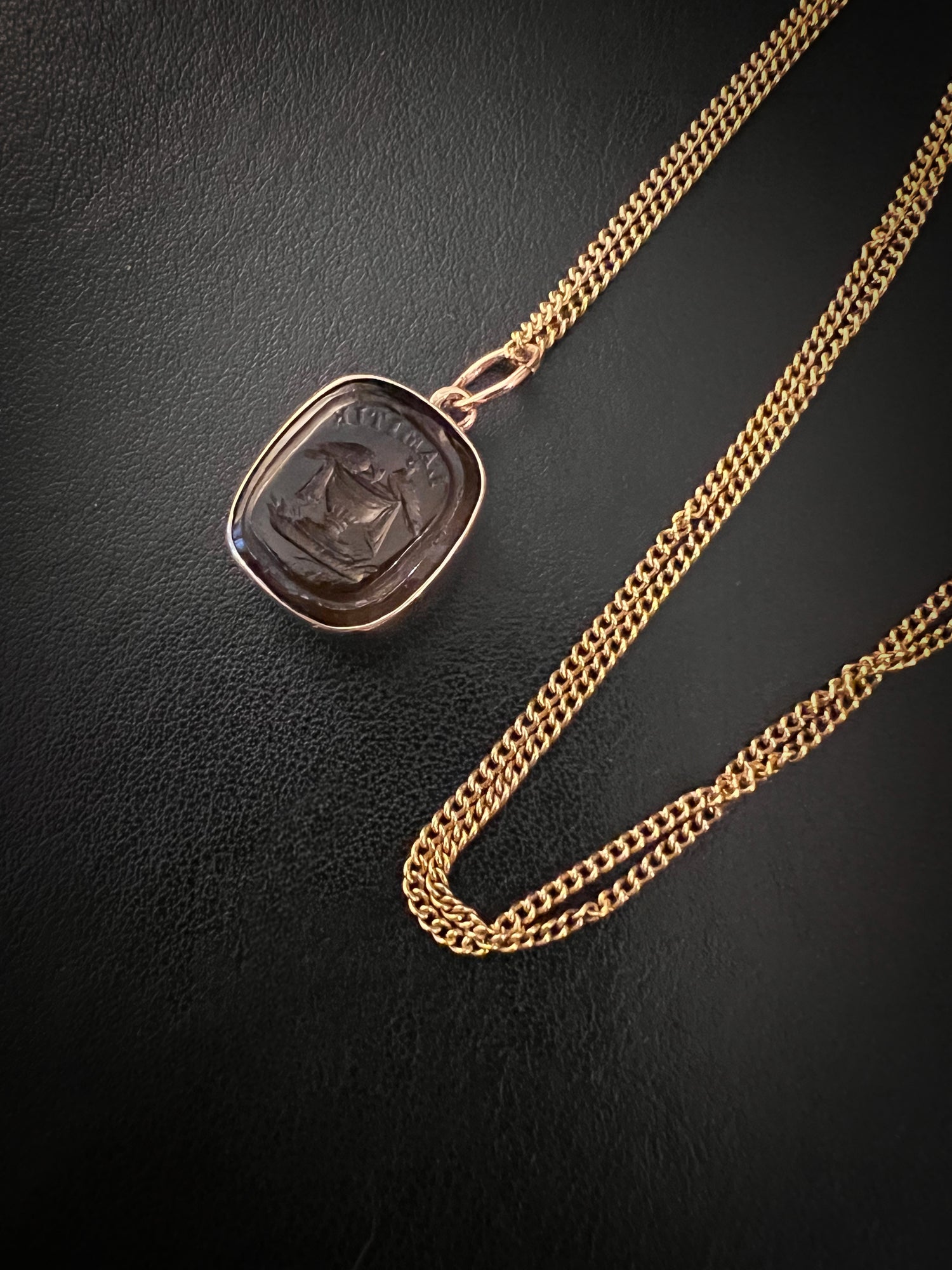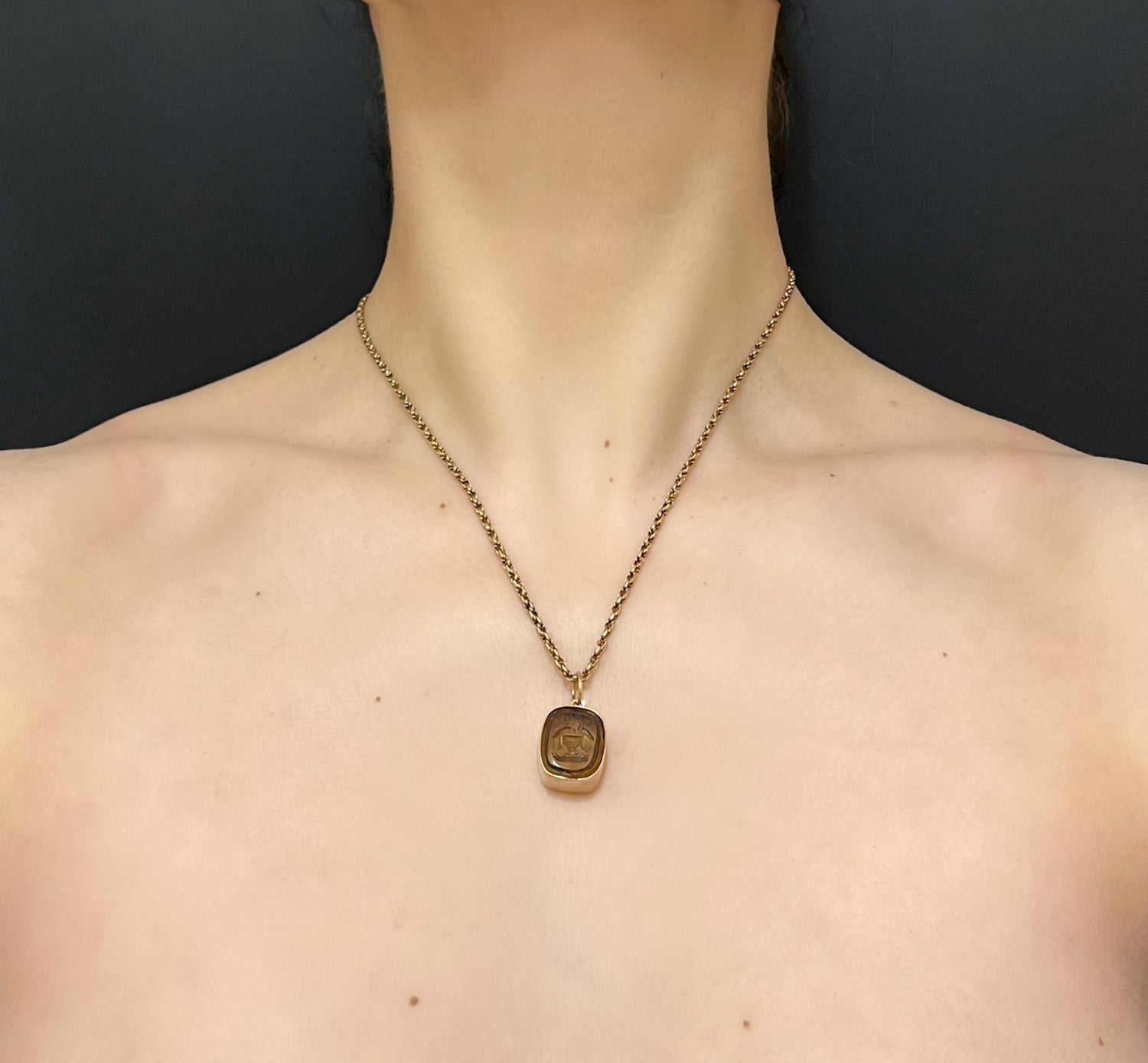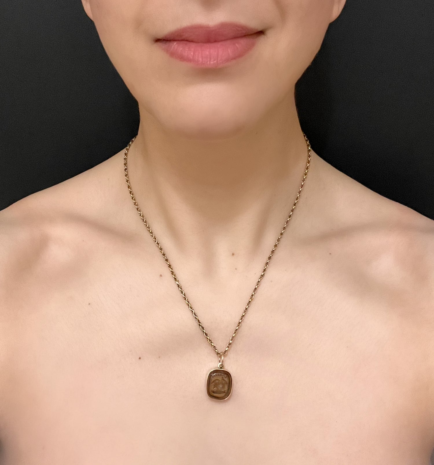 The intaglio has been set in a very simple 9ct gold setting, to allow the story of the piece to take centre stage.