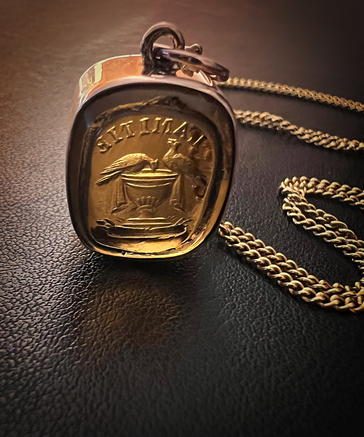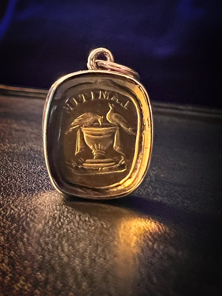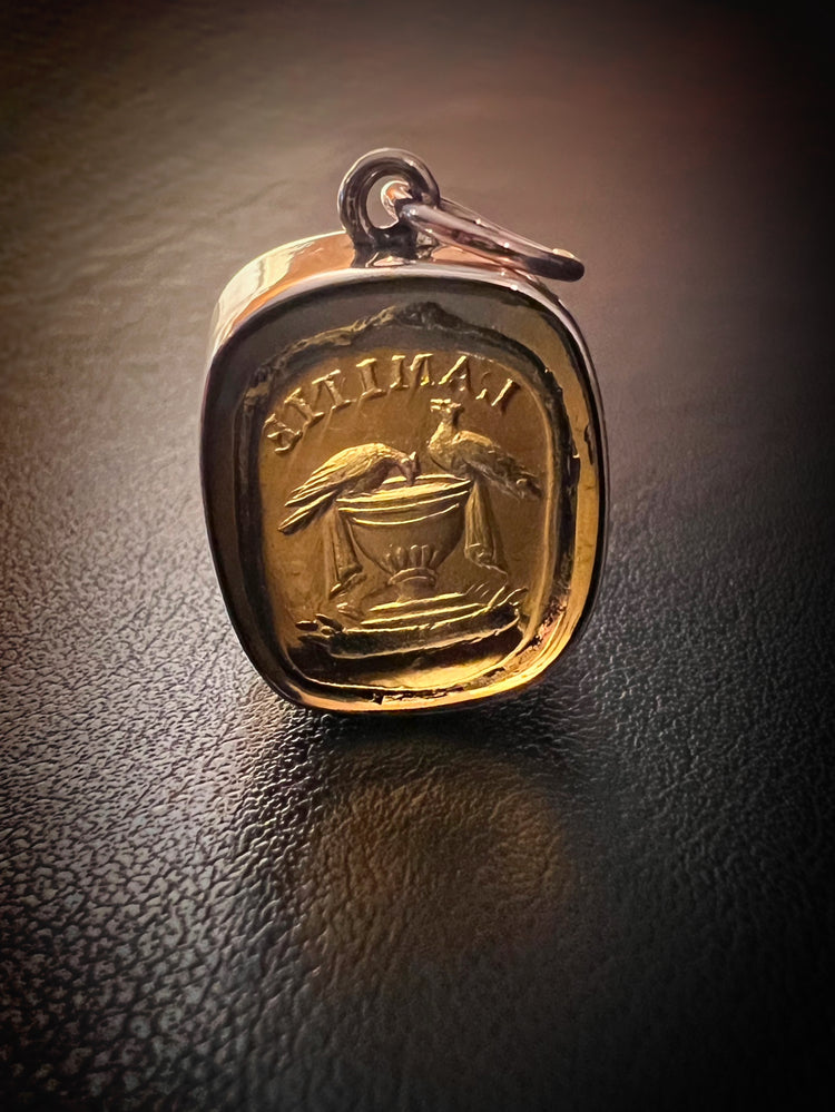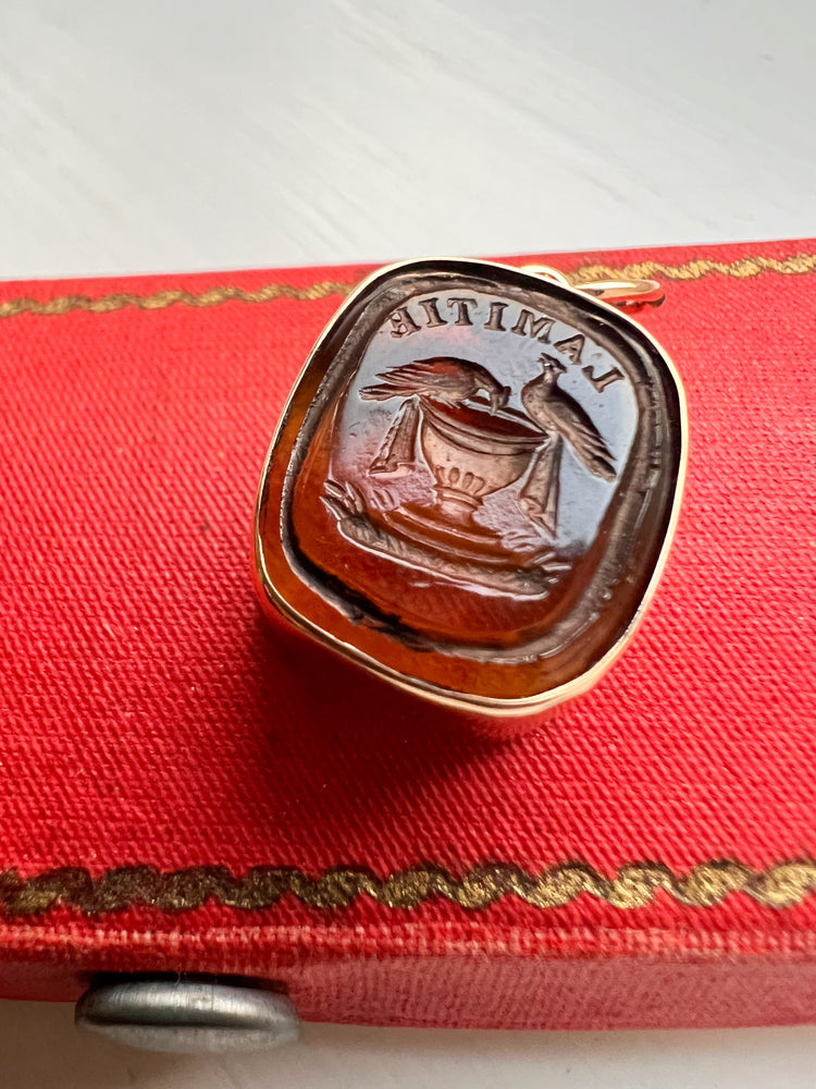 The intaglio depicts ‘The doves of Pliny’ which portrays two doves; one drinking from an ornate bowl, the other sunning himself.