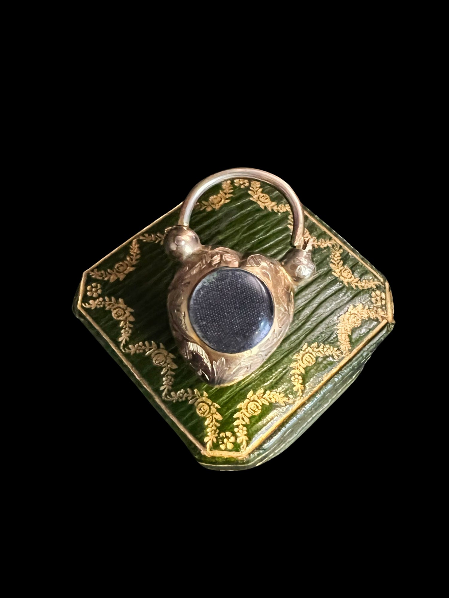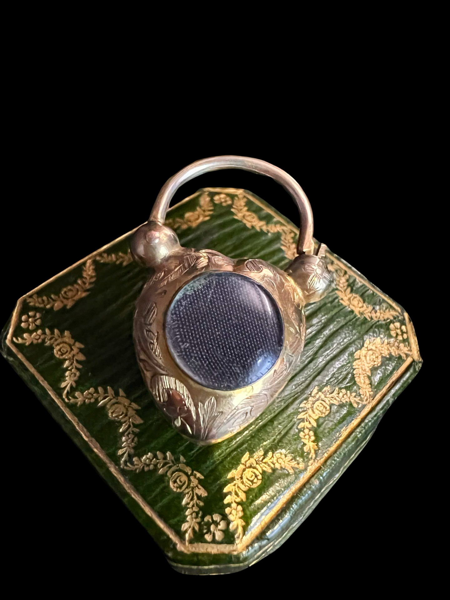 There is a circular glass locket on the reverse, which has the original fabric inlay.