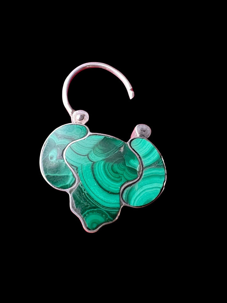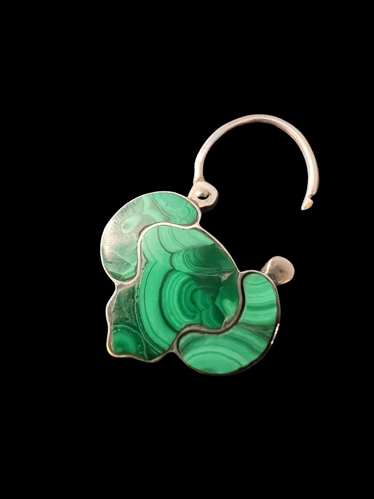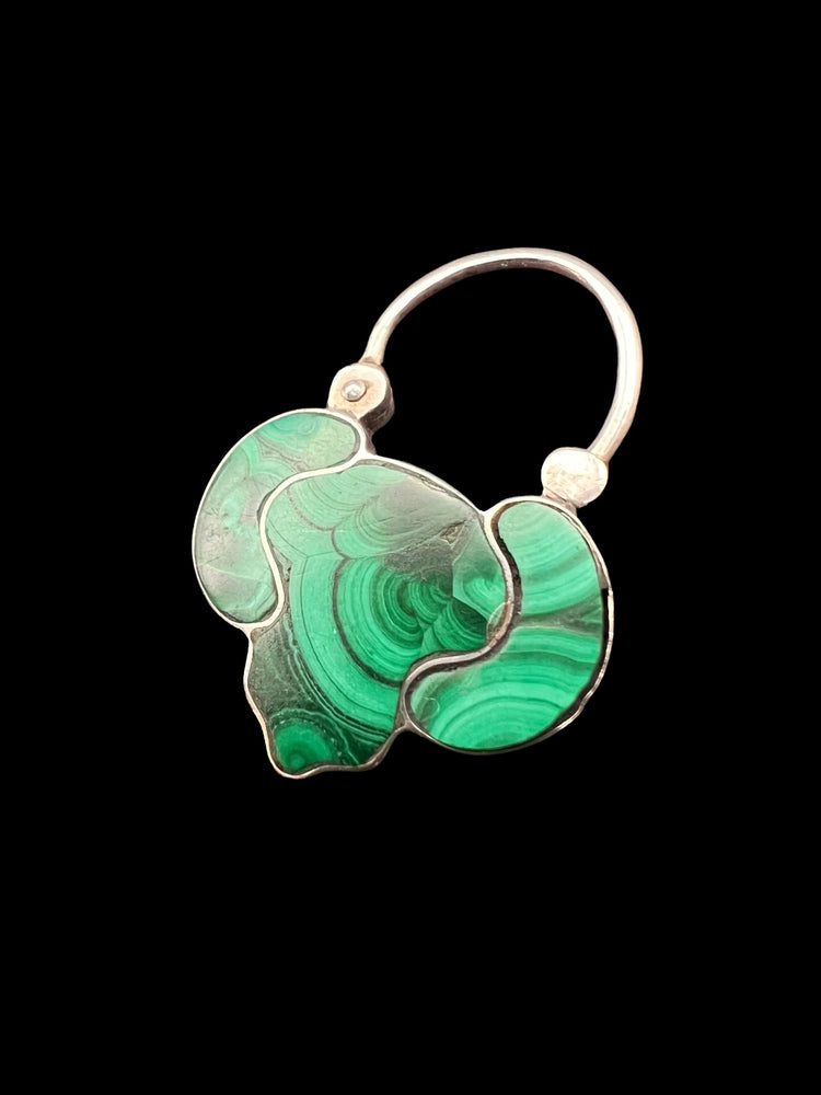 The padlock is an unusual shape, and set with three pieces of Malachite, all showing the wonderful banded shades of green.