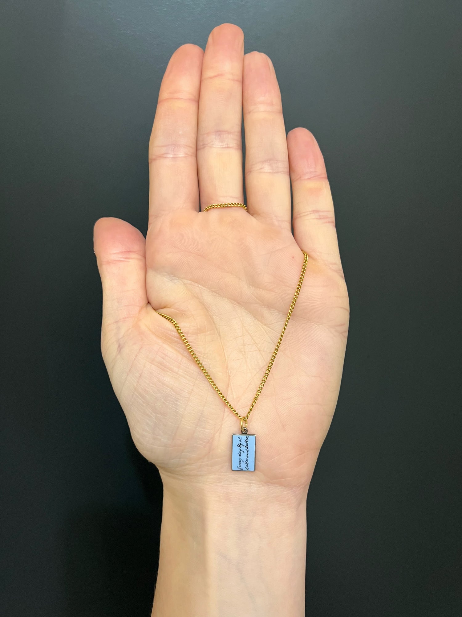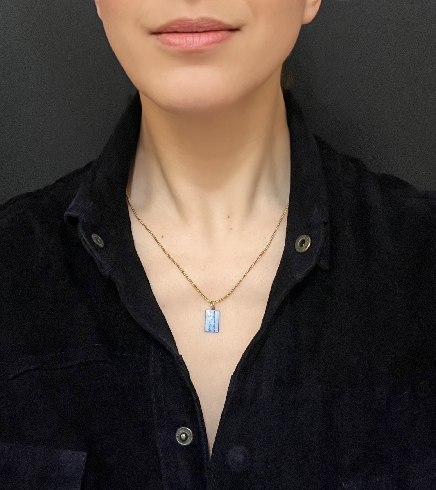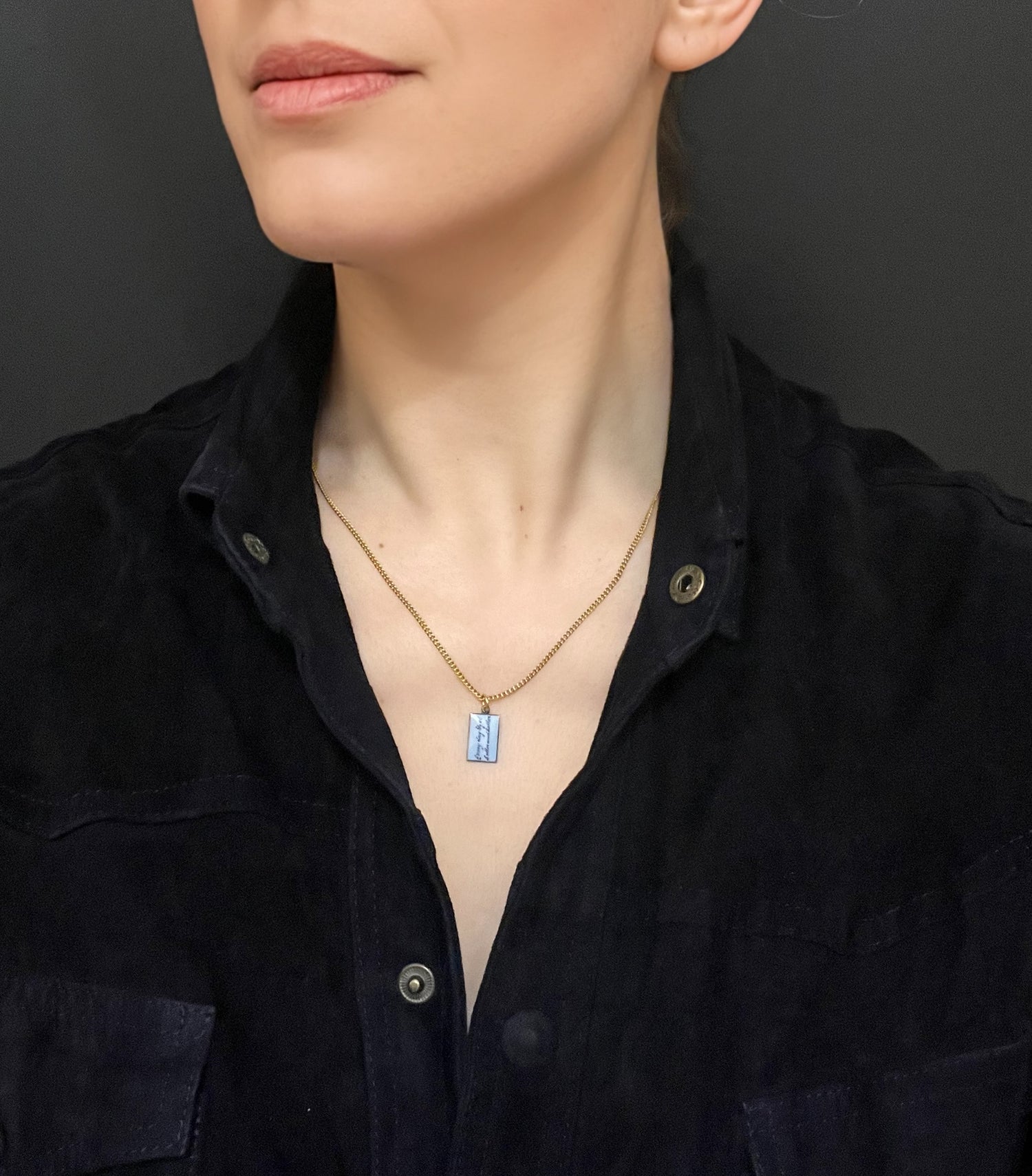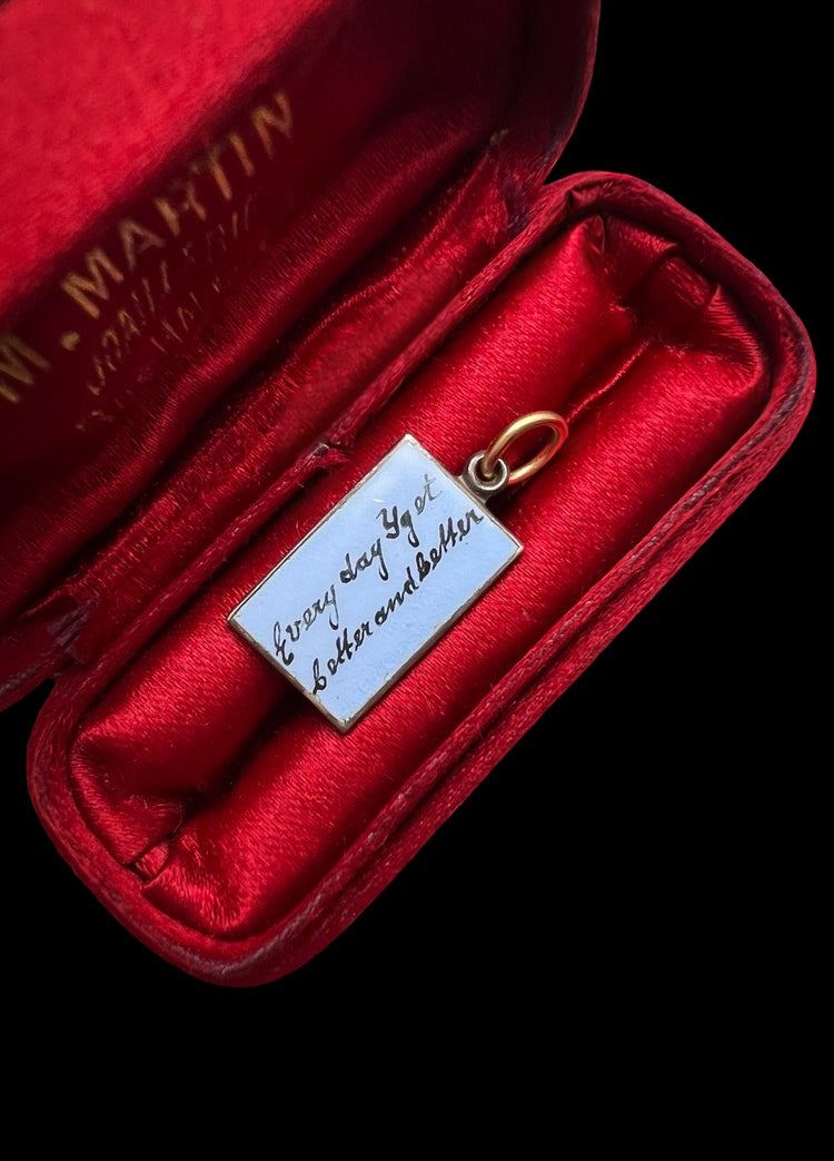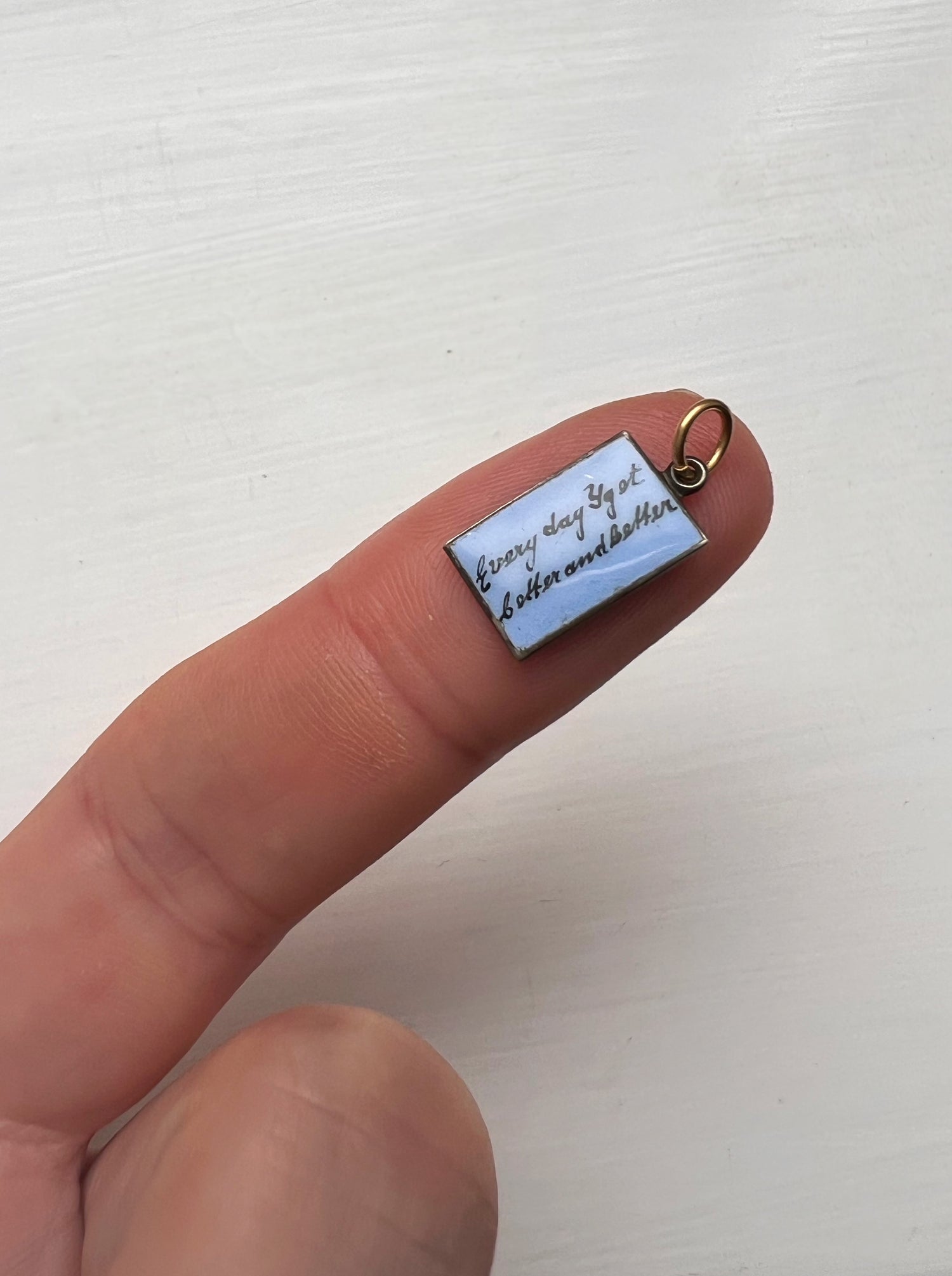 The mini note is written in black italic font on blue / lilac enamel, with the words to the affect of: