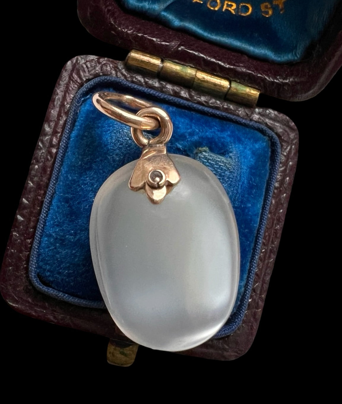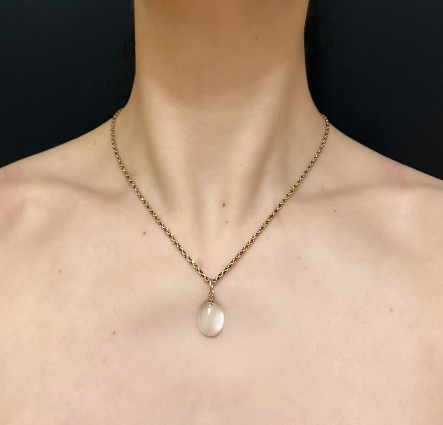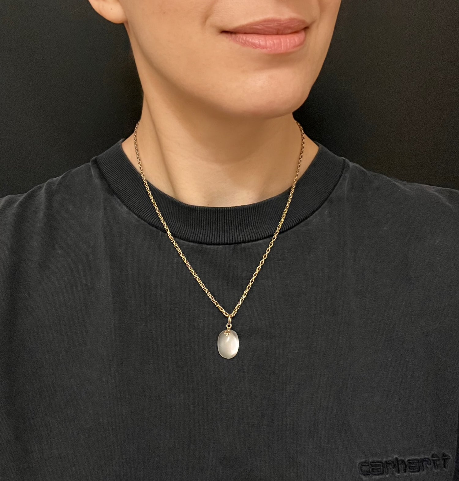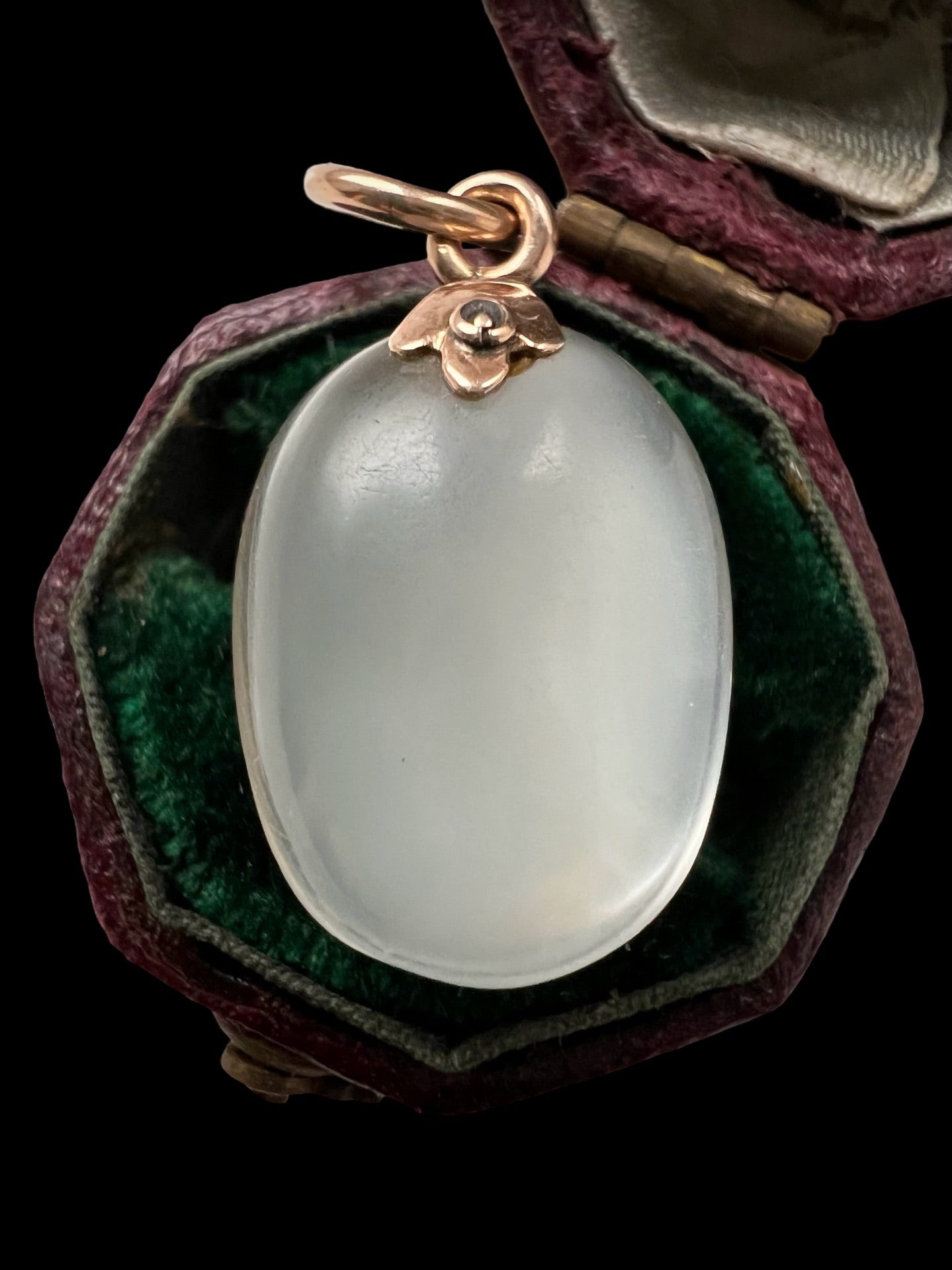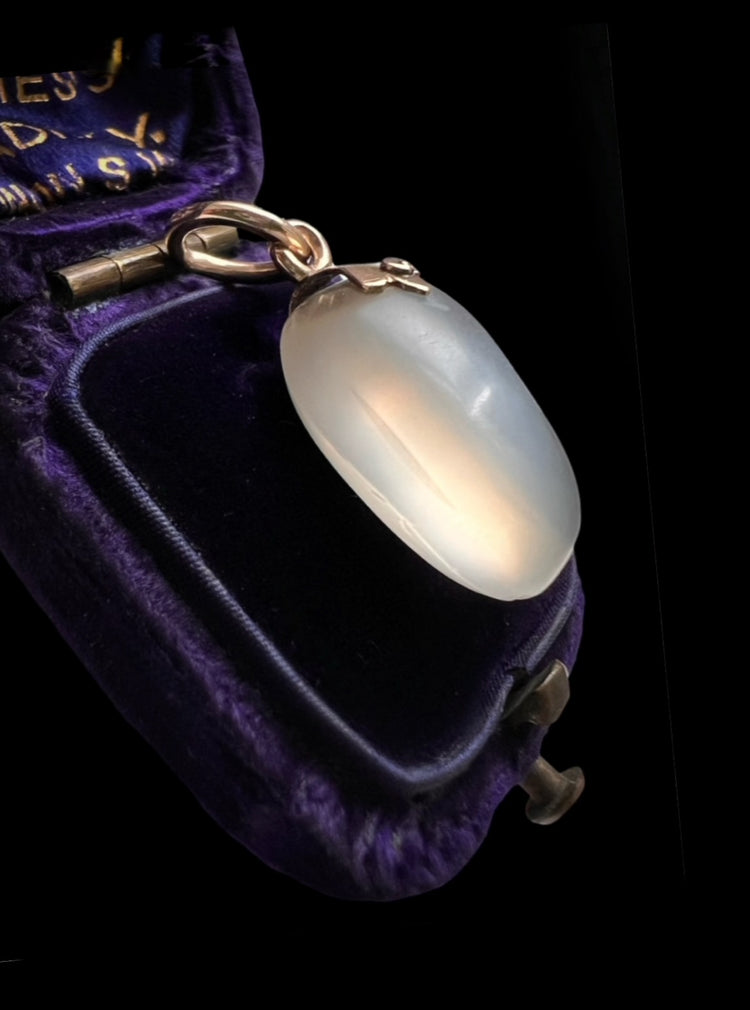 The Moonstone hangs from the original trefoil pegged bail and jump ring which are made of 9ct gold.