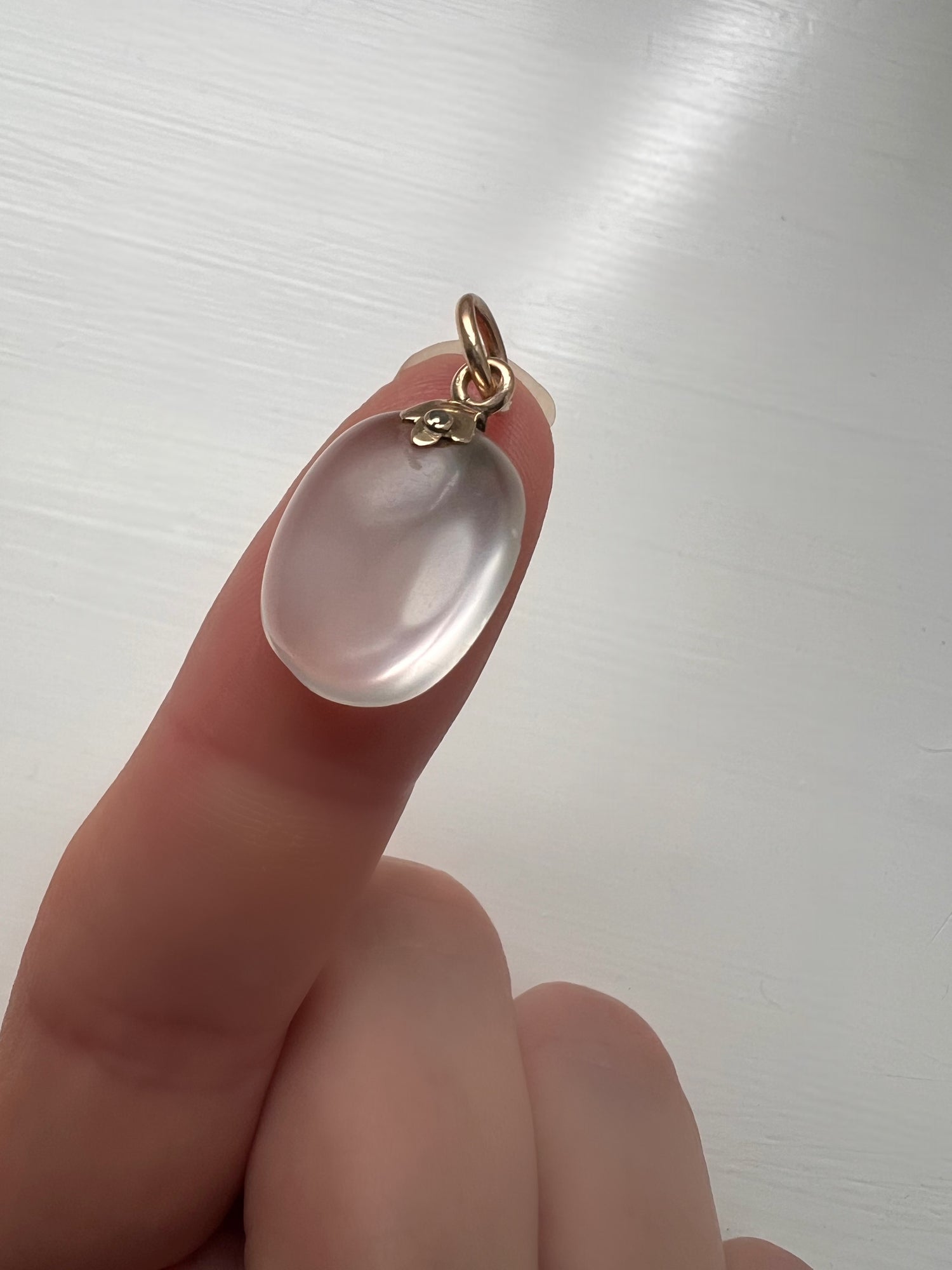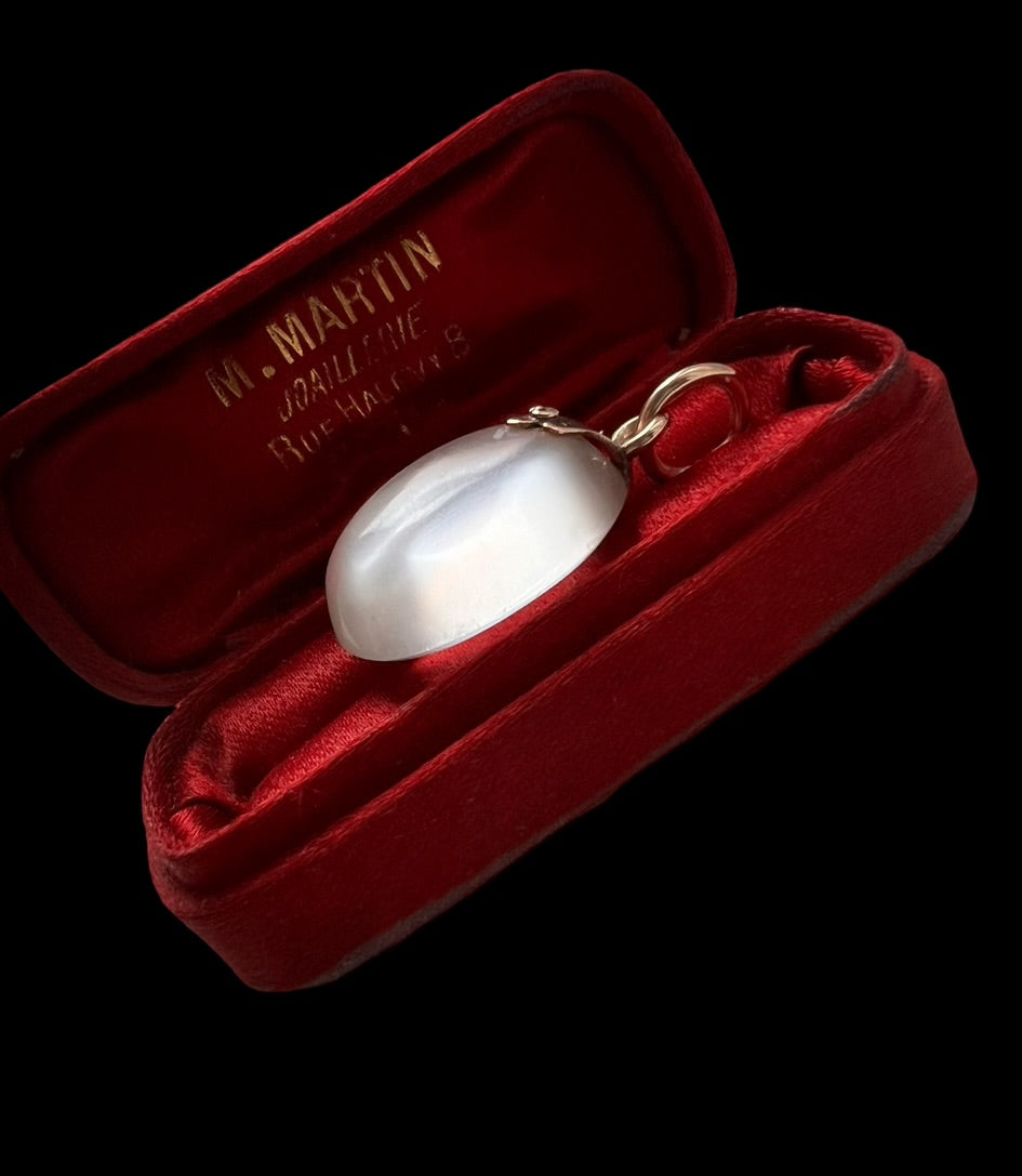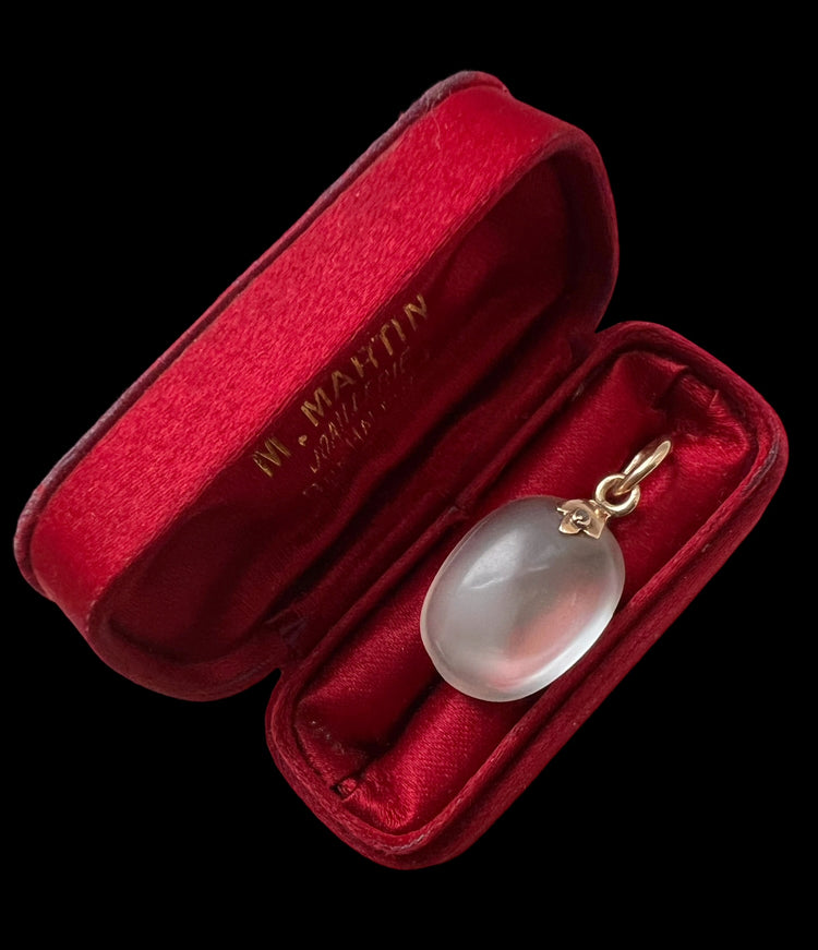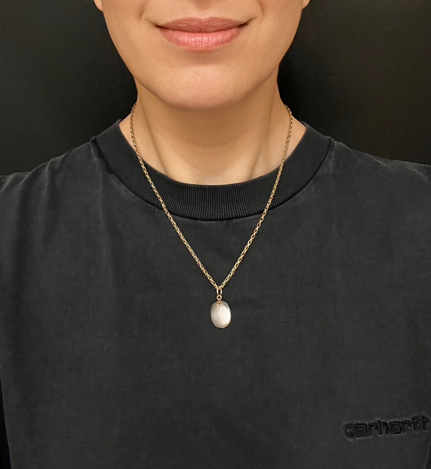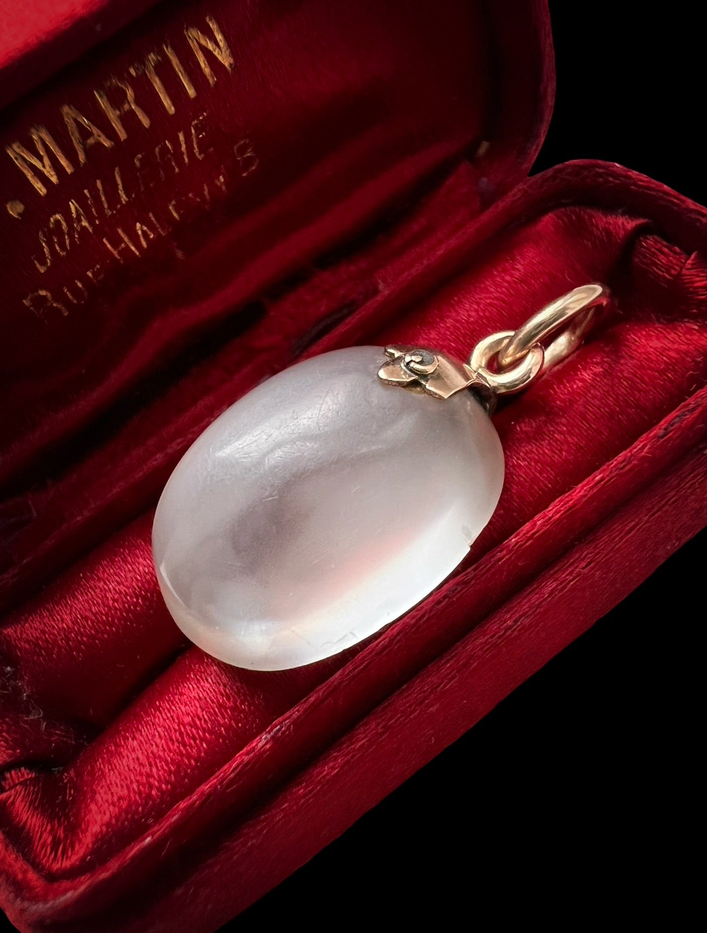 The Moonstone hangs from the original trefoil pegged bail and jump ring which are made of 9ct gold.