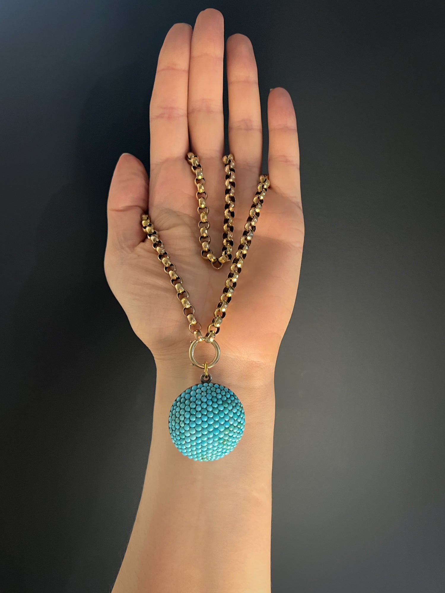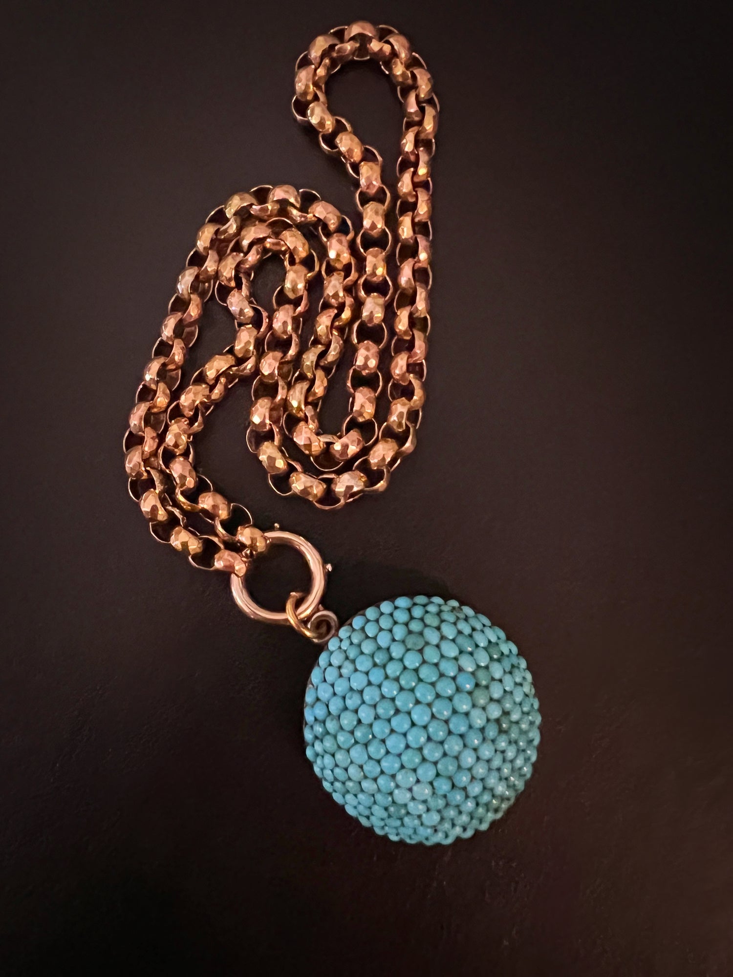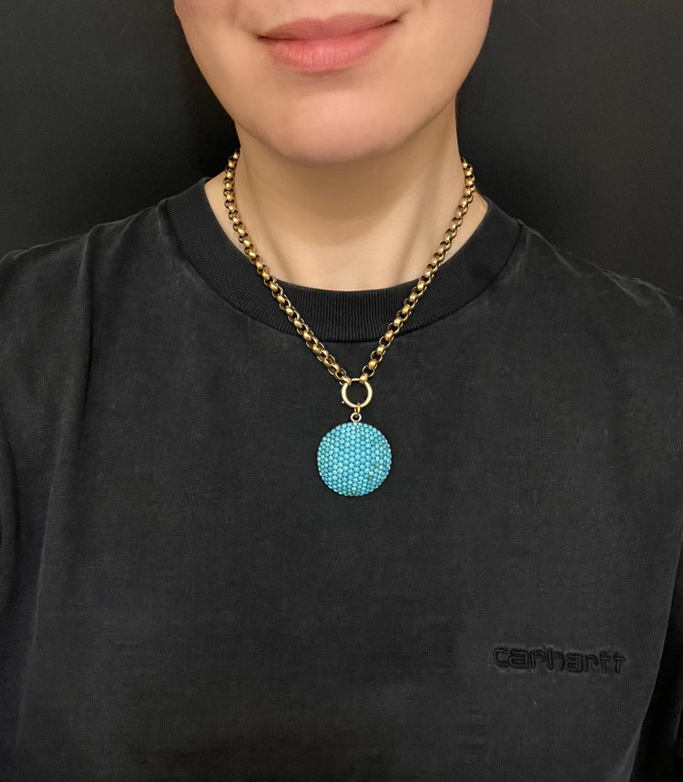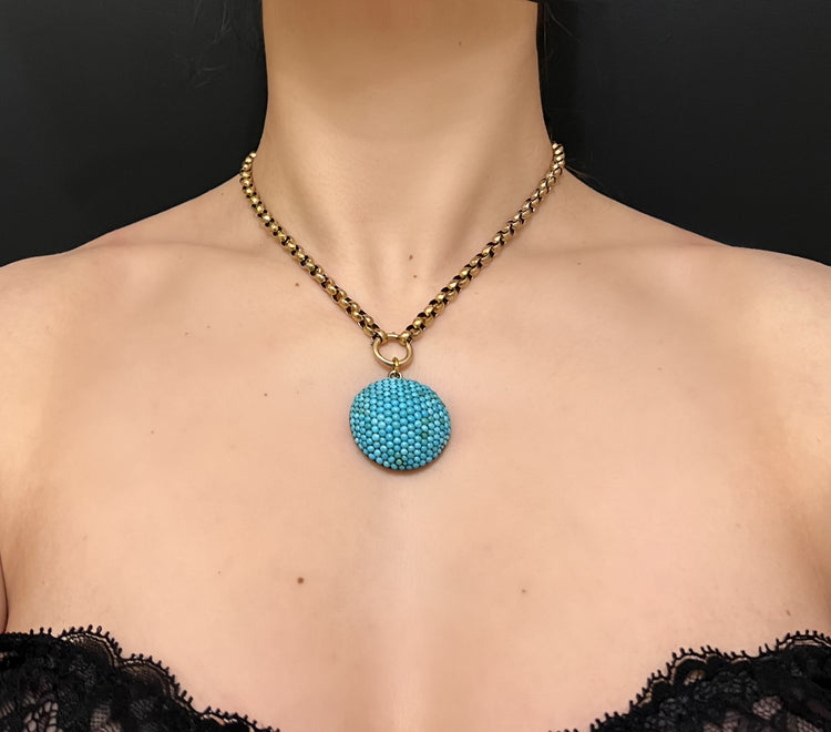 This super chunky pendant is fully pavé set with turquoise cabochons, the stones have a wonderful variation of colour from blue hues through to green.