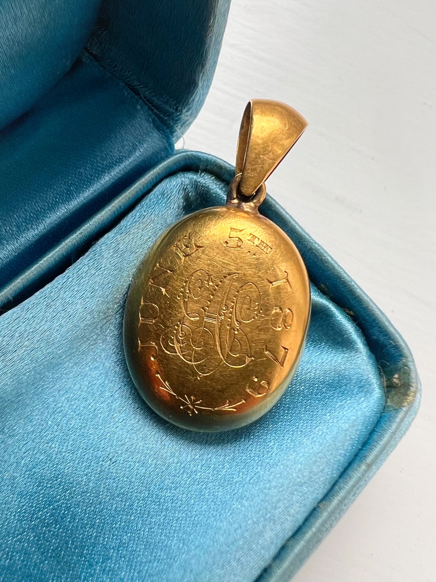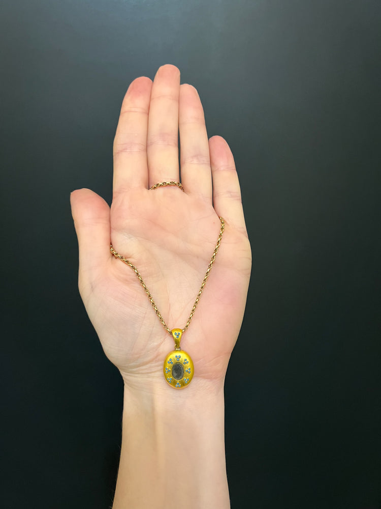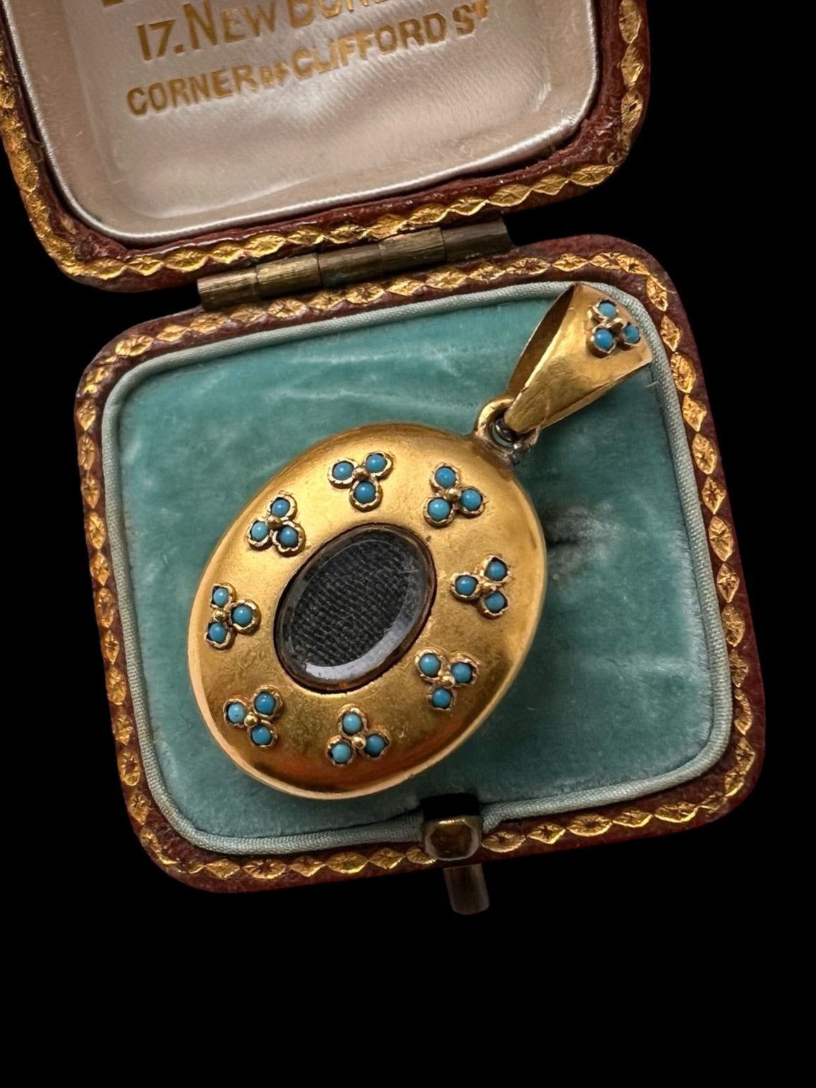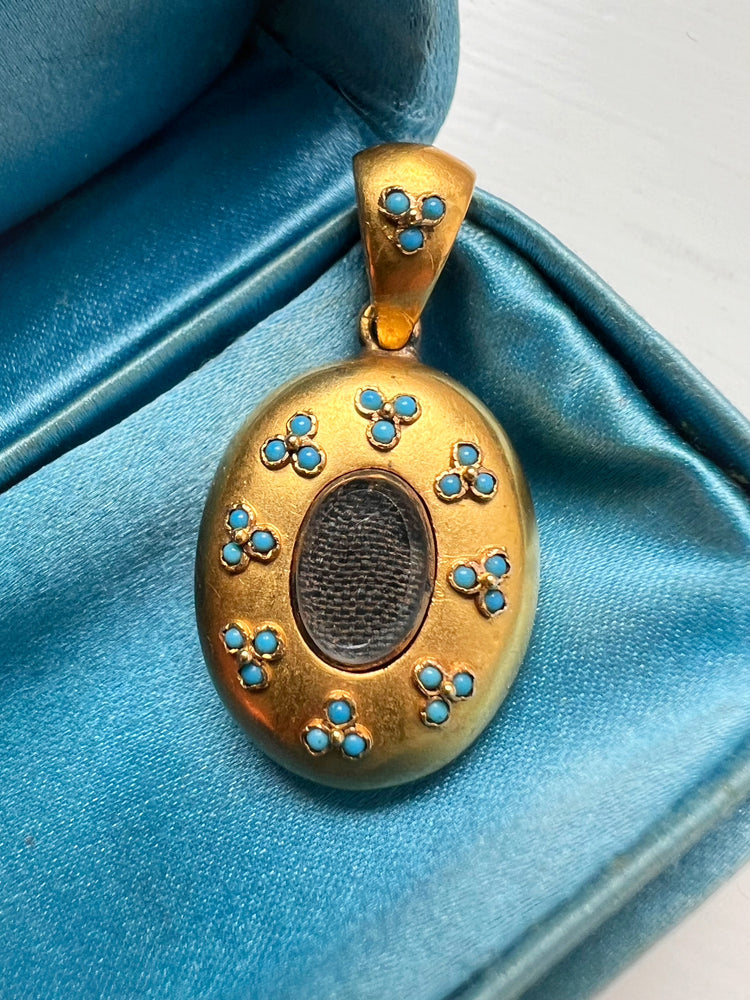 Likely a memorial pendant, for a loved one, the locket appears to contain a woven lock of hair.