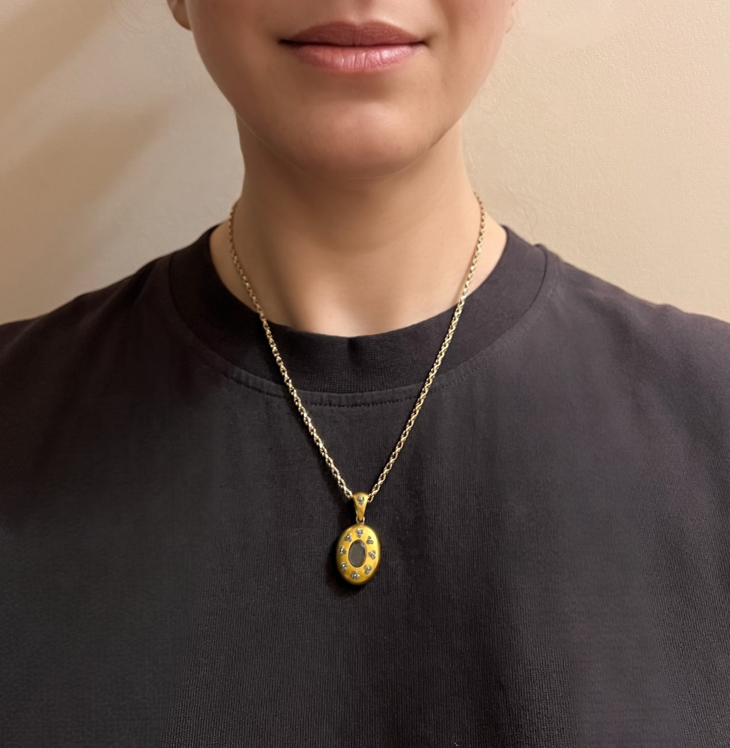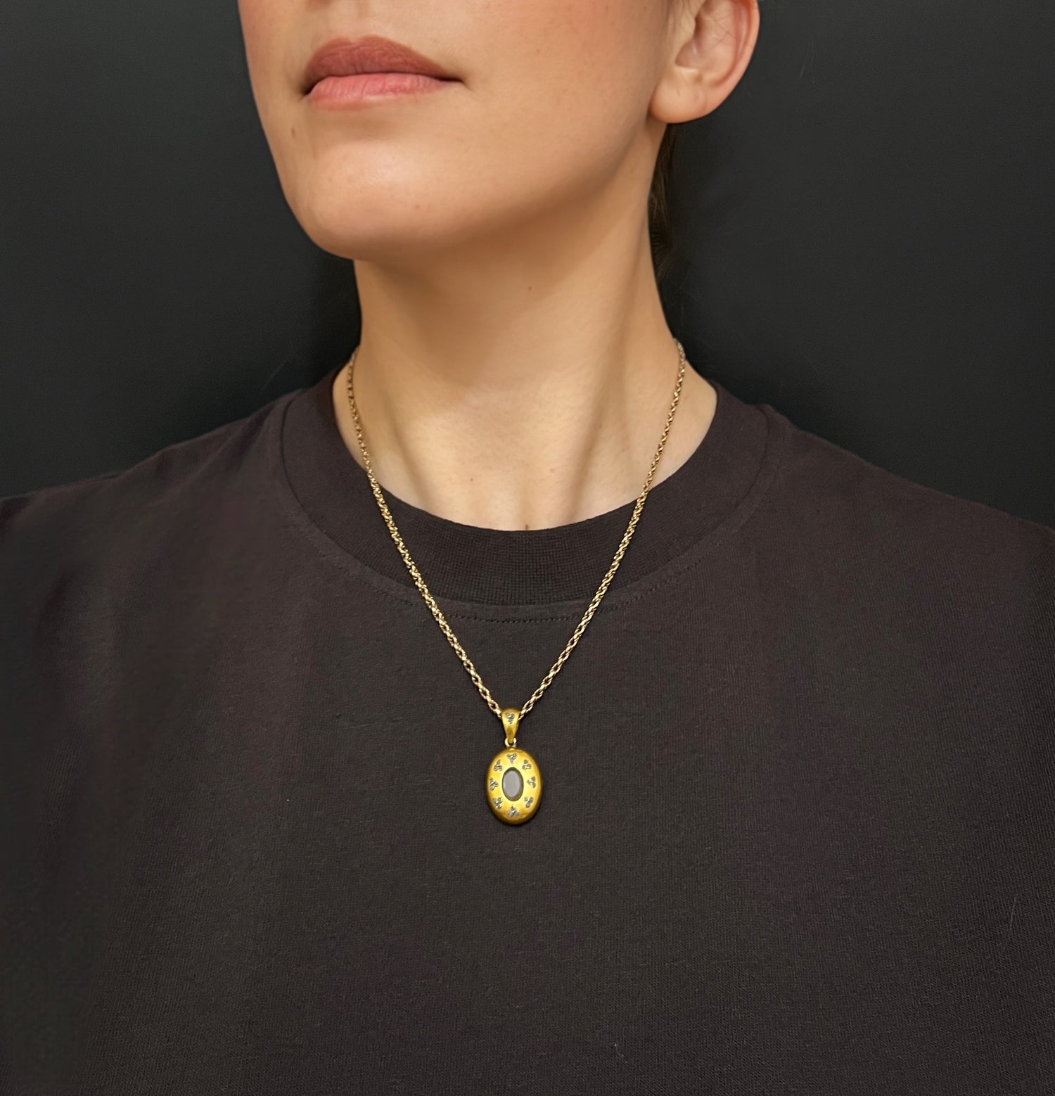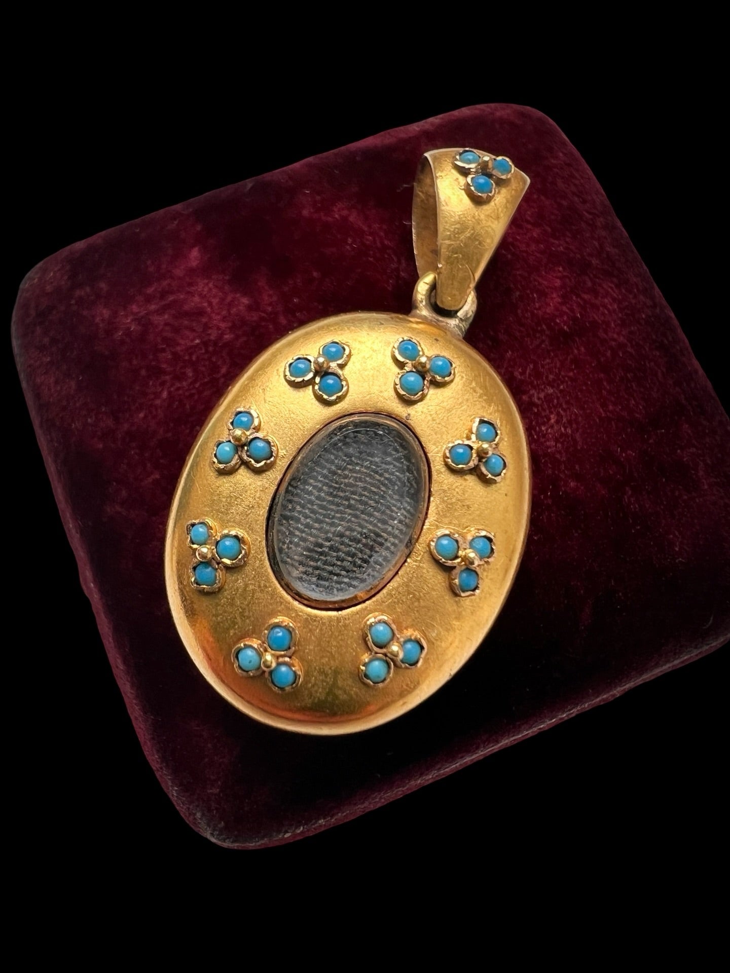 A super pretty 15ct gold oval pendant with turquoise detailing.