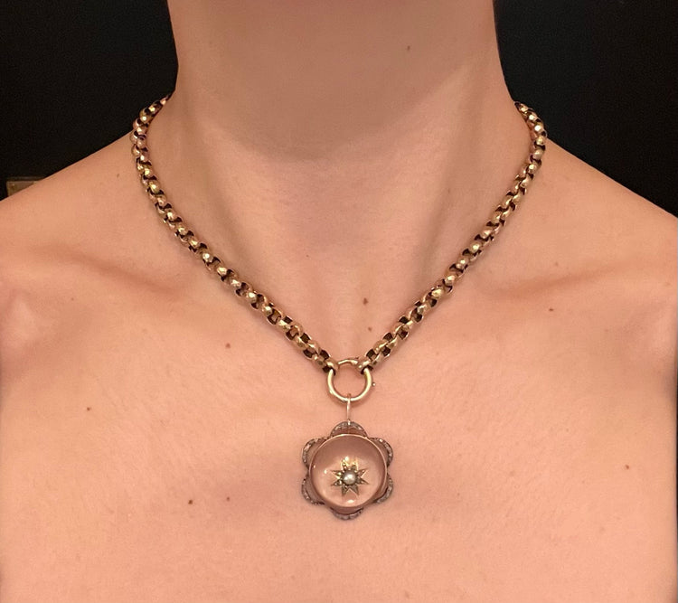 This is a gorgeous, gorgeous, gorgeous, Victorian Rock Crystal pendant surrounded by an unusual diamond encrusted rim, which is shaped like the petals of a flower.