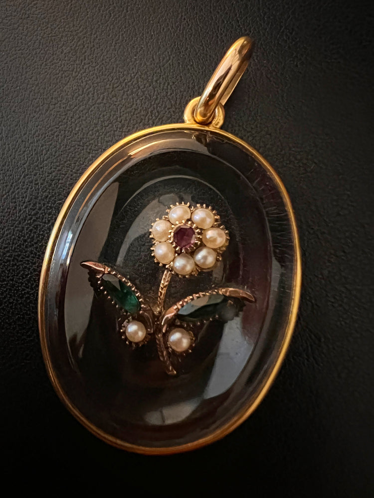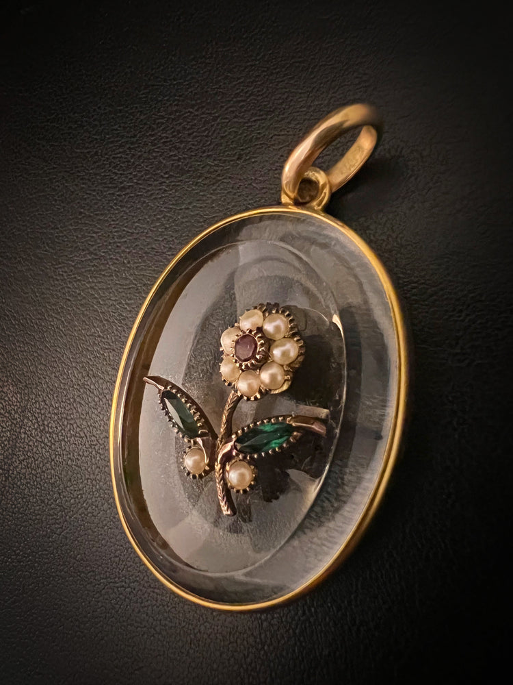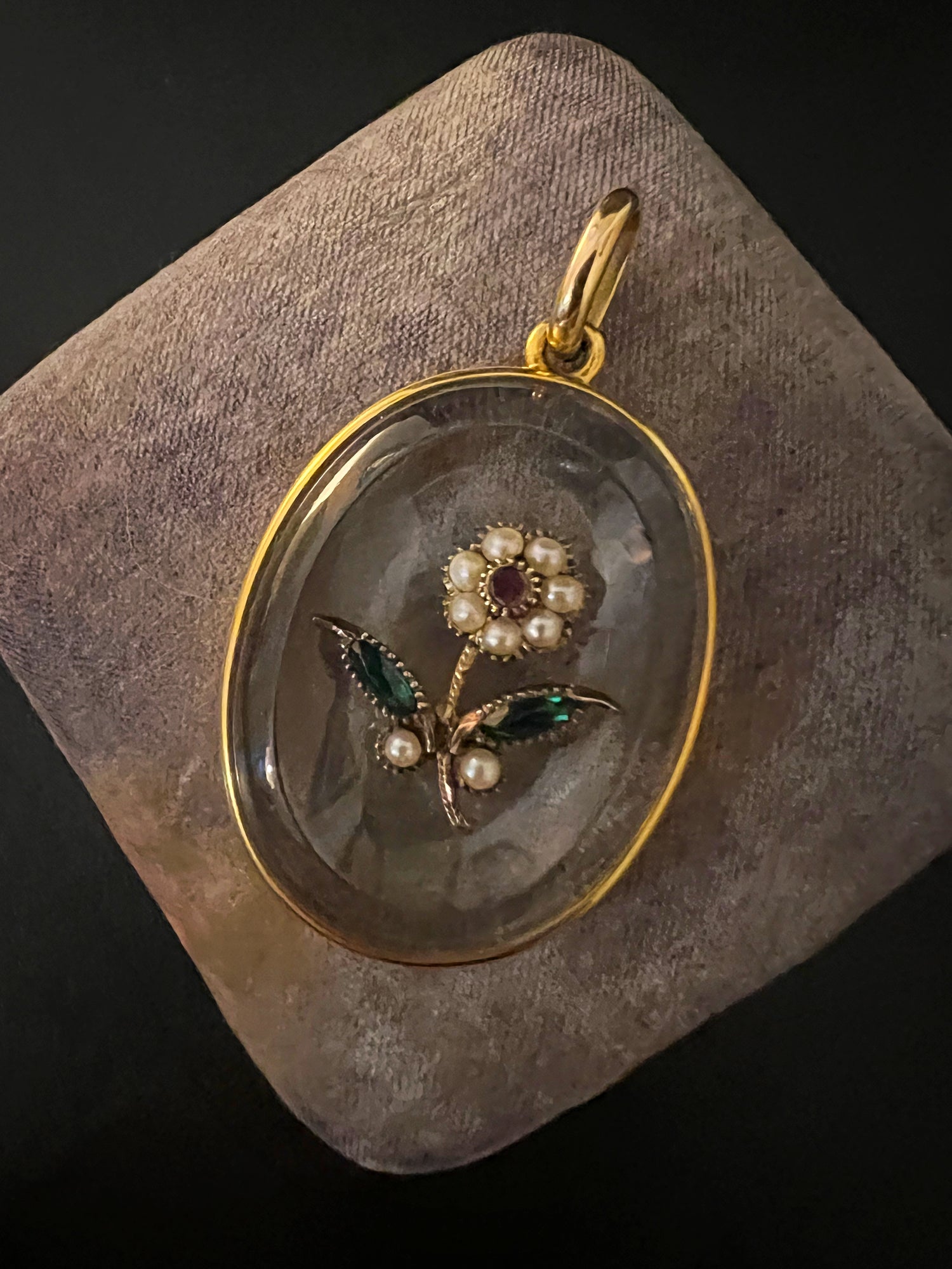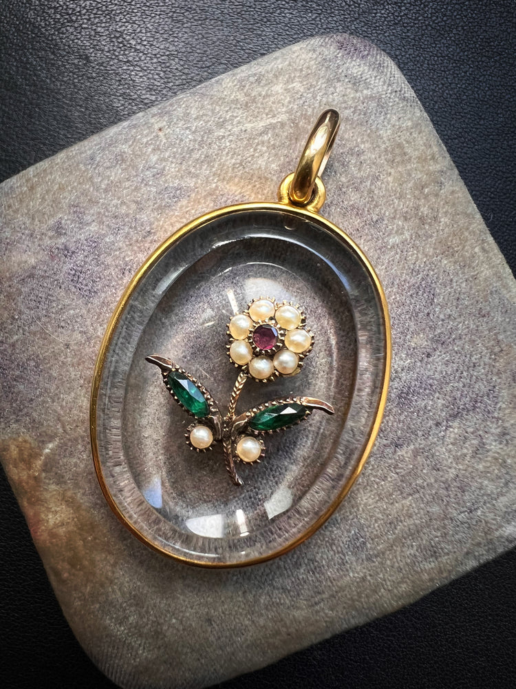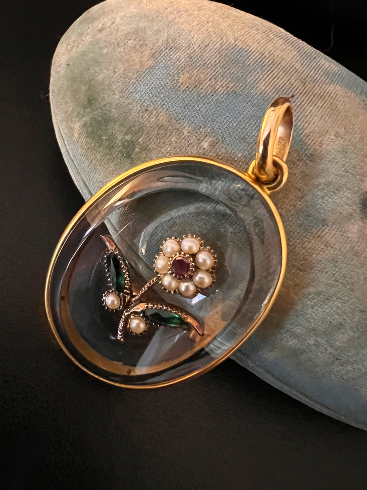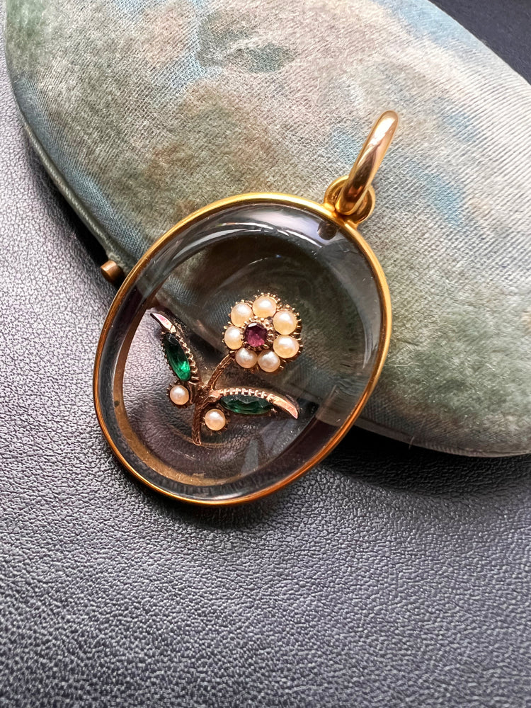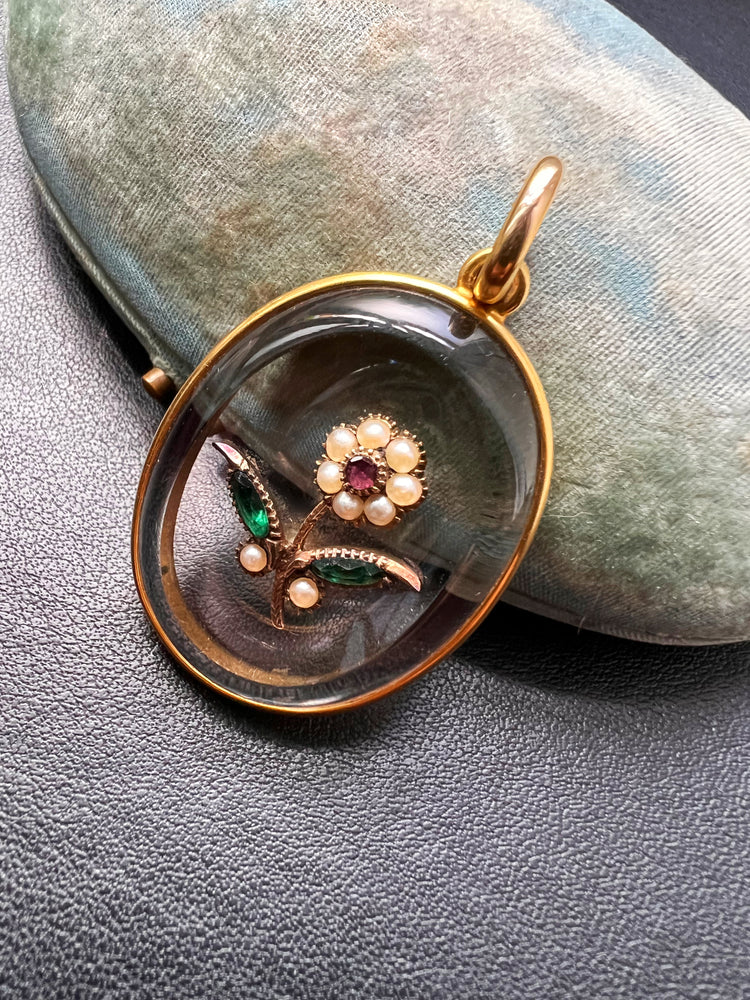 VICTORIAN ROCK CRYSTAL PENDANT WITH PEARL, EMERALD & RUBY DAISY FLOWER