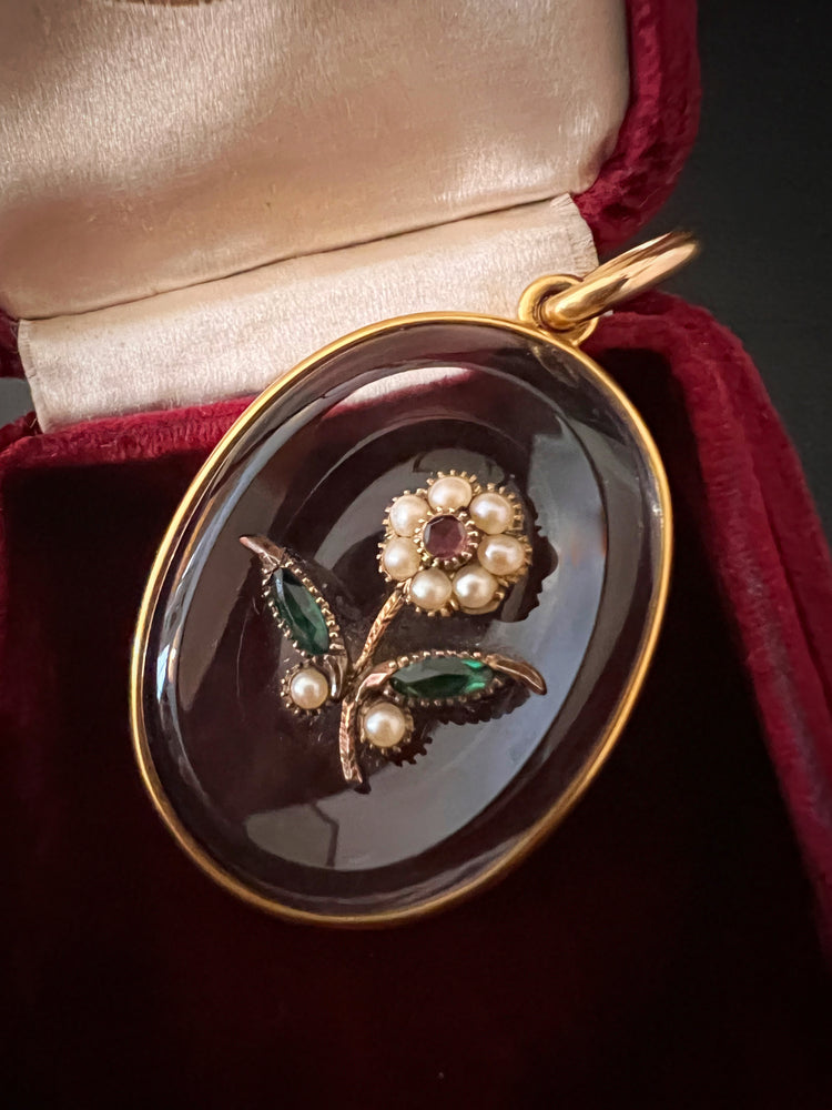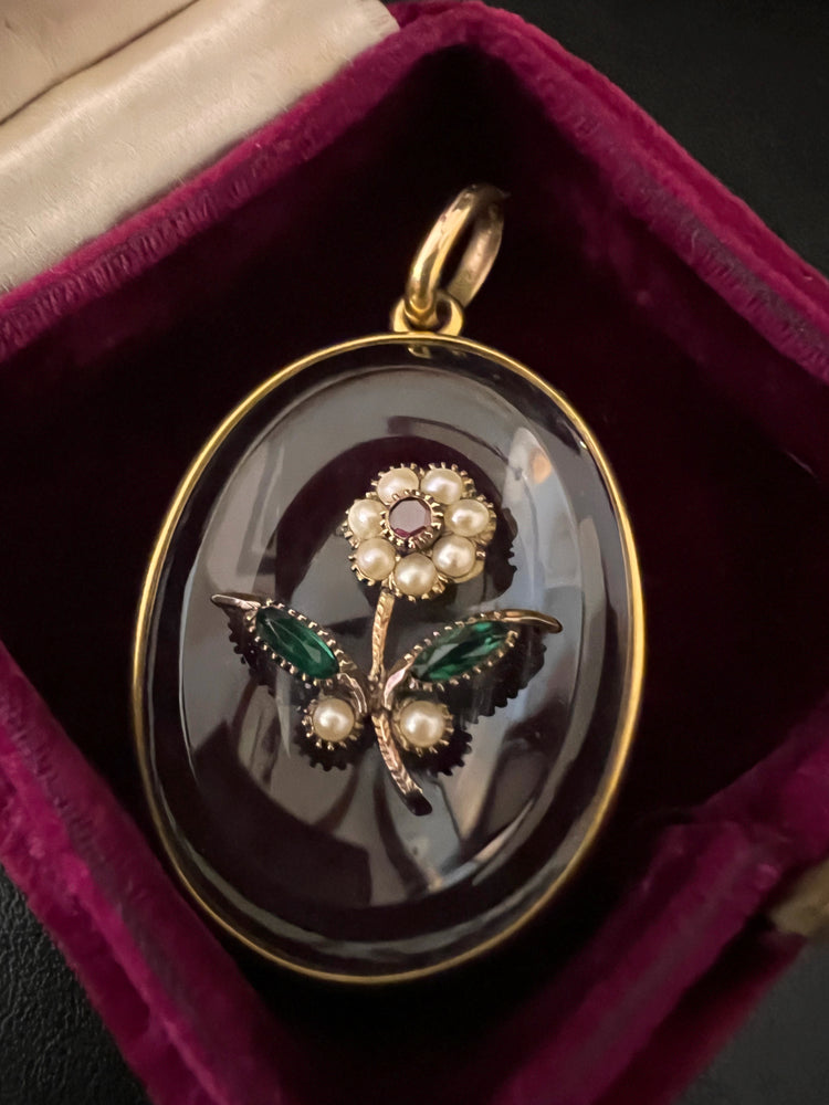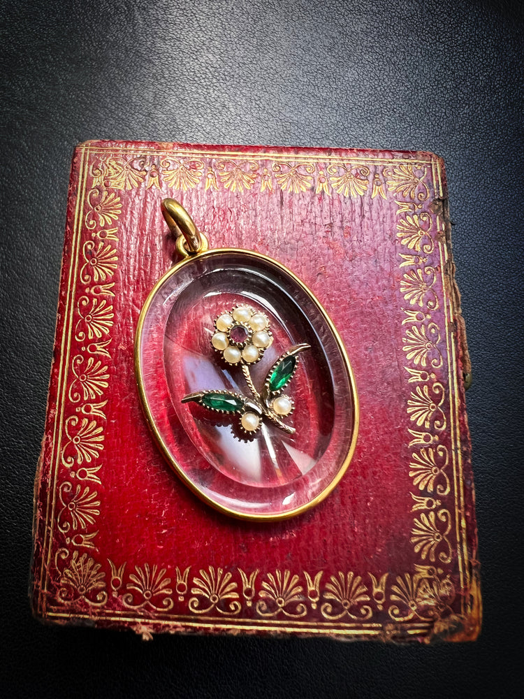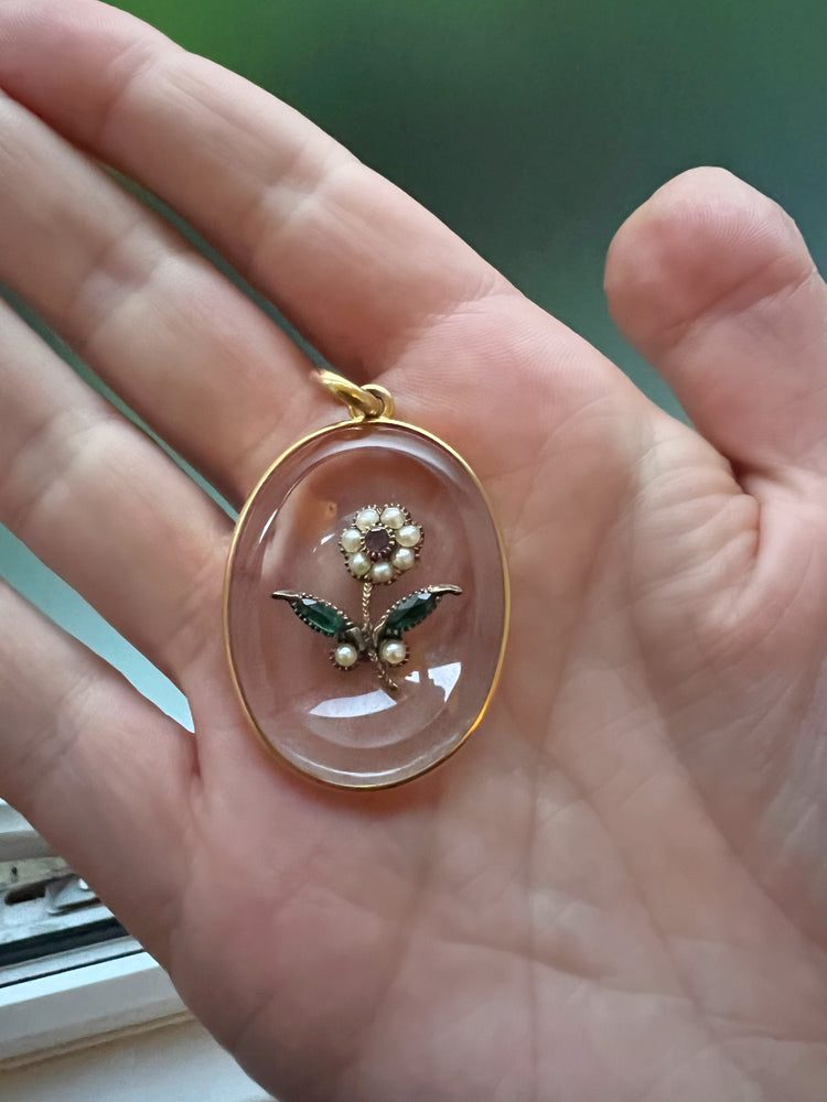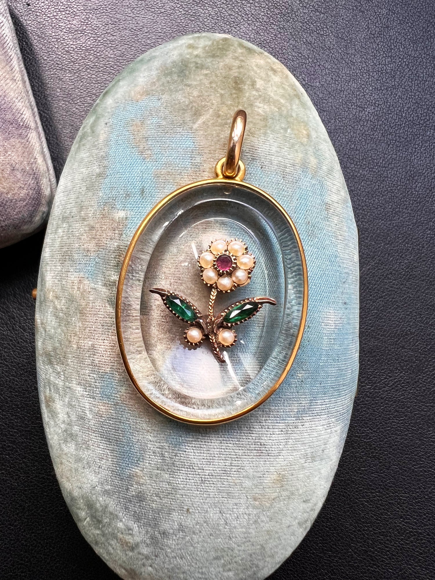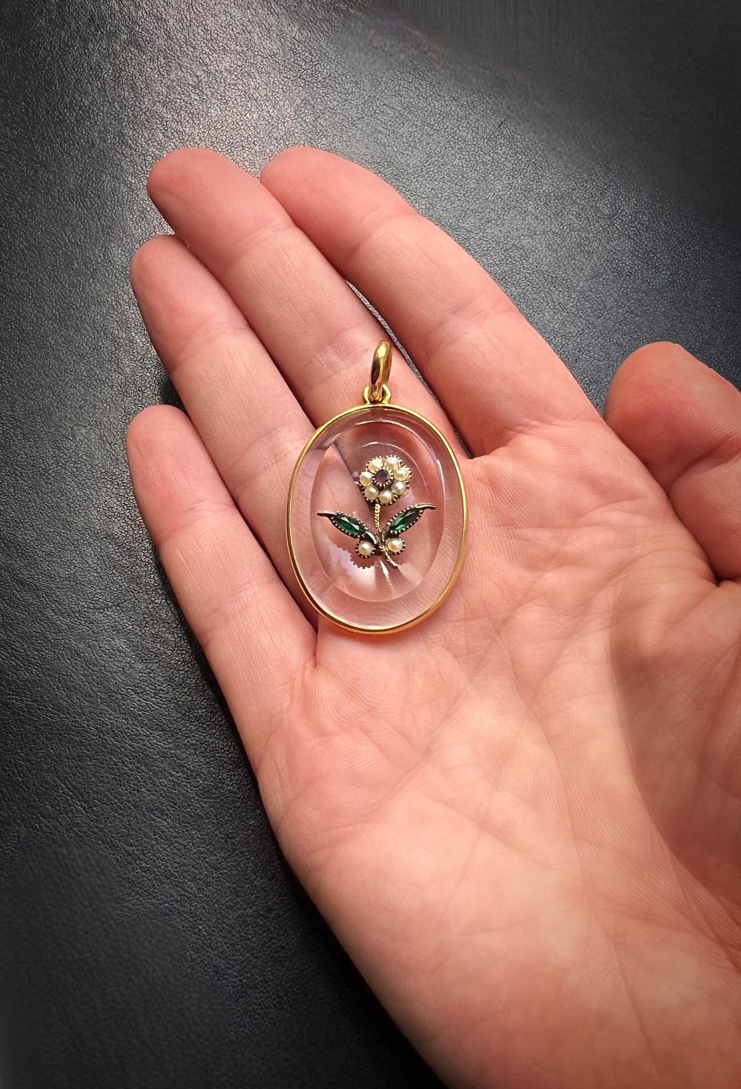 VICTORIAN ROCK CRYSTAL PENDANT WITH PEARL, EMERALD & RUBY DAISY FLOWER