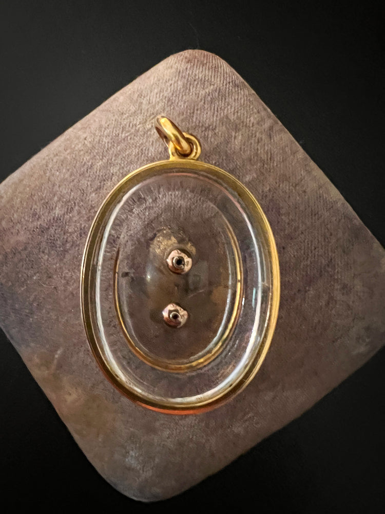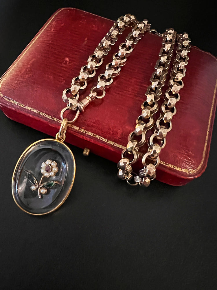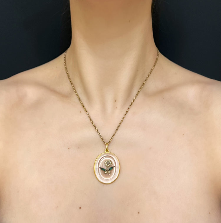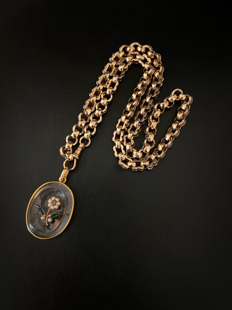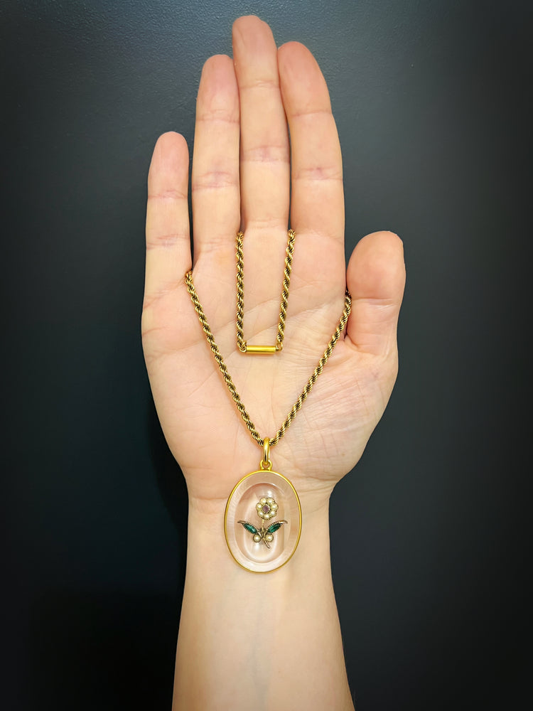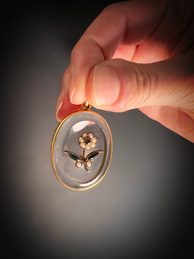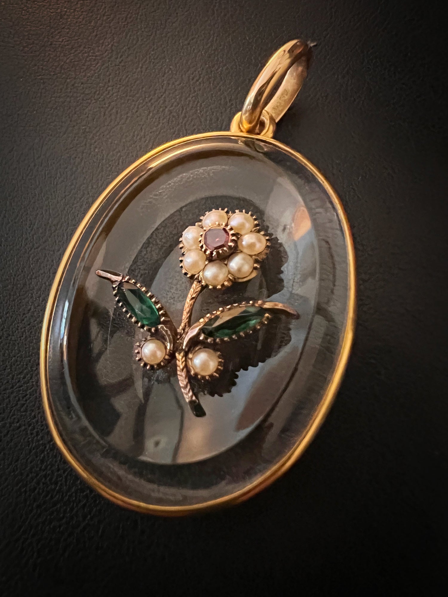 VICTORIAN ROCK CRYSTAL PENDANT WITH PEARL, EMERALD & RUBY DAISY FLOWER