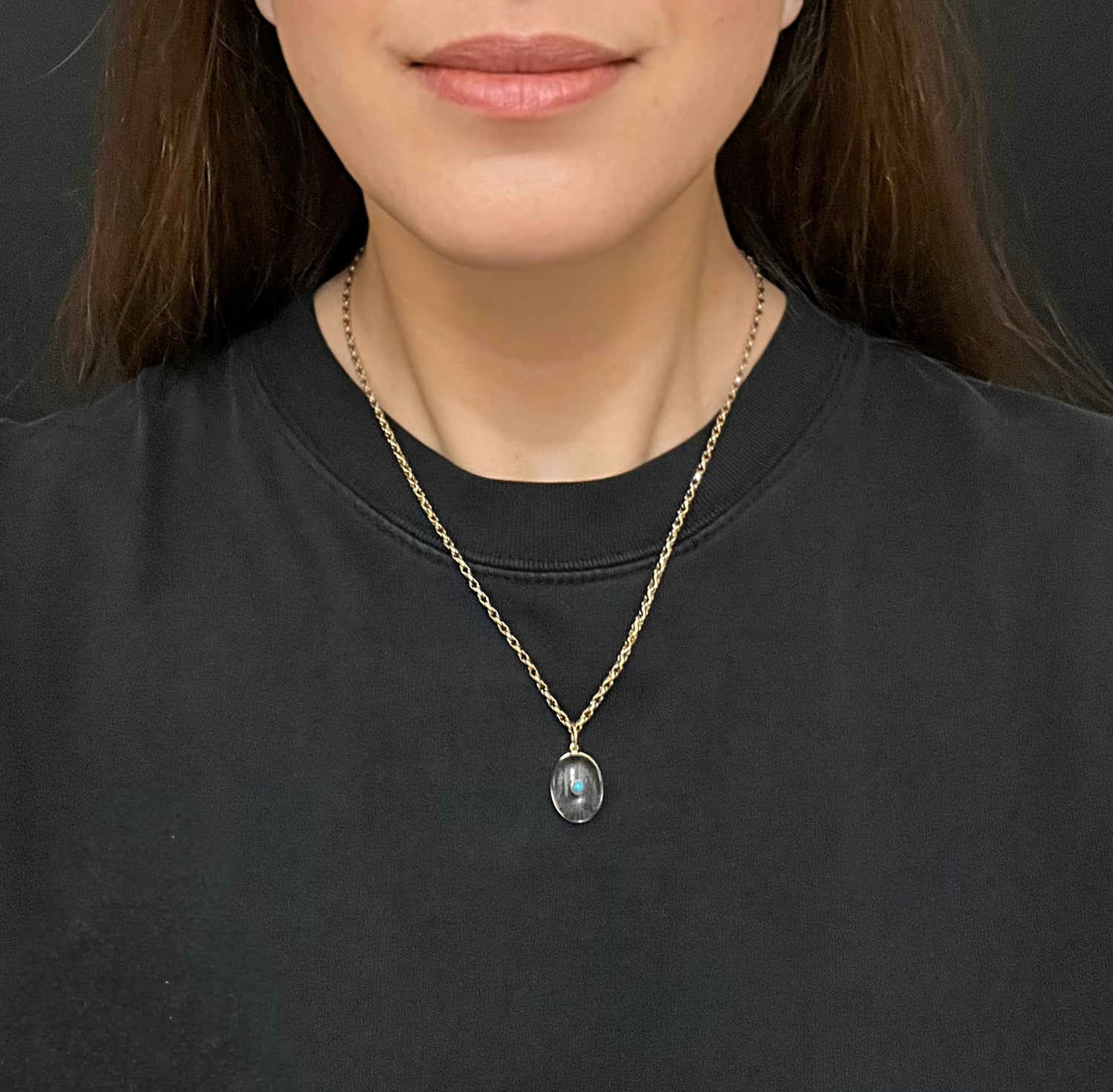 The domed rock crystal is set in a simple 9ct gold frame, and hangs from a large 9ct gold jump ring, which makes it so easy to add to any size chain.