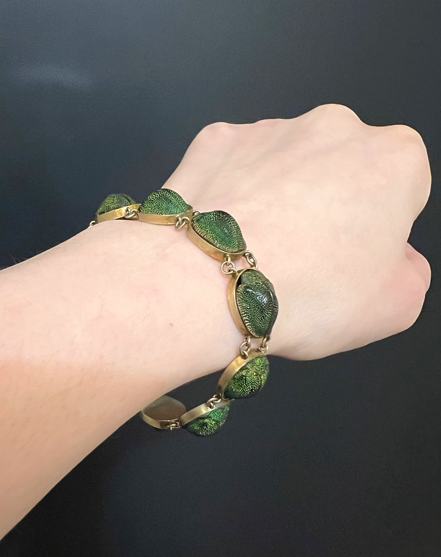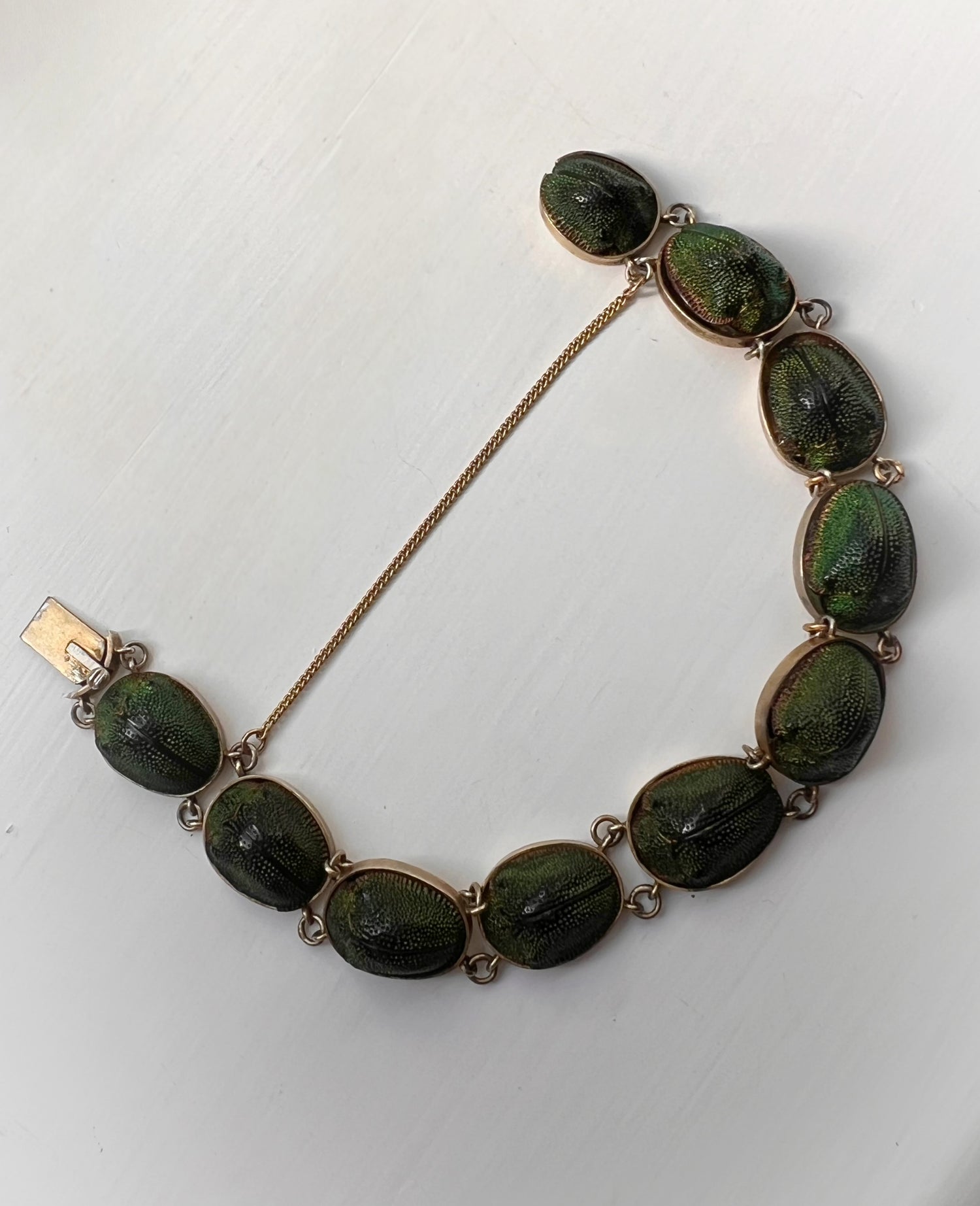 The bracelet is made of ten beetles that have fabulous natural bright green luminescent shells, which are all in amazing condition.