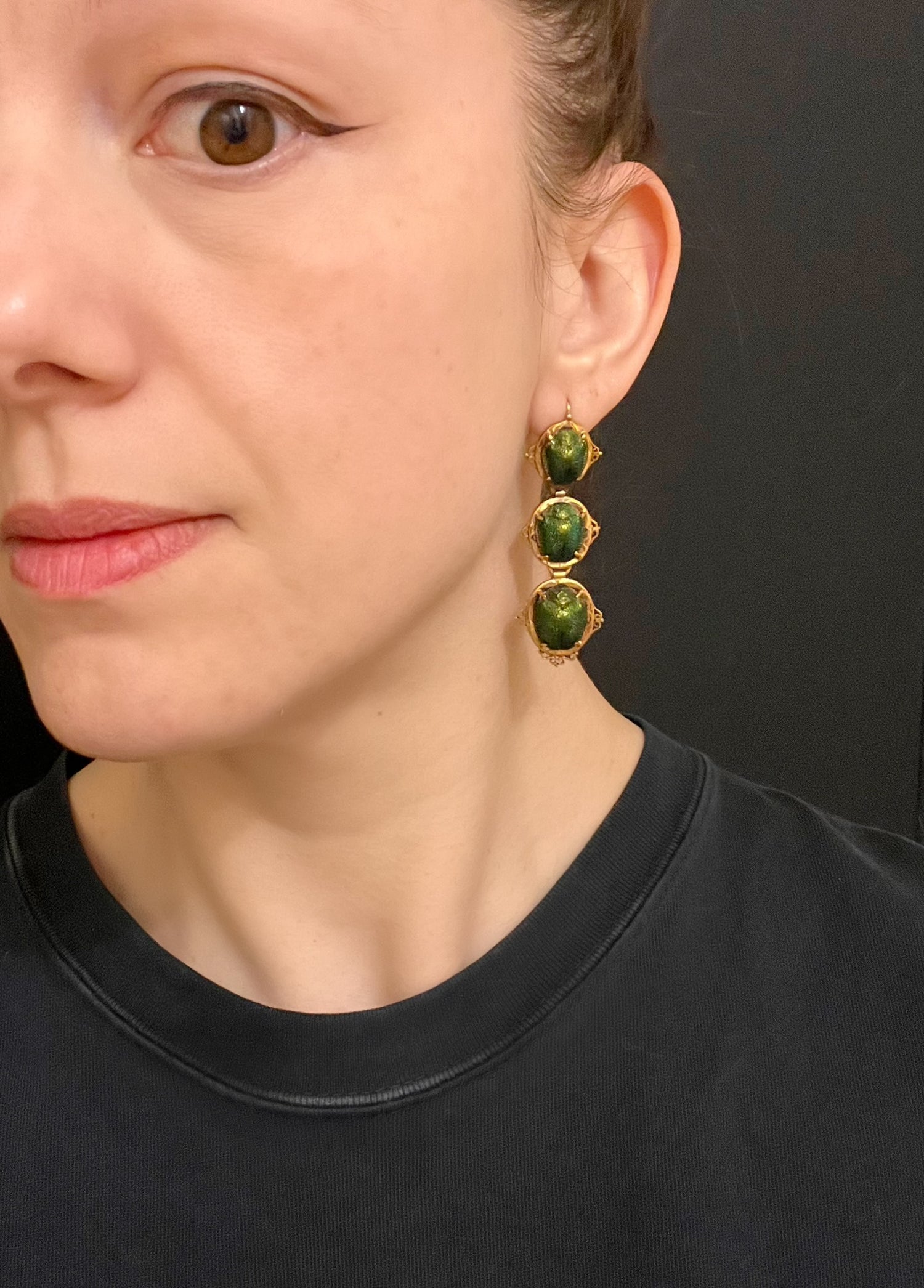 The earrings are made of three beautiful scarab beetles that graduate in size, with the smallest at the top, graduating to the largest at the bottom.