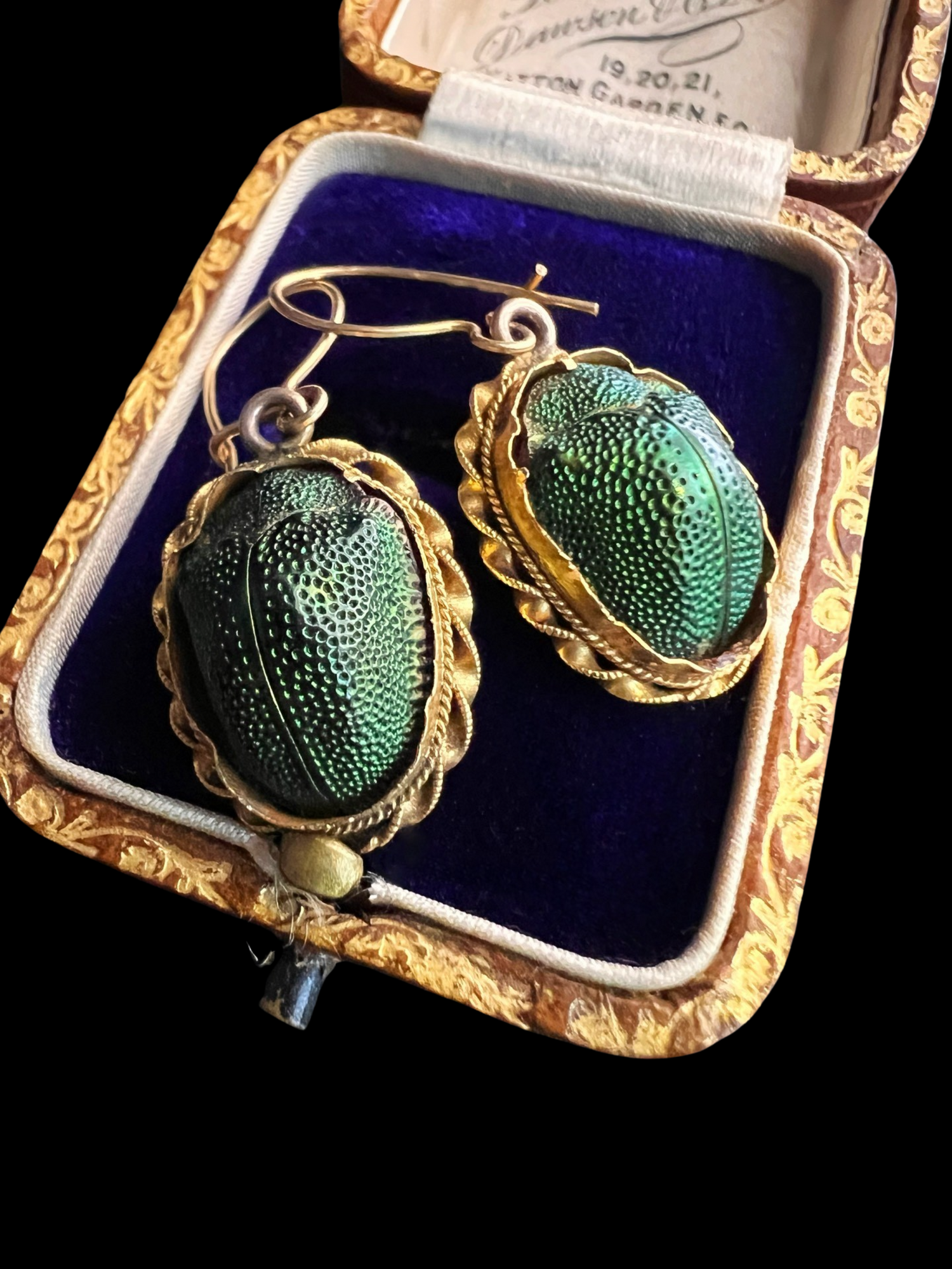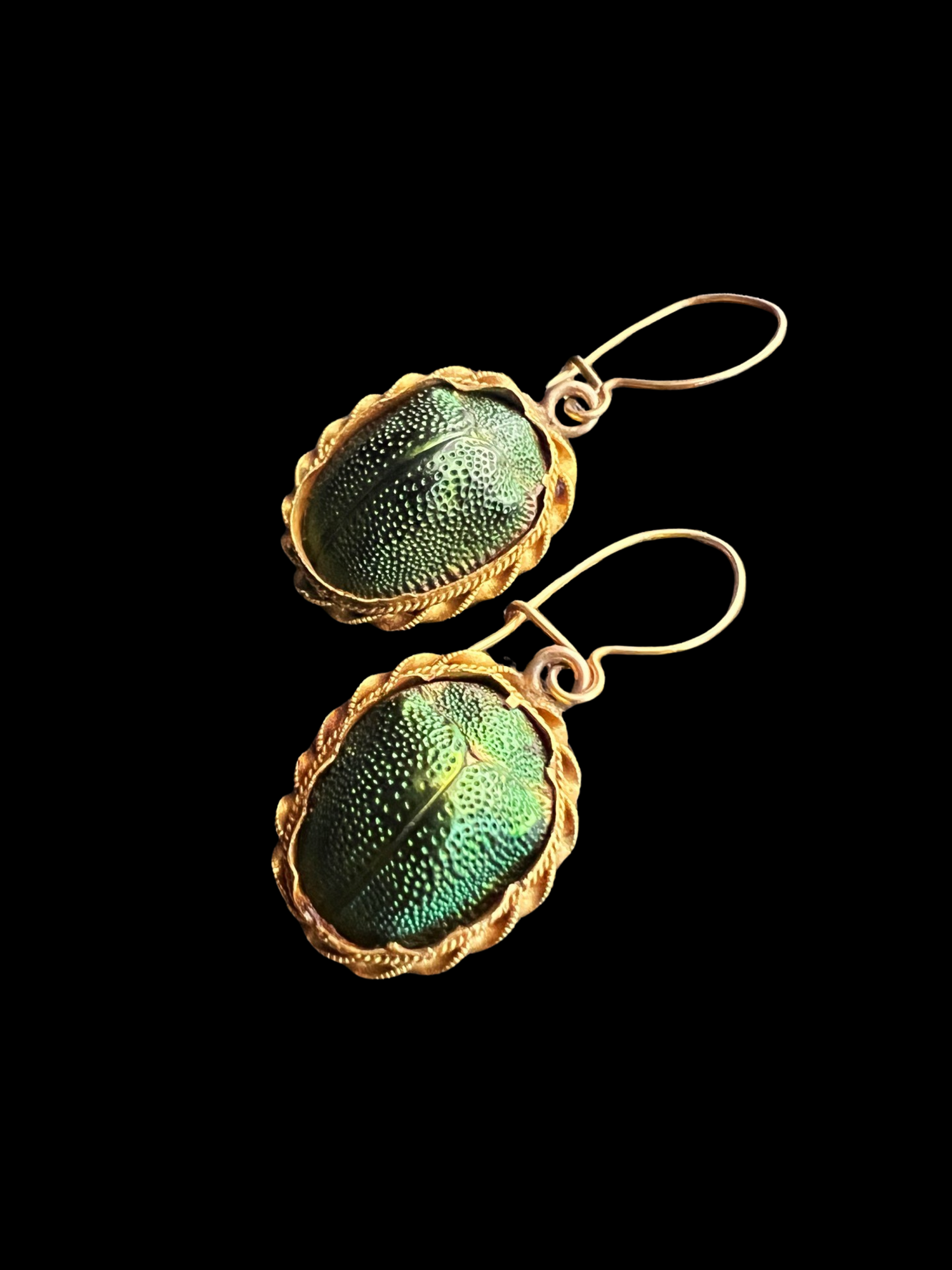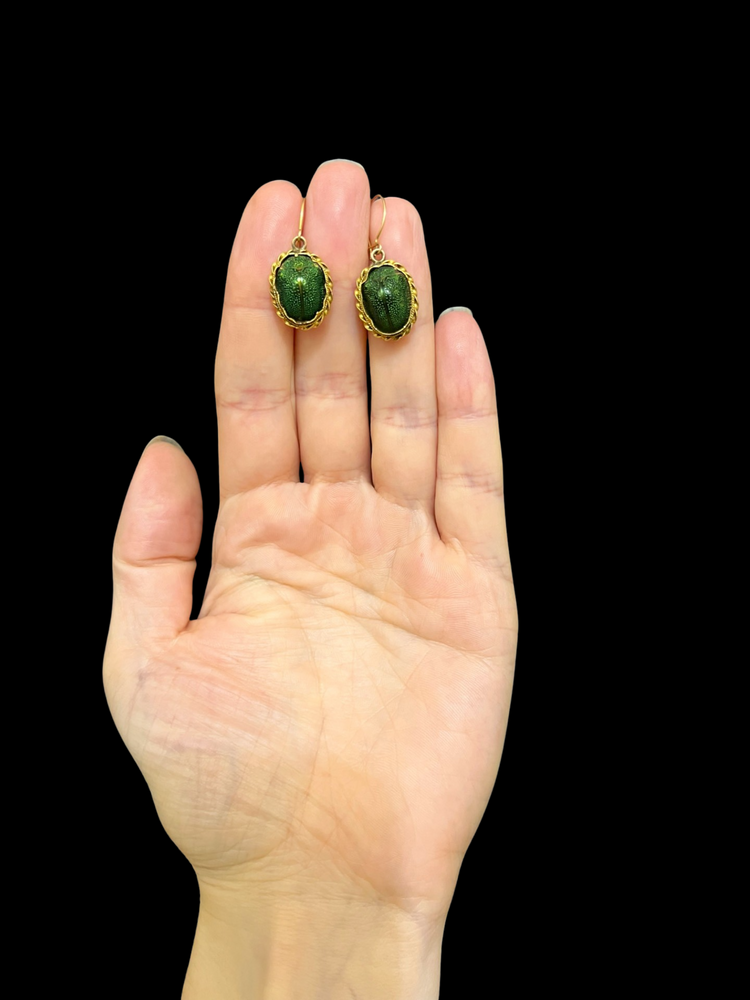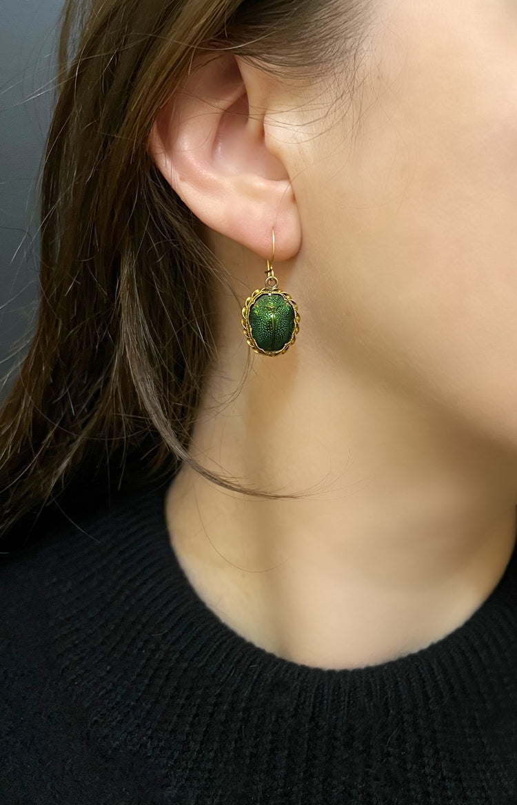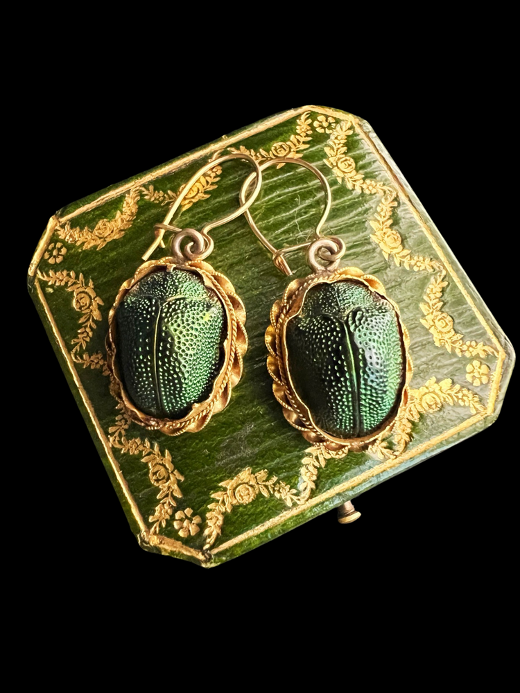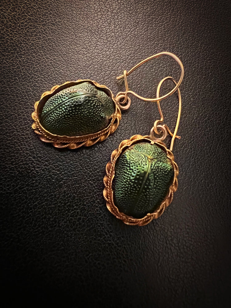 The earrings are made of two perfectly preserved scarab beetles, which are set in high carat gold mounts, with a rope-twist border.