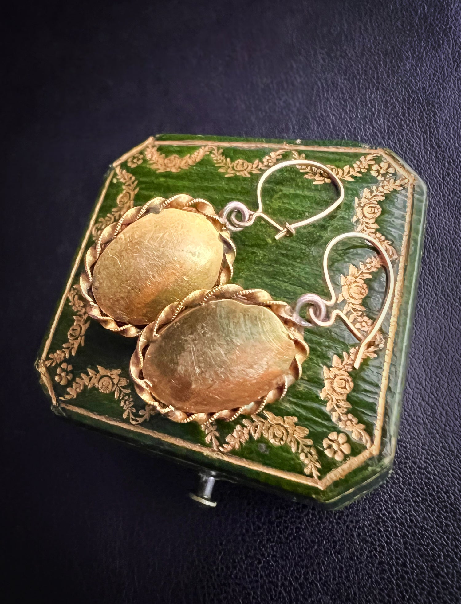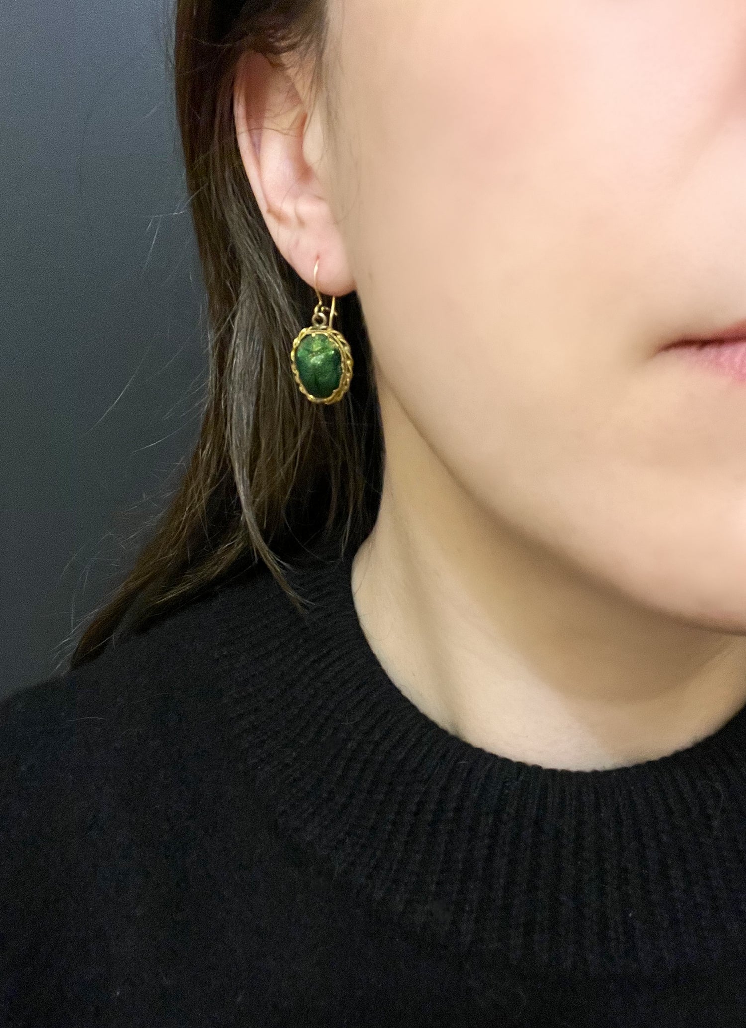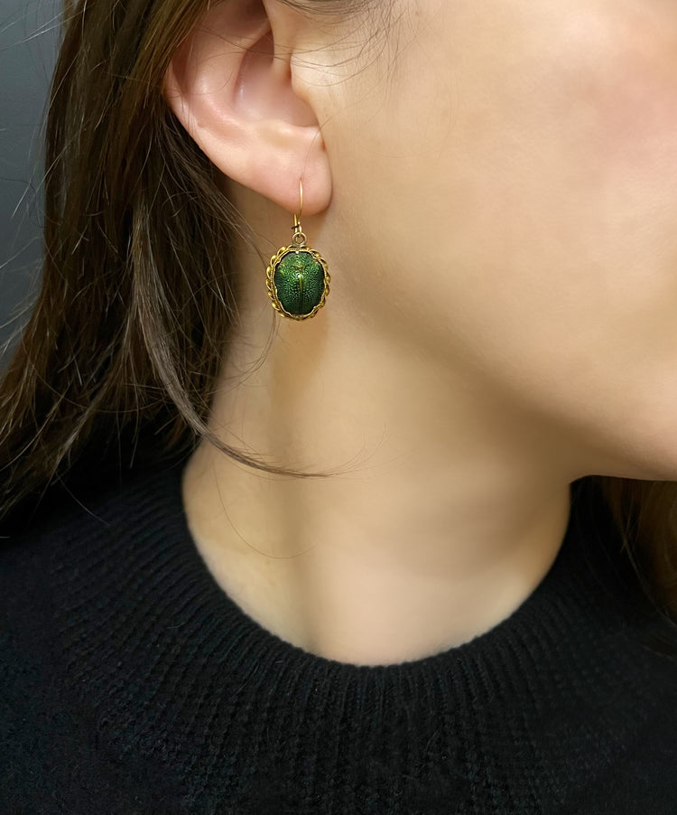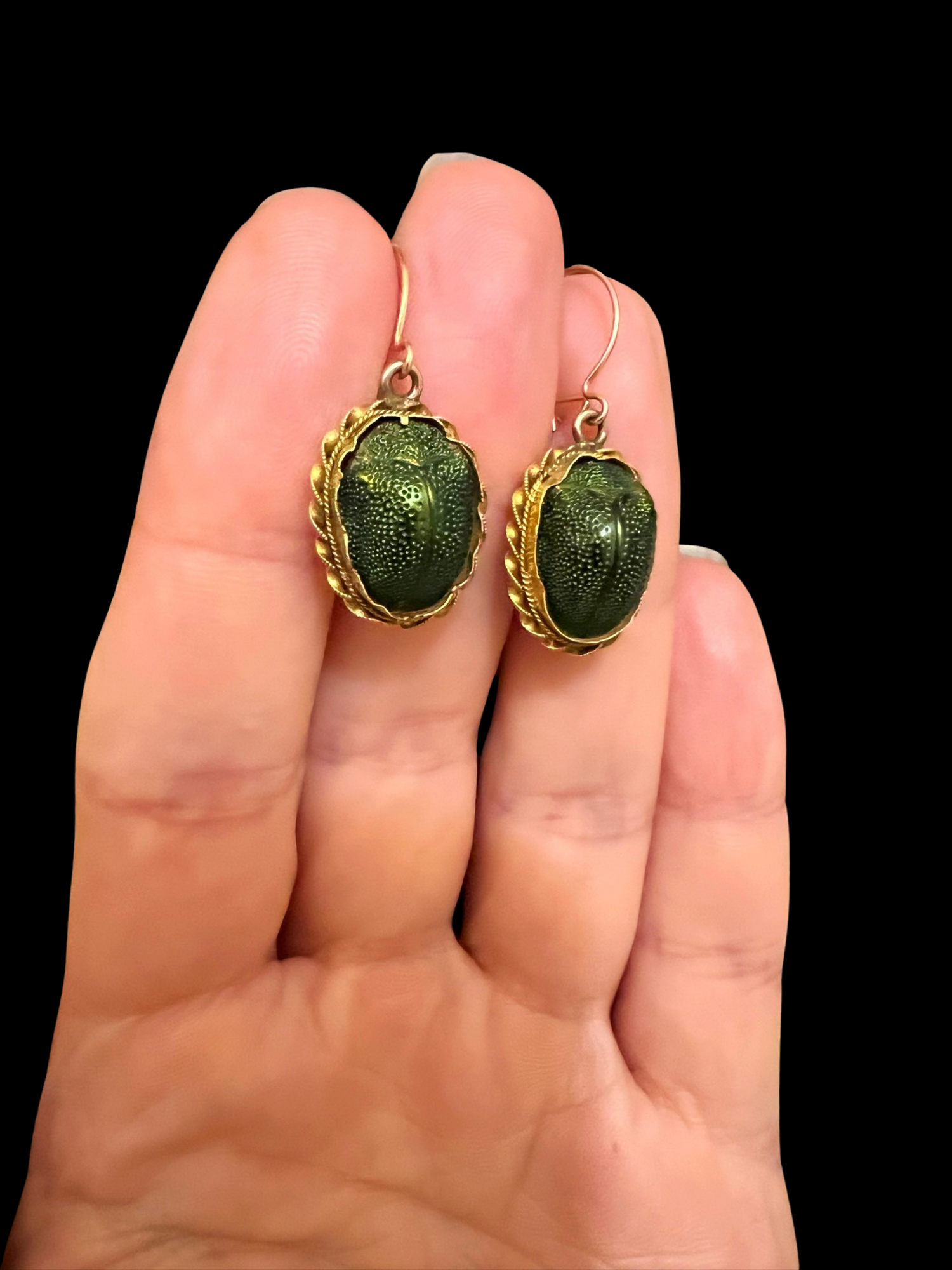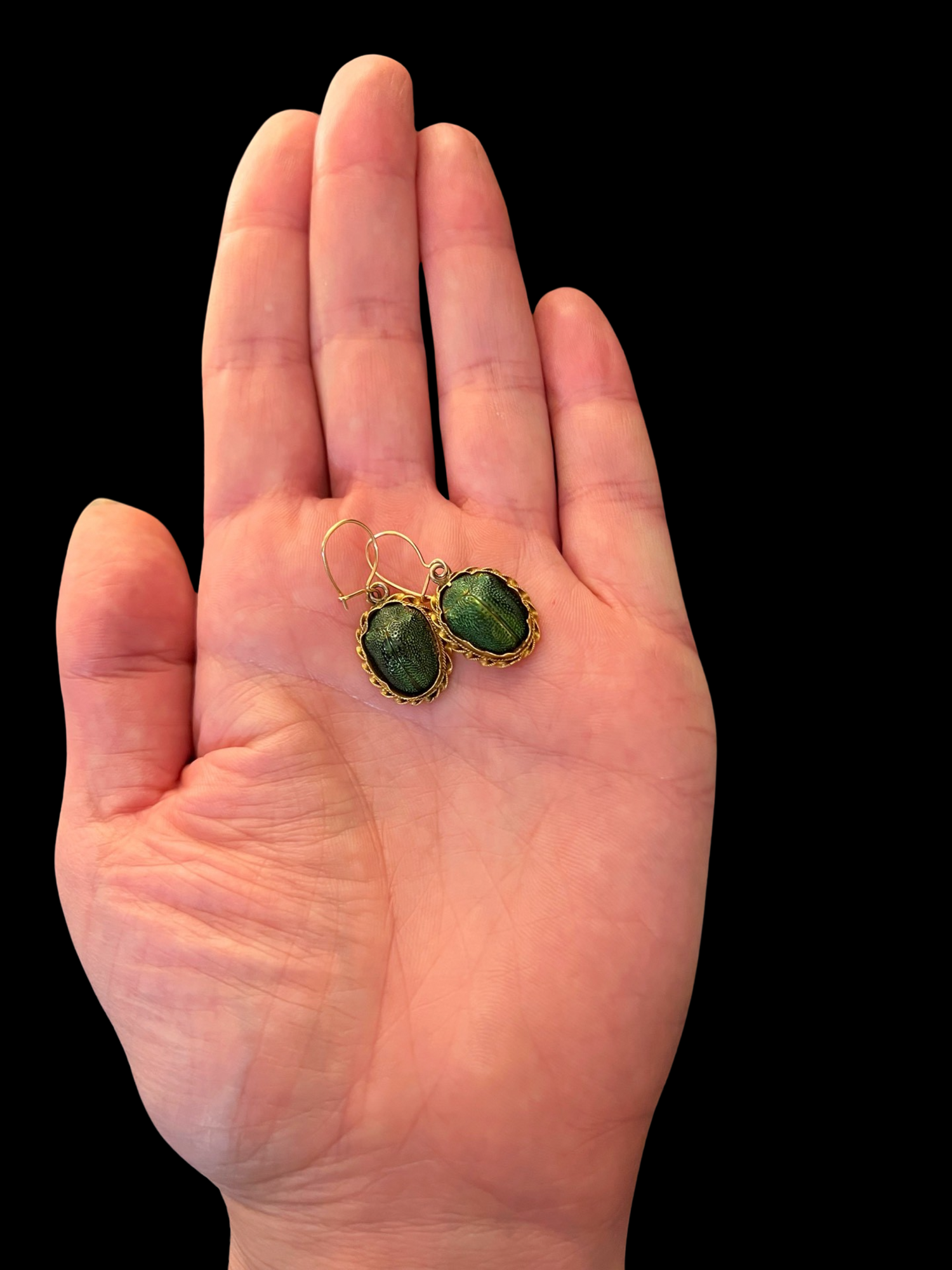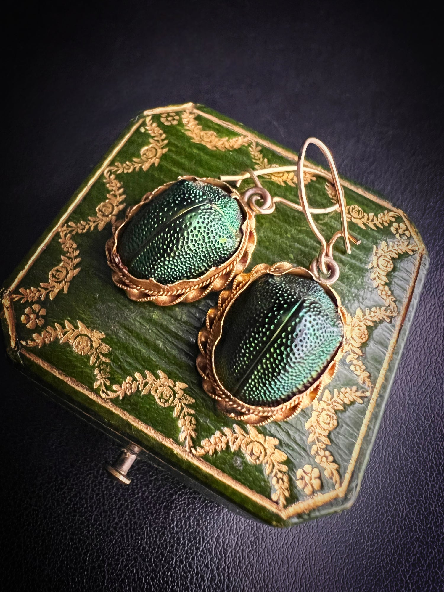The earrings are made of two perfectly preserved scarab beetles, which are set in high carat gold mounts, with a rope-twist border.