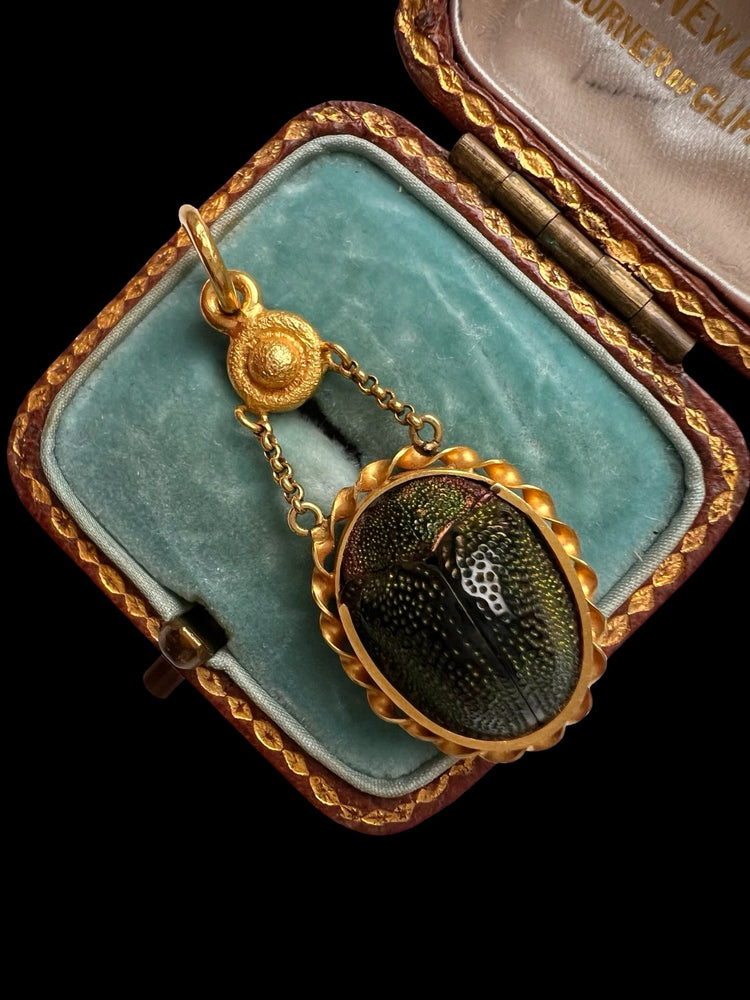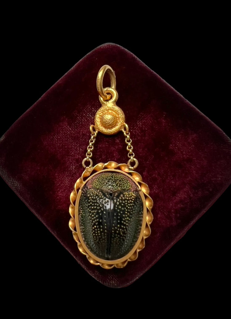 A gorgeous Victorian scarab beetle pendant with a pretty 15ct gold frame and bail.