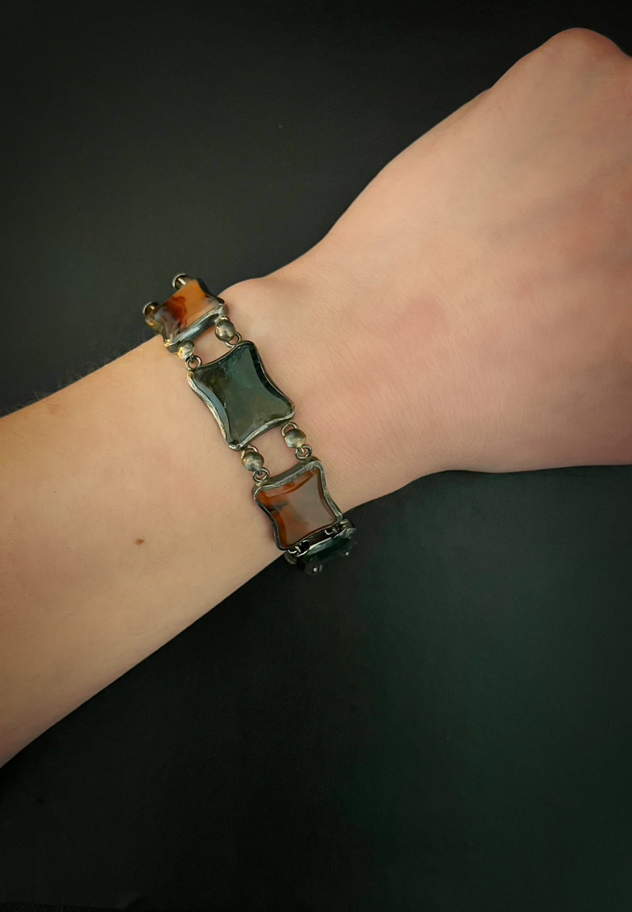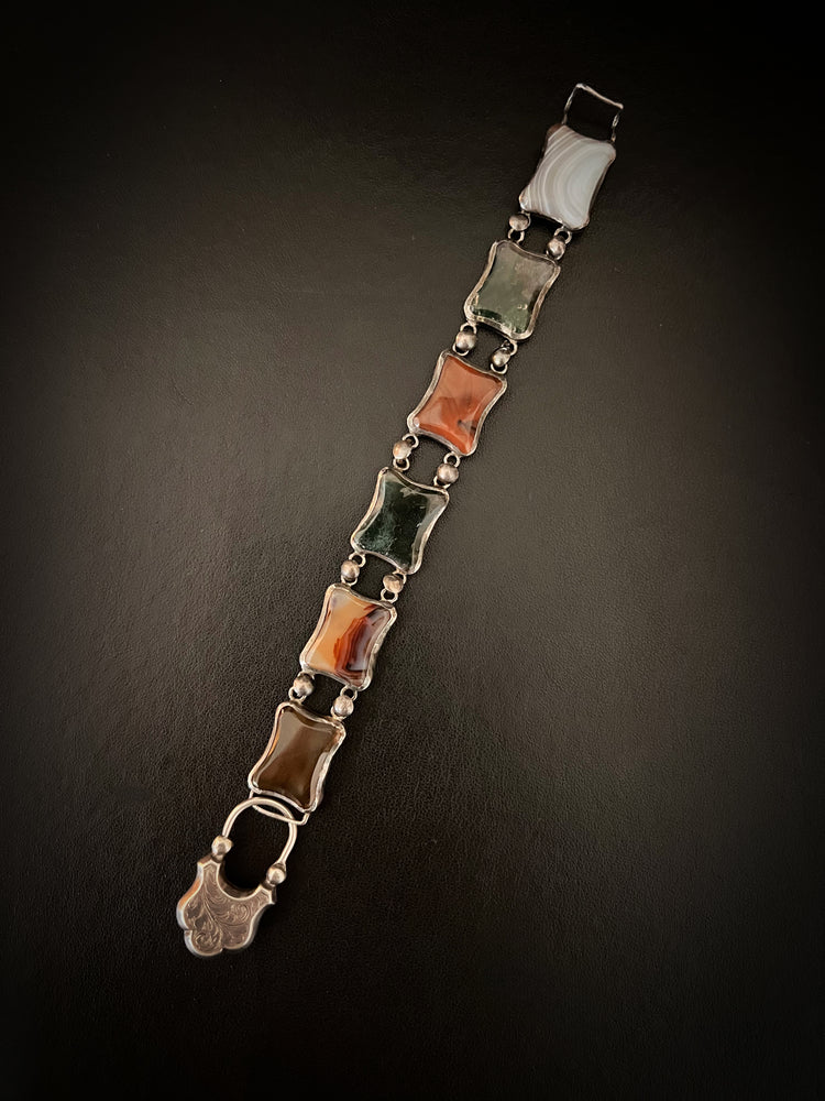 The bracelet is made up of six shield shaped pieces of agate set in silver.