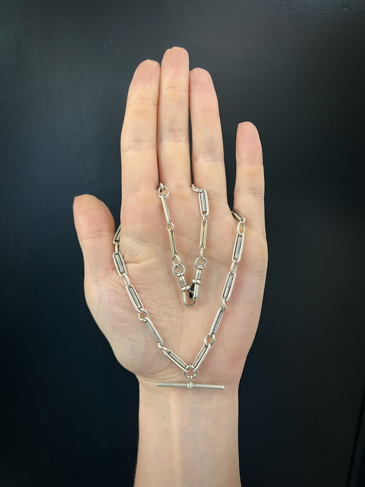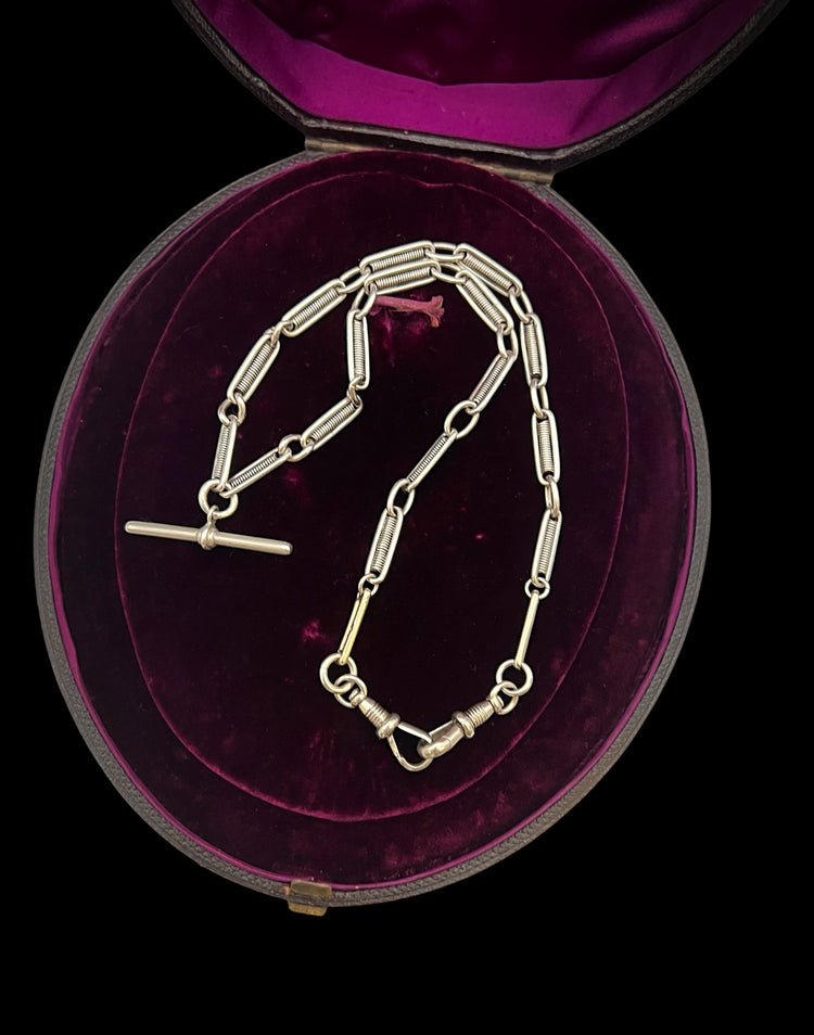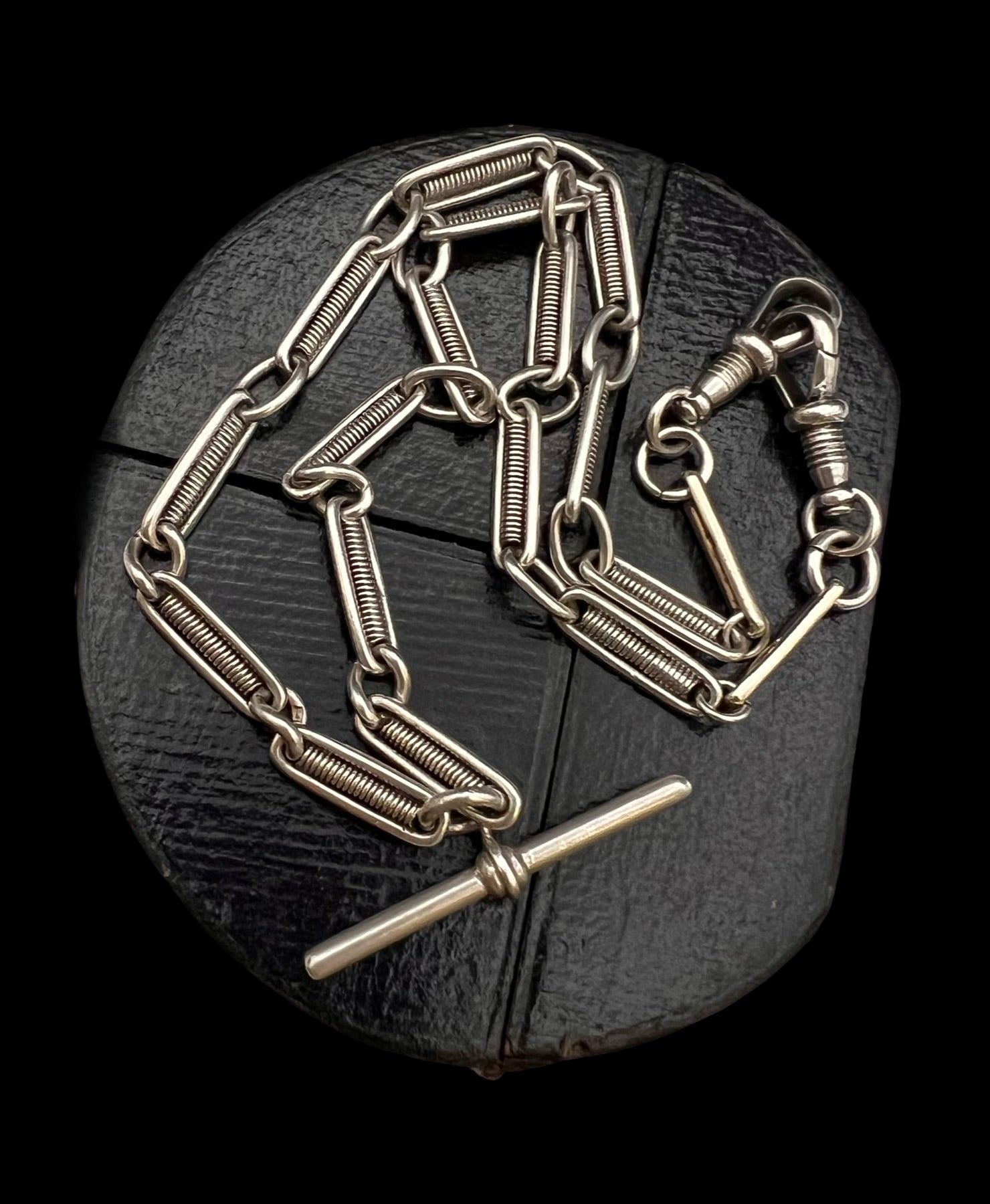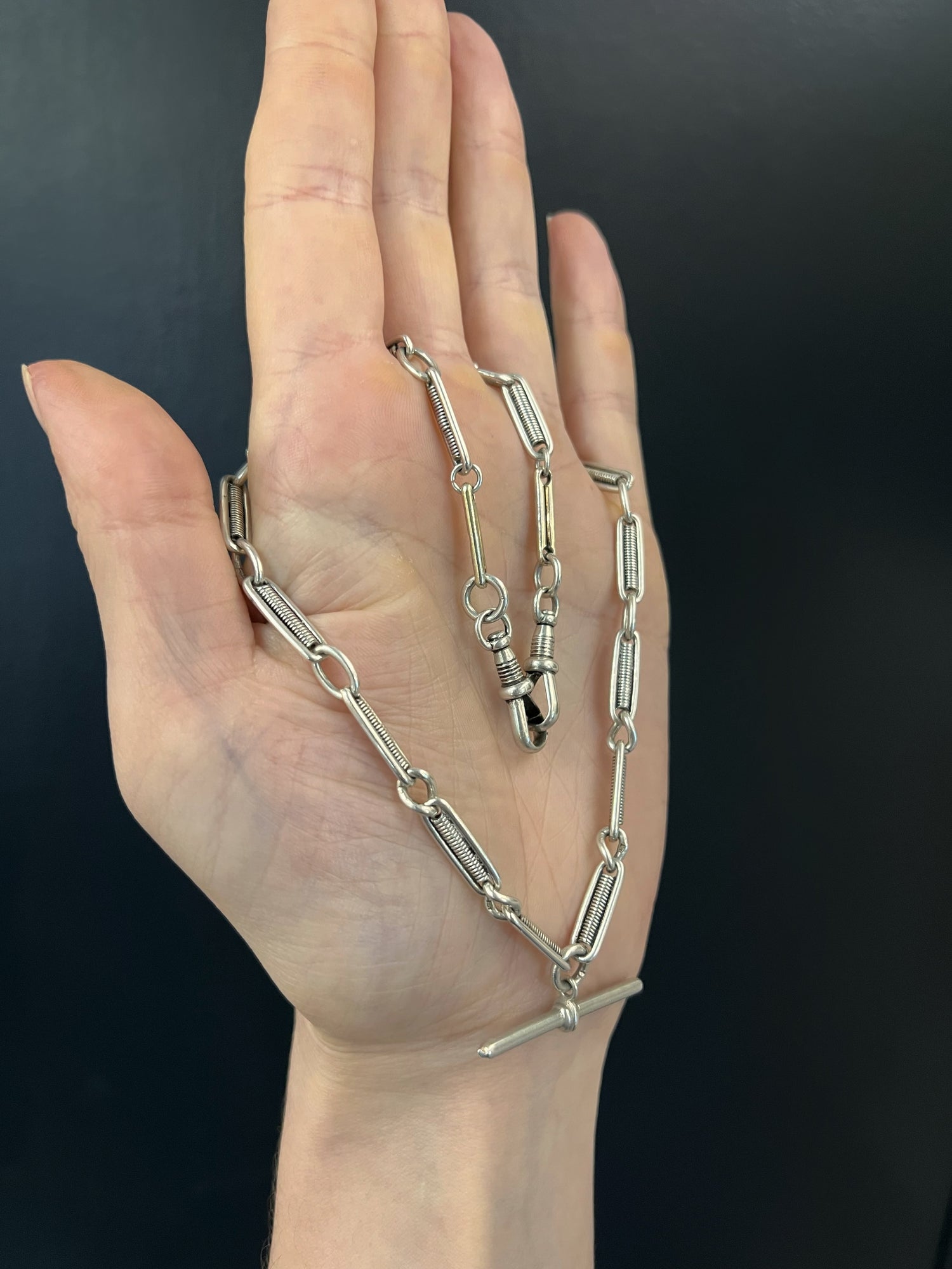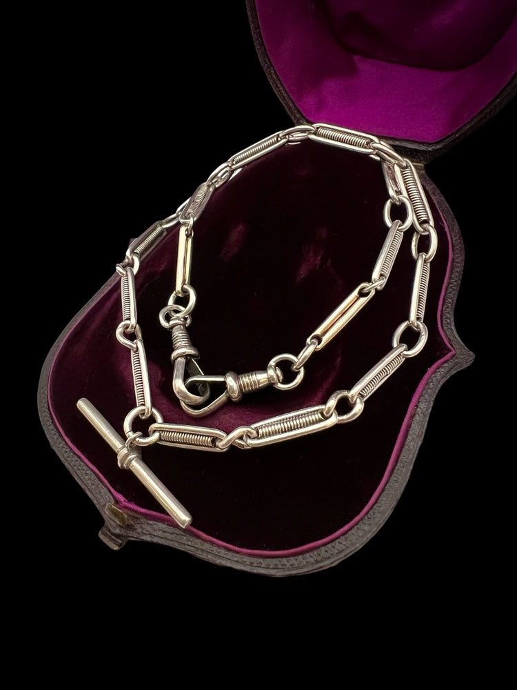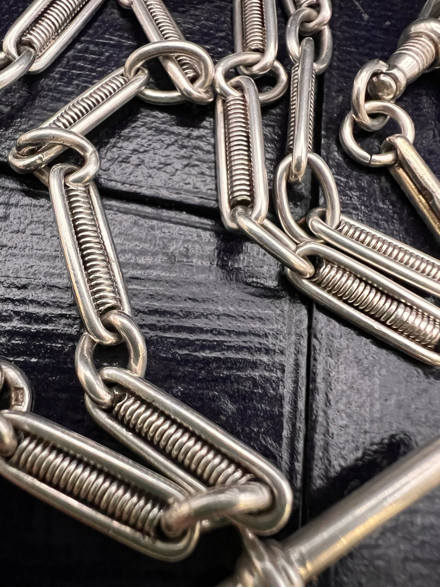 The link is a fancy trombone style with a coiled silver insert in every link!