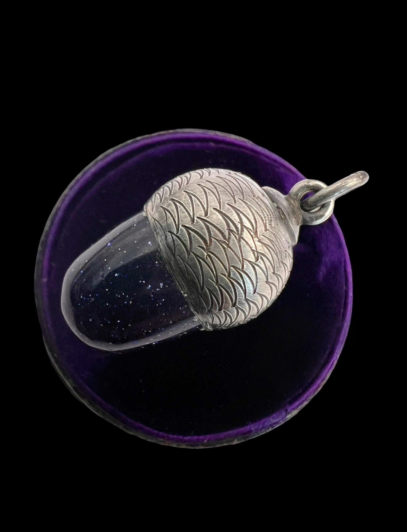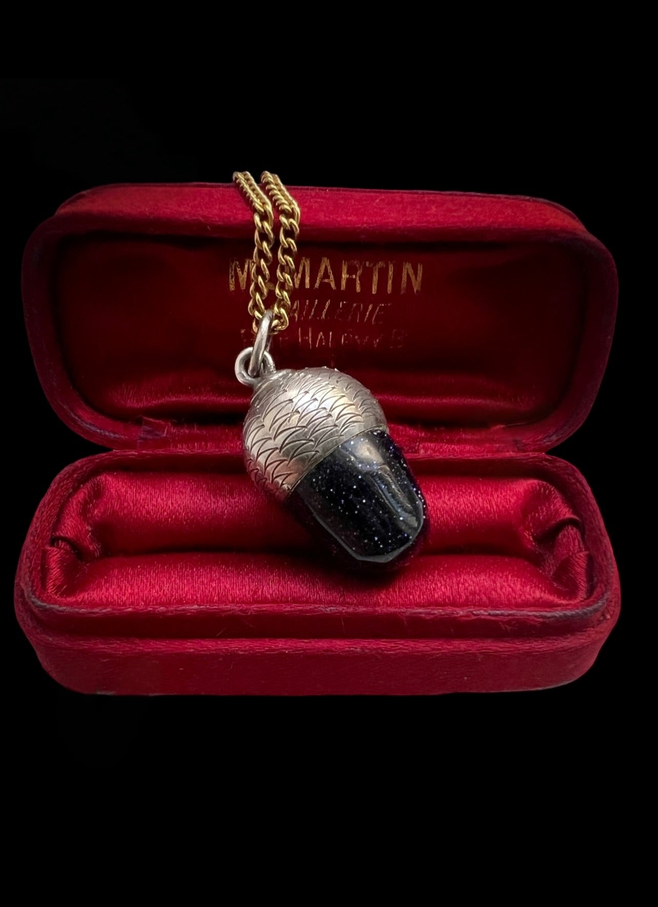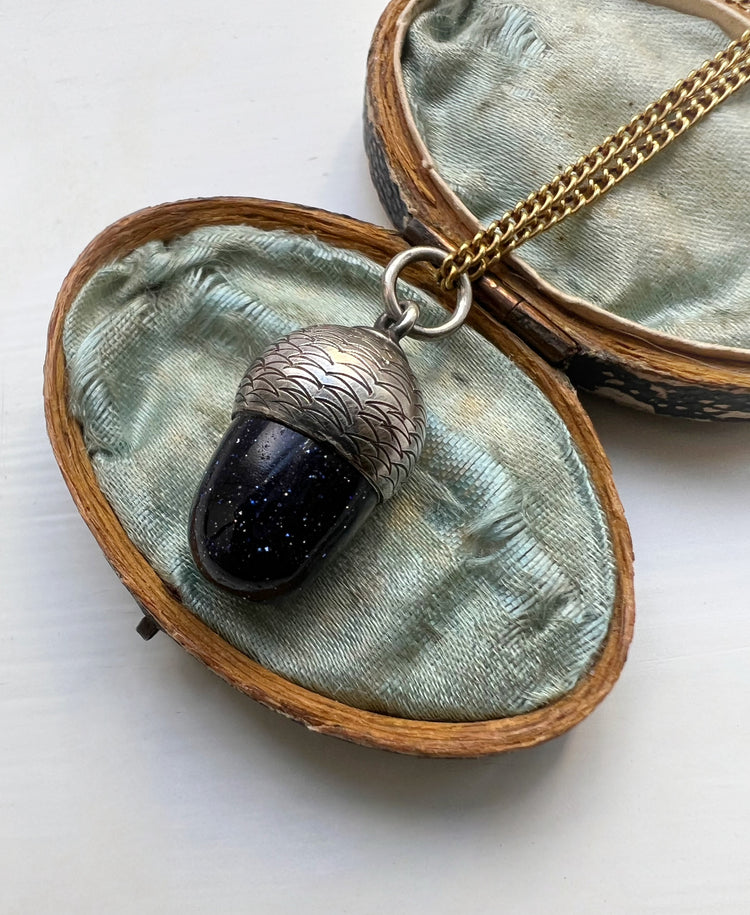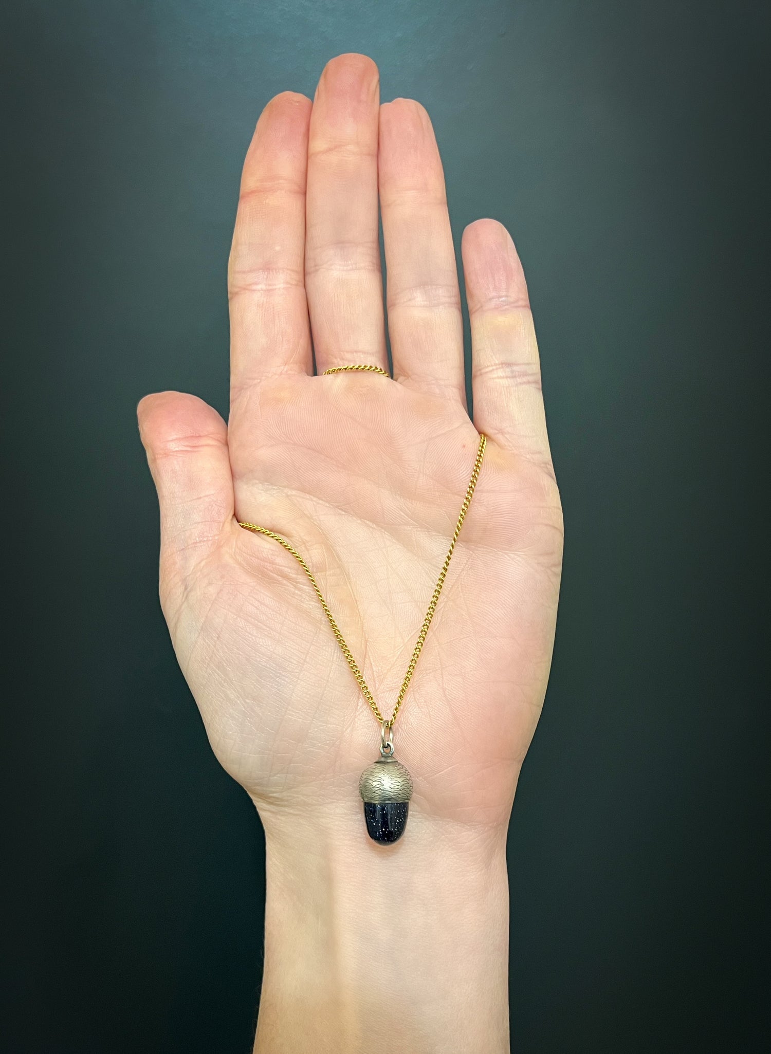 A super sparkly Victorian acorn pendant made of silver and deep blue goldstone.