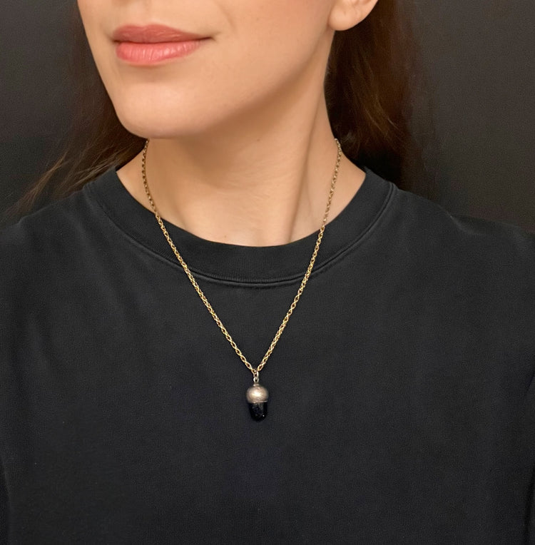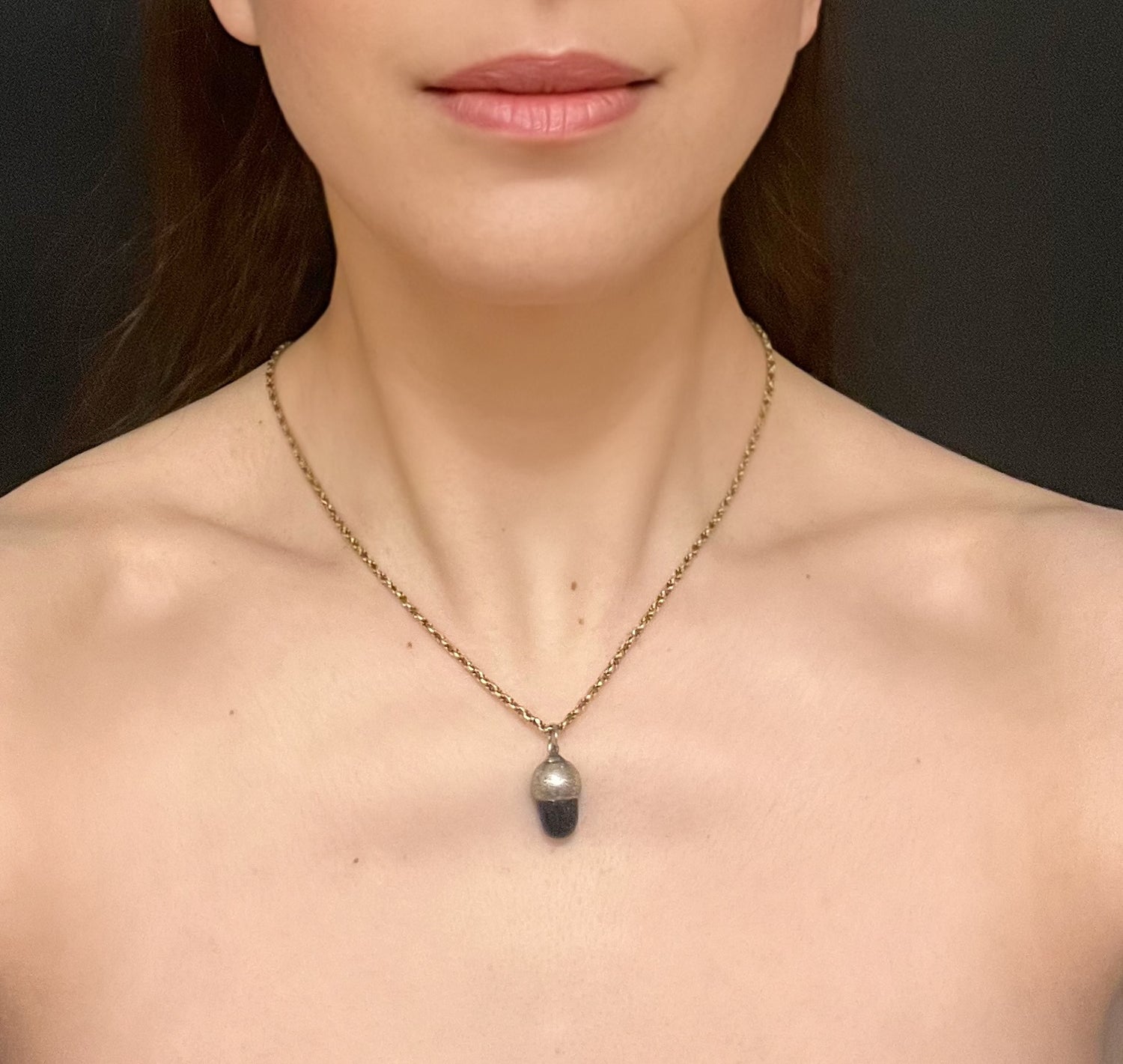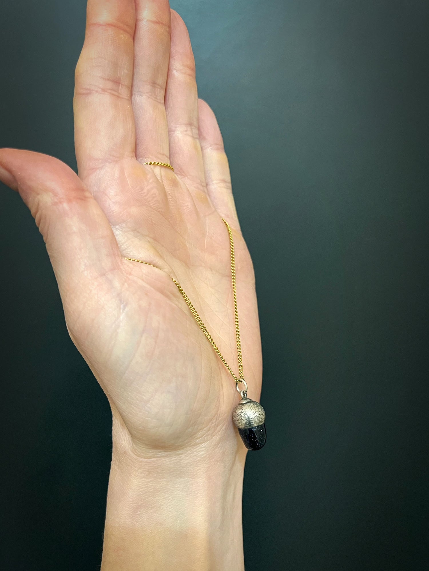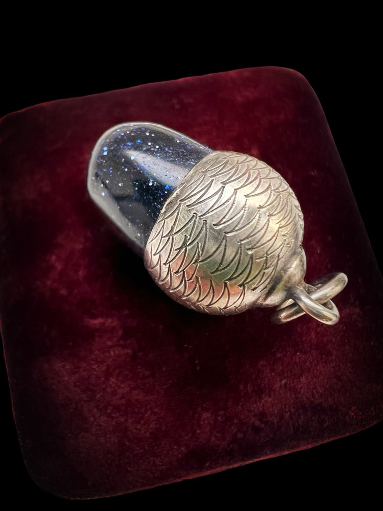A super sparkly Victorian acorn pendant made of silver and deep blue goldstone.