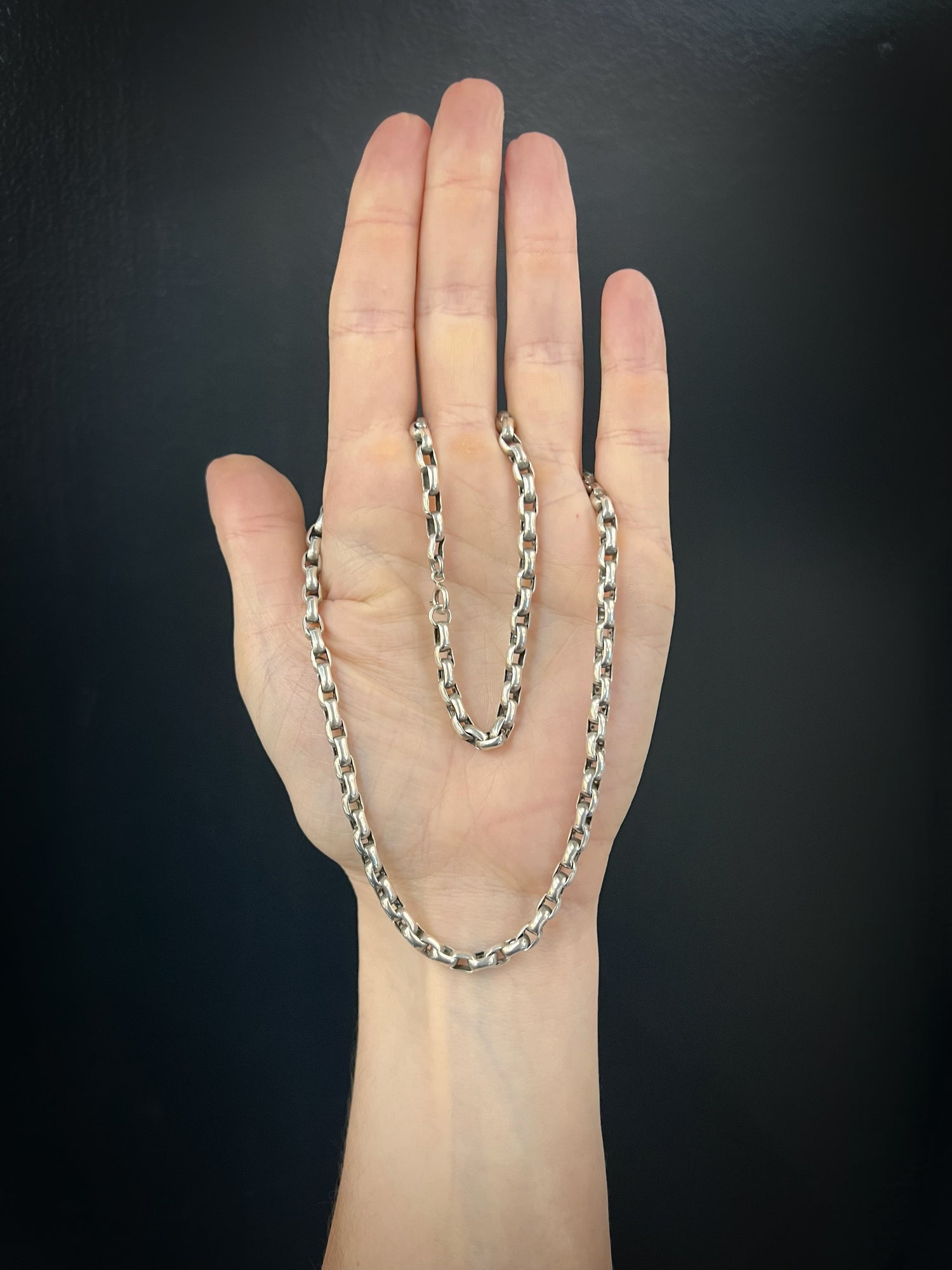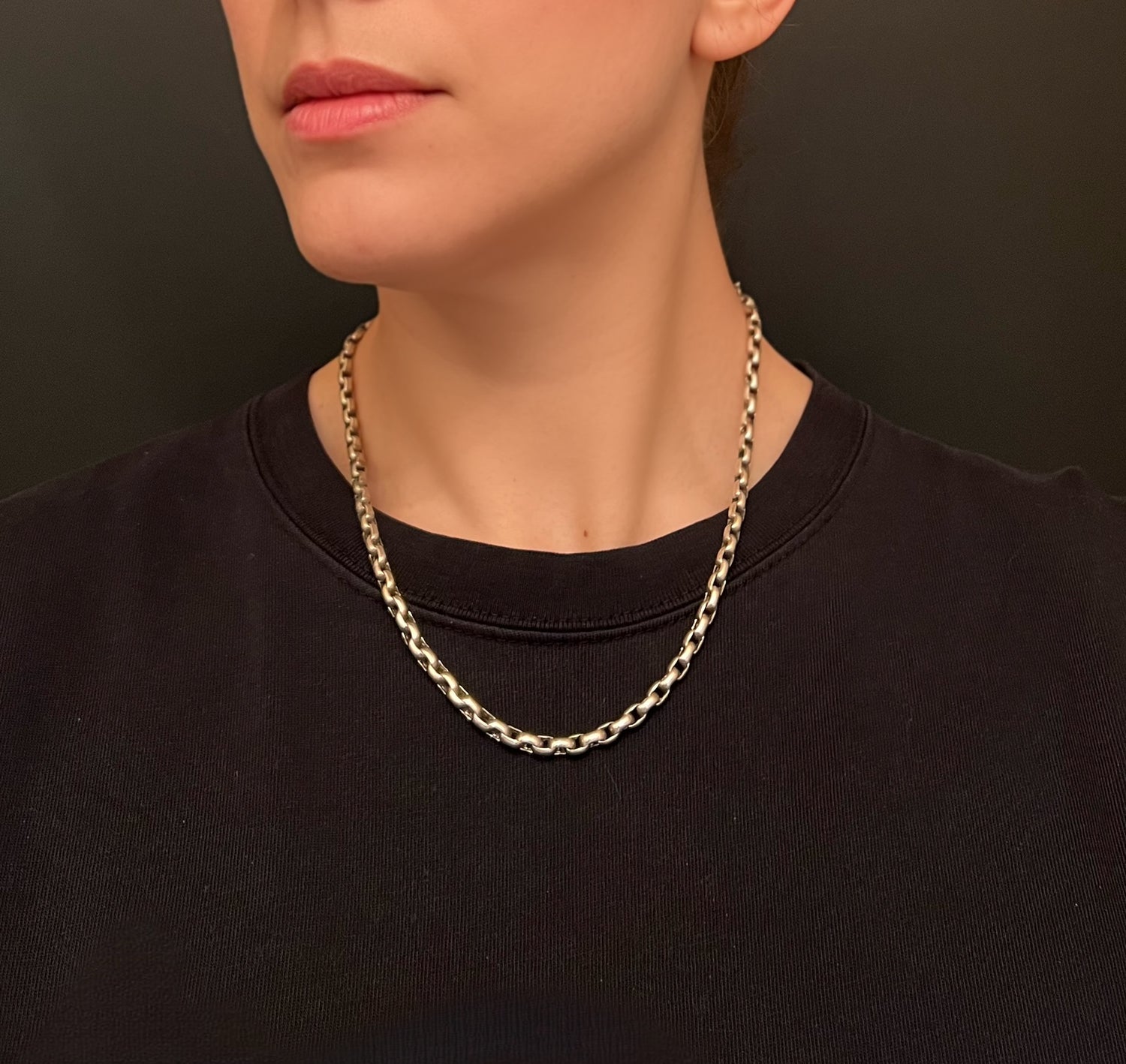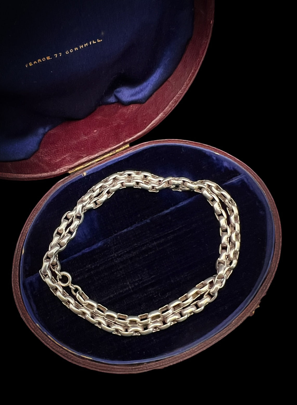 The chain has a ‘flat’ belcher link, which has oval links rather than circular.