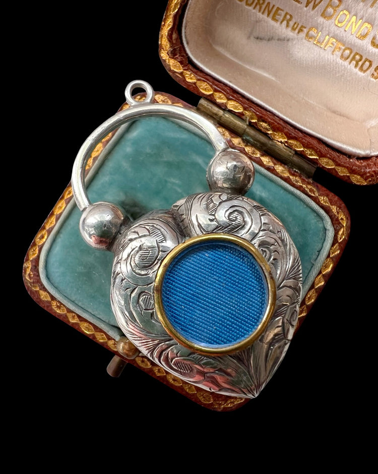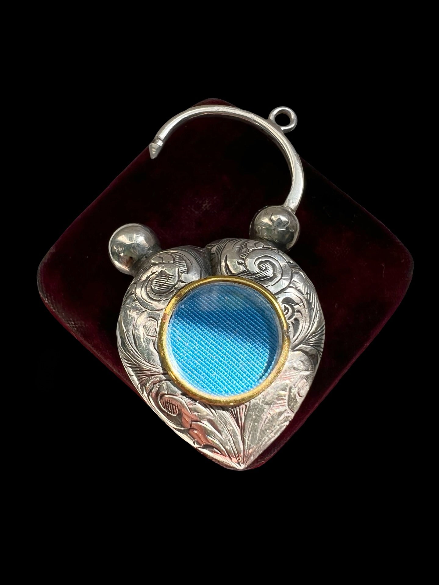 The heart has a circular glass locket on reverse, which has a vibrant turquoise silk lining.