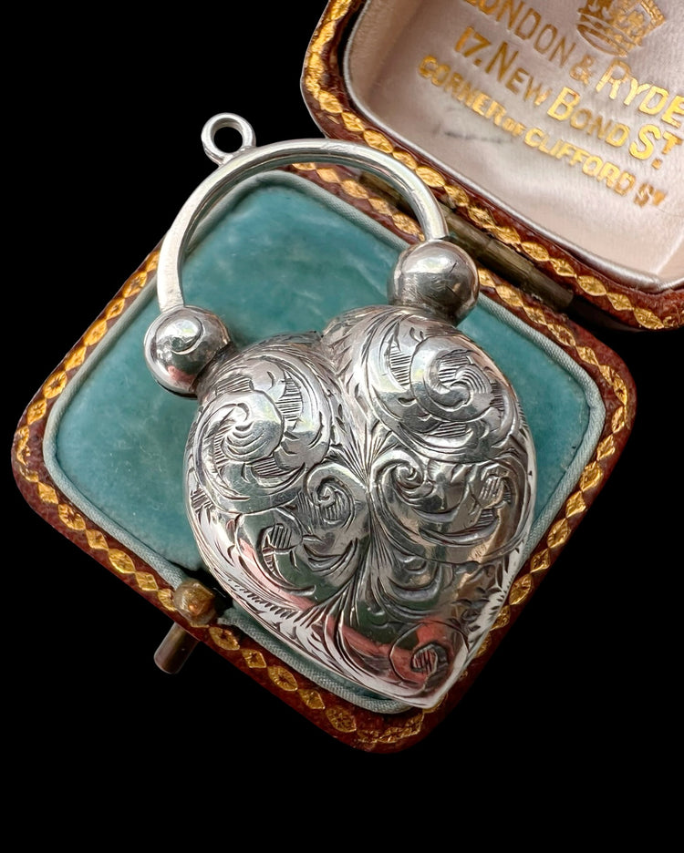 Circa 1880, the padlock has wonderful chasing all over the front and back with a swirling foliate pattern.