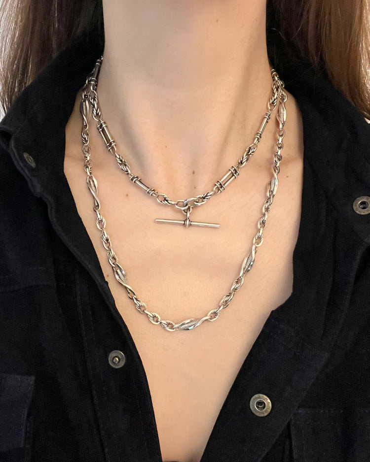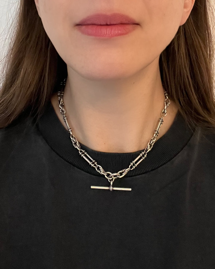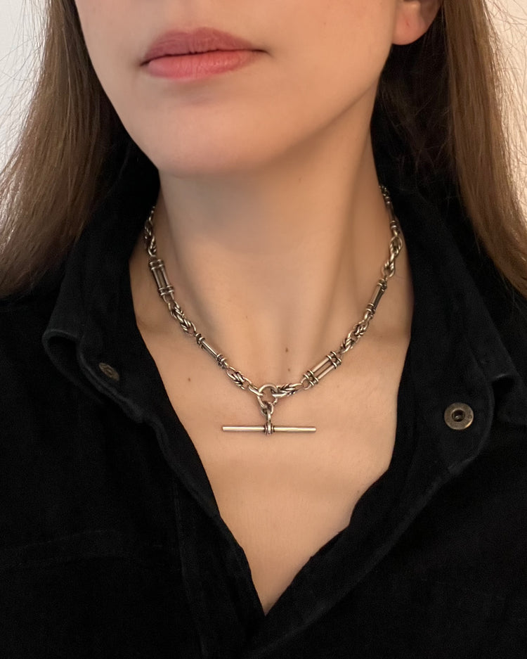 The links are heavily tarnished giving the chain a darker tone, which elevates the design details of the links.